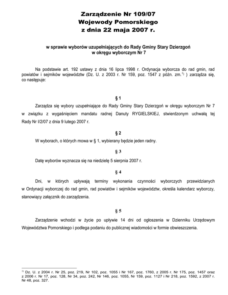 Zarządzenie Nr 109/07 Wojewody Pomorskiego z dnia 22 maja 2007 r. w sprawie wyborów uzupełniających do Rady Gminy Stary Dzierzgoń w okręgu wyborczym Nr 7 Na podstawie art. 192 ustawy z dnia 16 lipca 1998 r. Ordynacja wyborcza do rad gmin, rad powiatów i sejmików województw (Dz. U. z 2003 r. Nr 159, poz. 1547 z późn. zm. 1) ) zarządza się, co następuje: §1 Zarządza się wybory uzupełniające do Rady Gminy Stary Dzierzgoń w okręgu wyborczym Nr 7 w związku z wygaśnięciem mandatu radnej Danuty RYGIELSKIEJ, stwierdzonym uchwałą tej Rady Nr I/2/07 z dnia 9 lutego 2007 r. §2 W wyborach, o których mowa w § 1, wybierany będzie jeden radny. §3 Datę wyborów wyznacza się na niedzielę 5 sierpnia 2007 r. §4 Dni, w których upływają terminy wykonania czynności wyborczych przewidzianych w Ordynacji wyborczej do rad gmin, rad powiatów i sejmików województw, określa kalendarz wyborczy, stanowiący załącznik do zarządzenia. §5 Zarządzenie wchodzi w życie po upływie 14 dni od ogłoszenia w Dzienniku Urzędowym Województwa Pomorskiego i podlega podaniu do publicznej wiadomości w formie obwieszczenia. 1) Dz. U. z 2004 r. Nr 25, poz. 219, Nr 102, poz. 1055 i Nr 167, poz. 1760, z 2005 r. Nr 175, poz. 1457 oraz z 2006 r. Nr 17, poz. 128, Nr 34, poz. 242, Nr 146, poz. 1055, Nr 159, poz. 1127 i Nr 218, poz. 1592, z 2007 r. Nr 48, poz. 327. Załącznik do zarządzenia Nr 109/07 Wojewody Pomorskiego z dnia 22 maja 2007 r. KALENDARZ WYBORCZY Termin wykonania czynności wyborczej do 16 czerwca 2007 r. Treść czynności podanie do publicznej wiadomości w formie obwieszczenia Wójta Gminy Stary Dzierzgoń informacji o granicach okręgu wyborczego i liczbie radnych wybieranych w okręgu Nr 7 oraz o siedzibie Gminnej Komisji Wyborczej, zawiadomienie Komisarza Wyborczego o utworzeniu komitetu wyborczego oraz o zamiarze zgłaszania kandydatów na radnego. do 21 czerwca 2007 r. powołanie przez Komisarza Wyborczego Gminnej Komisji Wyborczej dla przeprowadzenia wyborów uzupełniających w okręgu wyborczym Nr 7. do 6 lipca 2007 r. do godz. 24.00 do 15 lipca 2007 r. zgłaszanie Gminnej Komisji Wyborczej list kandydatów na radnego wybieranego w okręgu wyborczym. powołanie przez Gminną Komisję Wyborczą Obwodowej Komisji Wyborczej na czas przeprowadzenia wyborów uzupełniających, podanie do publicznej wiadomości w formie obwieszczenia Wójta Gminy informacji o o siedzibie granicy i numerze obwodu głosowania Obwodowej Komisji Wyborczej powołanej oraz dla przeprowadzenia głosowania w wyborach uzupełniających. do 21 lipca 2007 r. rozplakatowanie obwieszczenia Gminnej Komisji Wyborczej o zarejestrowanych listach kandydatów na radnego wybieranego w wyborach uzupełniających do 22 lipca 2007 r. sporządzenie spisu wyborców. 3 sierpnia 2007 r. o godz. 24.00 4 sierpnia 2007 r. zakończenie kampanii wyborczej. przekazanie Przewodniczącemu Obwodowej Komisji Wyborczej spisu wyborców. 5 sierpnia 2007 r. godz. 6.oo-20.oo głosowanie.