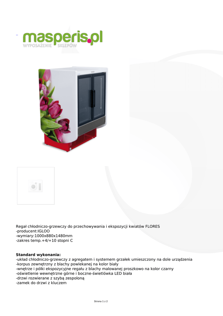 Regał chłodniczo-grzewczy do przechowywania i ekspozycji kwiatów FLORES -producent:IGLOO -wymiary:1000x880x1480mm -zakres temp.+4/+10 stopni C Standard wykonania: -układ chłodniczo-grzewczy z agregatem i systemem grzałek umieszczony na dole urządzenia -korpus zewnętrzny z blachy powlekanej na kolor biały -wnętrze i pólki ekspozycyjne regału z blachy malowanej proszkowo na kolor czarny -oświetlenie wewnętrzne górne i boczne-świetlówka LED biała -drzwi rozwierane z szybą zespoloną -zamek do drzwi z kluczem Strona 1 z 2 -3 poziomy ekspozycyjne z możliwością regulacji wysokości -6 szt.pojemników na kwiaty z blachy malowanej proszkowo na kolor czarny(450x180x150mm) -boki z tworzywa ABS-możliwość wyboru koloru wg wzornika IGLOO -izolacja z ekologicznej pianki poliuretanowej -nóżki służące do wypoziomowania urządzenia -odszranianie automatyczne -automatyczne odparowanie kondensatu -elektroniczny regulator temperatury z cyfrowym wyświetlaczem Opcje wykonania -kolor panelu frontowego-możliwość wyboru koloru wg.wzornika IGLOO -kolor podstawy-możliwość wyboru koloru wg.wzornika IGLOO -świetlówka tradycyjna -elektroniczny rejestrator temp. + oprogramowanie -dodatkowe pojemniki na wodę Strona 2 z 2
