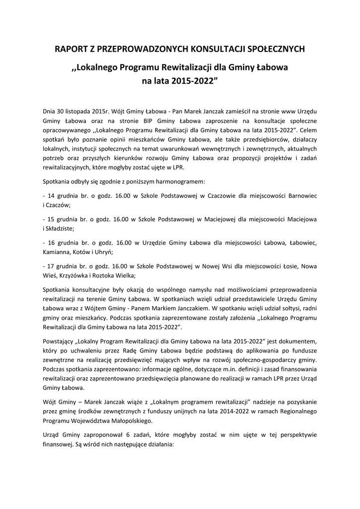 RAPORT Z PRZEPROWADZONYCH KONSULTACJI SPOŁECZNYCH ,,Lokalnego Programu Rewitalizacji dla Gminy Łabowa na lata 2015‐2022” Dnia 30 listopada 2015r. Wójt Gminy Łabowa ‐ Pan Marek Janczak zamieścił na stronie www Urzędu Gminy Łabowa oraz na stronie BIP Gminy Łabowa zaproszenie na konsultacje społeczne opracowywanego ,,Lokalnego Programu Rewitalizacji dla Gminy Łabowa na lata 2015‐2022”. Celem spotkań było poznanie opinii mieszkańców Gminy Łabowa, ale także przedsiębiorców, działaczy lokalnych, instytucji społecznych na temat uwarunkowań wewnętrznych i zewnętrznych, aktualnych potrzeb oraz przyszłych kierunków rozwoju Gminy Łabowa oraz propozycji projektów i zadań rewitalizacyjnych, które mogłyby zostać ujęte w LPR. Spotkania odbyły się zgodnie z poniższym harmonogramem: ‐ 14 grudnia br. o godz. 16.00 w Szkole Podstawowej w Czaczowie dla miejscowości Barnowiec i Czaczów; ‐ 15 grudnia br. o godz. 16.00 w Szkole Podstawowej w Maciejowej dla miejscowości Maciejowa i Składziste; ‐ 16 grudnia br. o godz. 16.00 w Urzędzie Gminy Łabowa dla miejscowości Łabowa, Łabowiec, Kamianna, Kotów i Uhryń; ‐ 17 grudnia br. o godz. 16.00 w Szkole Podstawowej w Nowej Wsi dla miejscowości Łosie, Nowa Wieś, Krzyżówka i Roztoka Wielka; Spotkania konsultacyjne były okazją do wspólnego namysłu nad możliwościami przeprowadzenia rewitalizacji na terenie Gminy Łabowa. W spotkaniach wzięli udział przedstawiciele Urzędu Gminy Łabowa wraz z Wójtem Gminy ‐ Panem Markiem Janczakiem. W spotkaniu wzięli udział sołtysi, radni gminy oraz mieszkańcy. Podczas spotkania zaprezentowane zostały założenia ,,Lokalnego Programu Rewitalizacji dla Gminy Łabowa na lata 2015‐2022”. Powstający „Lokalny Program Rewitalizacji dla Gminy Łabowa na lata 2015‐2022” jest dokumentem, który po uchwaleniu przez Radę Gminy Łabowa będzie podstawą do aplikowania po fundusze zewnętrzne na realizację przedsięwzięć mających wpływ na rozwój społeczno‐gospodarczy gminy. Podczas spotkania zaprezentowano: informacje ogólne, dotyczące m.in. definicji i zasad finansowania rewitalizacji oraz zaprezentowano przedsięwzięcia planowane do realizacji w ramach LPR przez Urząd Gminy Łabowa. Wójt Gminy – Marek Janczak wiąże z „Lokalnym programem rewitalizacji” nadzieje na pozyskanie przez gminę środków zewnętrznych z funduszy unijnych na lata 2014‐2022 w ramach Regionalnego Programu Województwa Małopolskiego. Urząd Gminy zaproponował 6 zadań, które mogłyby zostać w nim ujęte w tej perspektywie finansowej. Są wśród nich następujące działania: 1/ Budowa sieci kanalizacyjnej w miejscowi: Nowa Wieś, Maciejowa i Składziste; 2/ Budowa budynku wielofunkcyjnego w Nowej Wsi; 3/ Budowa centrów rekreacyjno‐ sportowych przy szkołach podstawowych /boiska sportowe, place zabaw, mała architektura/; 4/ Modernizacja centrum wsi Łabowa na cele rekreacyjno‐turystyczne; 5/ Budowa szlaków rowerowych/ wielofunkcyjnych np. Szlak cerkiew; 6/ Modernizacja infrastruktury drogowej wraz z poprawą bezpieczeństwa na drogach gminnych; W trakcie zorganizowanych konsultacji zgromadzeni przedstawiciele społeczności lokalnej proponowali przedsięwzięcia jakie zdaniem Uczestników powinny być ujęte w LPR dla Gminy Łabowa: Sołectwo Barnowiec i Czaczów /spotkanie 14.12.2015r./: ‐ modernizacja drogi powiatowej Maciejowa‐Czaczów‐Barnowiec ‐ remont pokrycia dachowego kościoła, ‐ modernizacja świetlicy w Barnowcu /boisko, plac zabaw, dostosowanie dla dzieci niepełnosprawnych/ ‐ modernizacja oświetlenia ulicznego w obu sołectwach, ‐ modernizacja dróg gminnych na terenie sołectw, ‐ regulacja rzeki wzdłuż drogi na Barnowiec, ‐ modernizacja sieci teleinformatycznej, ‐ rozbudowa infrastruktury sportowej – budowa boiska wielofunkcyjnego, placu zabaw, ‐ budowa sieci kanalizacyjnej, ‐ budowa sieci wodociągowej, ‐ modernizacja Remizy OSP w Czaczowie, wykorzystanie Remizy na potrzeby Koła gospodyń wiejskich, Sołectwo Maciejowa i Składziste /spotkanie 15.12.2015r./: ‐ modernizacja drogi powiatowej Maciejowa‐Składziste ‐ budowa chodnika wzdłuż drogi krajowej nr 75, ‐ rozbudowa infrastruktury sportowej przy Szkole w Maciejowej – budowa boiska wielofunkcyjnego, placu zabaw, ogrodzenie; ‐ budowa drewnianej wieży widokowej przy schronisku na Hali Łabowskiej, wytyczenie szlaków, kamerki on‐line, ‐ rozbudowa sieci telefonicznej na Składziste, ‐ budowa instalacji solarnych w gospodarstwach domowych, ‐ modernizacja i rozbudowa oświetlenia ulicznego na terenie sołectwa, ‐ melioracja potoku, ‐ budowa sieci wodociągowej Maciejowa, ‐ budowa sieci kanalizacyjnej na terenie sołectw, ‐ modernizacja dróg gminnych na terenie sołectw, Sołectwo Łabowa, Łabowiec, Uhryń, Kotów, Kamianna /spotkanie 16.12.2015r./: Łabowa ‐ rozbudowa sieci kanalizacyjnej, ‐ budowa sieci wodociągowej, ‐ budowa centrum sportowo‐rekreacyjnego (amfiteatr, ścieżki spacerowe, ścianka wspinaczkowa, place zabaw) w Łabowej, ‐ modernizacja i rozbudowa oświetlenia ulicznego, ‐ Modernizacja dróg gminnych na terenie sołectwa wraz z zabezpieczeniem osuwisk i brzegów, ‐ budowa chodnika wzdłuż drogi krajowej Nr 75, Łabowiec ‐ budowa świetlicy wiejskiej, ‐ Poprawa ciągów komunikacyjnych poprzez modernizację dróg w zakresie nawierzchni asfaltowych, betonowych, ‐ budowa basenu odkrytego we wsi Łabowiec, Kotów ‐ budowa sieci kanalizacyjnej, ‐ modernizacja dróg gminnych, ‐ modernizacja oświetlenia ulicznego, ‐ dostosowanie budynku oświatowego na potrzeby świetlicy wiejskiej wraz z budową placu zabaw, Kamianna ‐ budowa placu zabaw, ‐ modernizacja dróg gminnych, Uhryń ‐ budowa przydomowych oczyszczalni ścieków, ‐ zabezpieczenie brzegów przy drodze gminnej Łabowa‐Uhryń, ‐ budowa przystani rekreacyjnych na wolnym powietrzu, Sołectwo Nowa Wieś, Krzyżówka,