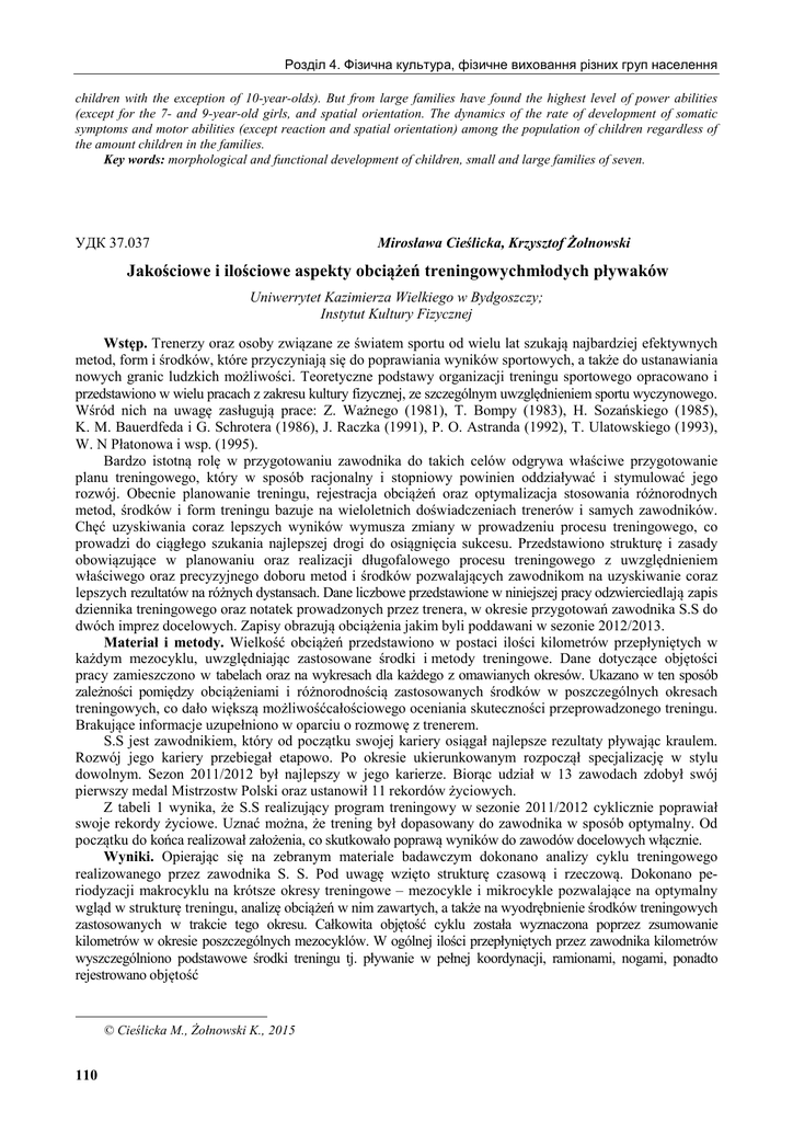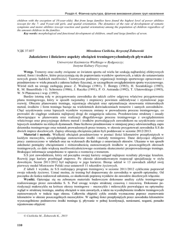 Розділ 4. Фізична культура, фізичне виховання різних груп населення children with the exception of 10-year-olds). But from large families have found the highest level of power abilities (except for the 7- and 9-year-old girls, and spatial orientation. The dynamics of the rate of development of somatic symptoms and motor abilities (except reaction and spatial orientation) among the population of children regardless of the amount children in the families. Key words: morphological and functional development of children, small and large families of seven. УДК 37.037 Mirosława Cieślicka, Krzysztof Żołnowski Jakościowe i ilościowe aspekty obciążeń treningowychmłodych pływaków Uniwerrytet Kazimierza Wielkiego w Bydgoszczy; Instytut Kultury Fizycznej Wstęp. Trenerzy oraz osoby związane ze światem sportu od wielu lat szukają najbardziej efektywnych metod, form i środków, które przyczyniają się do poprawiania wyników sportowych, a także do ustanawiania nowych granic ludzkich możliwości. Teoretyczne podstawy organizacji treningu sportowego opracowano i przedstawiono w wielu pracach z zakresu kultury fizycznej, ze szczególnym uwzględnieniem sportu wyczynowego. Wśród nich na uwagę zasługują prace: Z. Ważnego (1981), T. Bompy (1983), H. Sozańskiego (1985), K. M. Bauerdfeda i G. Schrotera (1986), J. Raczka (1991), P. O. Astranda (1992), T. Ulatowskiego (1993), W. N Płatonowa i wsp. (1995). Bardzo istotną rolę w przygotowaniu zawodnika do takich celów odgrywa właściwe przygotowanie planu treningowego, który w sposób racjonalny i stopniowy powinien oddziaływać i stymulować jego rozwój. Obecnie planowanie treningu, rejestracja obciążeń oraz optymalizacja stosowania różnorodnych metod, środków i form treningu bazuje na wieloletnich doświadczeniach trenerów i samych zawodników. Chęć uzyskiwania coraz lepszych wyników wymusza zmiany w prowadzeniu procesu treningowego, co prowadzi do ciągłego szukania najlepszej drogi do osiągnięcia sukcesu. Przedstawiono strukturę i zasady obowiązujące w planowaniu oraz realizacji długofalowego procesu treningowego z uwzględnieniem właściwego oraz precyzyjnego doboru metod i środków pozwalających zawodnikom na uzyskiwanie coraz lepszych rezultatów na różnych dystansach. Dane liczbowe przedstawione w niniejszej pracy odzwierciedlają zapis dziennika treningowego oraz notatek prowadzonych przez trenera, w okresie przygotowań zawodnika S.S do dwóch imprez docelowych. Zapisy obrazują obciążenia jakim byli poddawani w sezonie 2012/2013. Materiał i metody. Wielkość obciążeń przedstawiono w postaci ilości kilometrów przepłyniętych w każdym mezocyklu, uwzględniając zastosowane środki i metody treningowe. Dane dotyczące objętości pracy zamieszczono w tabelach oraz na wykresach dla każdego z omawianych okresów. Ukazano w ten sposób zależności pomiędzy obciążeniami i różnorodnością zastosowanych środków w poszczególnych okresach treningowych, co dało większą możliwośćcałościowego oceniania skuteczności przeprowadzonego treningu. Brakujące informacje uzupełniono w oparciu o rozmowę z trenerem. S.S jest zawodnikiem, który od początku swojej kariery osiągał najlepsze rezultaty pływając kraulem. Rozwój jego kariery przebiegał etapowo. Po okresie ukierunkowanym rozpoczął specjalizację w stylu dowolnym. Sezon 2011/2012 był najlepszy w jego karierze. Biorąc udział w 13 zawodach zdobył swój pierwszy medal Mistrzostw Polski oraz ustanowił 11 rekordów życiowych. Z tabeli 1 wynika, że S.S realizujący program treningowy w sezonie 2011/2012 cyklicznie poprawiał swoje rekordy życiowe. Uznać można, że trening był dopasowany do zawodnika w sposób optymalny. Od początku do końca realizował założenia, co skutkowało poprawą wyników do zawodów docelowych włącznie. Wyniki. Opierając się na zebranym materiale badawczym dokonano analizy cyklu treningowego realizowanego przez zawodnika S. S. Pod uwagę wzięto strukturę czasową i rzeczową. Dokonano periodyzacji makrocyklu na krótsze okresy treningowe – mezocykle i mikrocykle pozwalające na optymalny wgląd w strukturę treningu, analizę obciążeń w nim zawartych, a także na wyodrębnienie środków treningowych zastosowanych w trakcie tego okresu. Całkowita objętość cyklu została wyznaczona poprzez zsumowanie kilometrów w okresie poszczególnych mezocyklów. W ogólnej ilości przepłyniętych przez zawodnika kilometrów wyszczególniono podstawowe środki treningu tj. pływanie w pełnej koordynacji, ramionami, nogami, ponadto rejestrowano objętość © Cieślicka M., Żołnowski K., 2015 110 Молодіжний науковий вісник (2015)… Tabela 1 Rekordy życiowe S.S. uzyskanych przed sezonem 2012/2013 Konkurencja Progresja wyniku 50 m stylem dowolnym 100 m stylem dowolnym 200 m stylem dowolnym 400 m stylem dowolnym 800 m stylem dowolnym Data uzyskania wyniku 26,15 18.07.2012 r. 26,69 22.07.2011 r. 26,74 19.05.2011 r. 56,99 6.06.2010 r. 1:56,07 18.07.2012 r. 1:56,88 13.05.2012 r. 1:57,04 22.07.2011 r. 1:57,52 22.07.2011 r. 4:03.51 19.07.2012 r. 4:04,54 14.05.2012 r. 4.02,35 23.07.2011 r. 4:03,95 21.05.2011 r. 8:21,64 15.05.2012 r. pochodzącą z pozostałych środków wykorzystywanych w treningu. Pozwoliło to określić korelację kolejnych mikrocyklów, a także zmiany w nich zachodzące. Z całorocznej objętości treningu wyodrębniono dwa okresy Bezpośredniego Przygotowania Startowego (BPS). Każdy z nich składał się z trzech podokresów: akumulacji, intensyfikacji i transformacji. Pomiędzy nimi występowały okresy przygotowawcze i przejściowe. Struktura czasowa badanego procesu treningowego była podstawą do przeprowadzania analiz opartych na porównaniu wielkości obciążeń treningowych zrealizowanych w poszczególnych okresach rocznego cyklu treningowego obejmującego dwa makrocykle. Aby