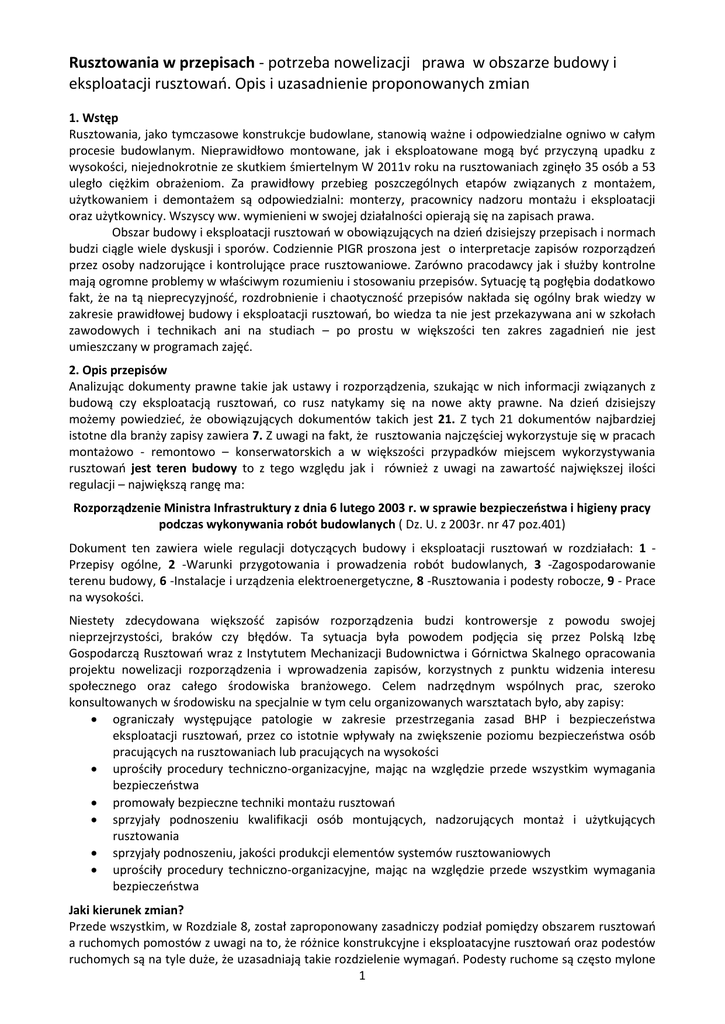 Rusztowania w przepisach - potrzeba nowelizacji prawa w obszarze budowy i eksploatacji rusztowań. Opis i uzasadnienie proponowanych zmian 1. Wstęp Rusztowania, jako tymczasowe konstrukcje budowlane, stanowią ważne i odpowiedzialne ogniwo w całym procesie budowlanym. Nieprawidłowo montowane, jak i eksploatowane mogą być przyczyną upadku z wysokości, niejednokrotnie ze skutkiem śmiertelnym W 2011v roku na rusztowaniach zginęło 35 osób a 53 uległo ciężkim obrażeniom. Za prawidłowy przebieg poszczególnych etapów związanych z montażem, użytkowaniem i demontażem są odpowiedzialni: monterzy, pracownicy nadzoru montażu i eksploatacji oraz użytkownicy. Wszyscy ww. wymienieni w swojej działalności opierają się na zapisach prawa. Obszar budowy i eksploatacji rusztowań w obowiązujących na dzień dzisiejszy przepisach i normach budzi ciągle wiele dyskusji i sporów. Codziennie PIGR proszona jest o interpretacje zapisów rozporządzeń przez osoby nadzorujące i kontrolujące prace rusztowaniowe. Zarówno pracodawcy jak i służby kontrolne mają ogromne problemy w właściwym rozumieniu i stosowaniu przepisów. Sytuację tą pogłębia dodatkowo fakt, że na tą nieprecyzyjność, rozdrobnienie i chaotyczność przepisów nakłada się ogólny brak wiedzy w zakresie prawidłowej budowy i eksploatacji rusztowań, bo wiedza ta nie jest przekazywana ani w szkołach zawodowych i technikach ani na studiach – po prostu w większości ten zakres zagadnień nie jest umieszczany w programach zajęć. 2. Opis przepisów Analizując dokumenty prawne takie jak ustawy i rozporządzenia, szukając w nich informacji związanych z budową czy eksploatacją rusztowań, co rusz natykamy się na nowe akty prawne. Na dzień dzisiejszy możemy powiedzieć, że obowiązujących dokumentów takich jest 21. Z tych 21 dokumentów najbardziej istotne dla branży zapisy zawiera 7. Z uwagi na fakt, że rusztowania najczęściej wykorzystuje się w pracach montażowo - remontowo – konserwatorskich a w większości przypadków miejscem wykorzystywania rusztowań jest teren budowy to z tego względu jak i również z uwagi na zawartość największej ilości regulacji – największą rangę ma: Rozporządzenie Ministra Infrastruktury z dnia 6 lutego 2003 r. w sprawie bezpieczeństwa i higieny pracy podczas wykonywania robót budowlanych ( Dz. U. z 2003r. nr 47 poz.401) Dokument ten zawiera wiele regulacji dotyczących budowy i eksploatacji rusztowań w rozdziałach: 1 Przepisy ogólne, 2 -Warunki przygotowania i prowadzenia robót budowlanych, 3 -Zagospodarowanie terenu budowy, 6 -Instalacje i urządzenia elektroenergetyczne, 8 -Rusztowania i podesty robocze, 9 - Prace na wysokości. Niestety zdecydowana większość zapisów rozporządzenia budzi kontrowersje z powodu swojej nieprzejrzystości, braków czy błędów. Ta sytuacja była powodem podjęcia się przez Polską Izbę Gospodarczą Rusztowań wraz z Instytutem Mechanizacji Budownictwa i Górnictwa Skalnego opracowania projektu nowelizacji rozporządzenia i wprowadzenia zapisów, korzystnych z punktu widzenia interesu społecznego oraz całego środowiska branżowego. Celem nadrzędnym wspólnych prac, szeroko konsultowanych w środowisku na specjalnie w tym celu organizowanych warsztatach było, aby zapisy: ograniczały występujące patologie w zakresie przestrzegania zasad BHP i bezpieczeństwa eksploatacji rusztowań, przez co istotnie wpływały na zwiększenie poziomu bezpieczeństwa osób pracujących na rusztowaniach lub pracujących na wysokości uprościły procedury techniczno-organizacyjne, mając na względzie przede wszystkim wymagania bezpieczeństwa promowały bezpieczne techniki montażu rusztowań sprzyjały podnoszeniu kwalifikacji osób montujących, nadzorujących montaż i użytkujących rusztowania sprzyjały podnoszeniu, jakości produkcji elementów systemów rusztowaniowych uprościły procedury techniczno-organizacyjne, mając na względzie przede wszystkim wymagania bezpieczeństwa Jaki kierunek zmian? Przede wszystkim, w Rozdziale 8, został zaproponowany zasadniczy podział pomiędzy obszarem rusztowań a ruchomych pomostów z uwagi na to, że różnice konstrukcyjne i eksploatacyjne rusztowań oraz podestów ruchomych są na tyle duże, że uzasadniają takie rozdzielenie wymagań. Podesty ruchome są często mylone 1 z rusztowaniami jezdnymi kolumnowymi, wprowadzono, więc w związku z tym definicję „podestu ruchomego”. Generalnie za fundament projektowanych zmian przyjęto poszerzenie katalogu podstawowych definicji z 3 na 12. Konieczność precyzyjnego zdefiniowania podstawowych pojęć wynika z wieloletniego doświadczenia, bowiem jasne kryteria odniesienia pozwalają jednoznacznie określać zakres obowiązywania przepisów. Dlatego wprowadzono wiele nowych definicji poczynając od podstawowej, – czym jest w ogóle „rusztowanie” poprzez definicje rusztowania „podporowego”, „przestawnego” czy „jezdnego” i „typu dziennego” popularnego nie tylko na budowach, ale i poza budownictwem. Wprowadzono definicję „nadzoru technicznego” oraz definicję „osoby kompetentnej” Ma to uporządkować obszar kompetencji nadzoru i dopuszczania do eksploatacji rusztowań oraz je zróżnicować w zależności od stopnia skomplikowania konstrukcji, miejsca jej ustawienia oraz potencjalnych zagrożeń. Za konieczne uznano zdefiniowanie pojęcia „projektu rusztowania”, aby ułatwić wyegzekwowanie przez służby kontrolne dokumentów potwierdzających bezpieczeństwo konstrukcji rusztowania. W projekcie dobitnie podkreśla się rangę certyfikatu bezpieczeństwa rusztowania nadając mu większą niż do tej pory moc prawną. Wprowadzono obowiązek stosowania rusztowań ochronnych. Przy formułowaniu wymagań w tym zakresie skorzystano z uregulowań obowiązujących w innych krajach. Warto przypomnieć, że takie wymagania były ujęte już w rozporządzeniu dotyczącym bezpieczeństwa