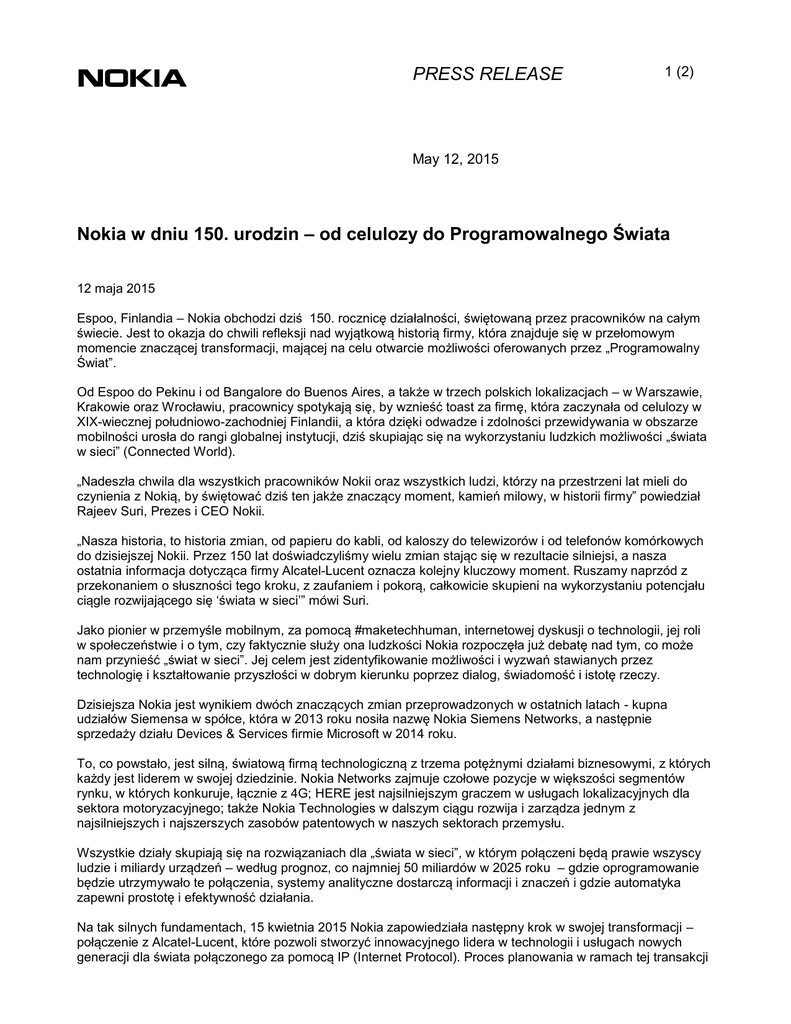 PRESS RELEASE 1 (2) May 12, 2015 Nokia w dniu 150. urodzin – od celulozy do Programowalnego Świata 12 maja 2015 Espoo, Finlandia – Nokia obchodzi dziś 150. rocznicę działalności, świętowaną przez pracowników na całym świecie. Jest to okazja do chwili refleksji nad wyjątkową historią firmy, która znajduje się w przełomowym momencie znaczącej transformacji, mającej na celu otwarcie możliwości oferowanych przez „Programowalny Świat”. Od Espoo do Pekinu i od Bangalore do Buenos Aires, a także w trzech polskich lokalizacjach – w Warszawie, Krakowie oraz Wrocławiu, pracownicy spotykają się, by wznieść toast za firmę, która zaczynała od celulozy w XIX-wiecznej południowo-zachodniej Finlandii, a która dzięki odwadze i zdolności przewidywania w obszarze mobilności urosła do rangi globalnej instytucji, dziś skupiając się na wykorzystaniu ludzkich możliwości „świata w sieci” (Connected World). „Nadeszła chwila dla wszystkich pracowników Nokii oraz wszystkich ludzi, którzy na przestrzeni lat mieli do czynienia z Nokią, by świętować dziś ten jakże znaczący moment, kamień milowy, w historii firmy” powiedział Rajeev Suri, Prezes i CEO Nokii. „Nasza historia, to historia zmian, od papieru do kabli, od kaloszy do telewizorów i od telefonów komórkowych do dzisiejszej Nokii. Przez 150 lat doświadczyliśmy wielu zmian stając się w rezultacie silniejsi, a nasza ostatnia informacja dotycząca firmy Alcatel-Lucent oznacza kolejny kluczowy moment. Ruszamy naprzód z przekonaniem o słuszności tego kroku, z zaufaniem i pokorą, całkowicie skupieni na wykorzystaniu potencjału ciągle rozwijającego się ‘świata w sieci’” mówi Suri. Jako pionier w przemyśle mobilnym, za pomocą #maketechhuman, internetowej dyskusji o technologii, jej roli w społeczeństwie i o tym, czy faktycznie służy ona ludzkości Nokia rozpoczęła już debatę nad tym, co może nam przynieść „świat w sieci”. Jej celem jest zidentyfikowanie możliwości i wyzwań stawianych przez technologię i kształtowanie przyszłości w dobrym kierunku poprzez dialog, świadomość i istotę rzeczy. Dzisiejsza Nokia jest wynikiem dwóch znaczących zmian przeprowadzonych w ostatnich latach - kupna udziałów Siemensa w spółce, która w 2013 roku nosiła nazwę Nokia Siemens Networks, a następnie sprzedaży działu Devices & Services firmie Microsoft w 2014 roku. To, co powstało, jest silną, światową firmą technologiczną z trzema potężnymi działami biznesowymi, z których każdy jest liderem w swojej dziedzinie. Nokia Networks zajmuje czołowe pozycje w większości segmentów rynku, w których konkuruje, łącznie z 4G; HERE jest najsilniejszym graczem w usługach lokalizacyjnych dla sektora motoryzacyjnego; także Nokia Technologies w dalszym ciągu rozwija i zarządza jednym z najsilniejszych i najszerszych zasobów patentowych w naszych sektorach przemysłu. Wszystkie działy skupiają się na rozwiązaniach dla „świata w sieci”, w którym połączeni będą prawie wszyscy ludzie i miliardy urządzeń – według prognoz, co najmniej 50 miliardów w 2025 roku – gdzie oprogramowanie będzie utrzymywało te połączenia, systemy analityczne dostarczą informacji i znaczeń i gdzie automatyka zapewni prostotę i efektywność działania. Na tak silnych fundamentach, 15 kwietnia 2015 Nokia zapowiedziała następny krok w swojej transformacji – połączenie z Alcatel-Lucent, które pozwoli stworzyć innowacyjnego lidera w technologii i usługach nowych generacji dla świata połączonego za pomocą IP (Internet Protocol). Proces planowania w ramach tej transakcji PRESS RELEASE 2 (2) May 12, 2015 jest już w toku i firma spodziewa się zamknięcia transakcji w pierwszej połowie 2016 roku. Proponowana transakcja podlega aprobacie udziałowców Nokii, przeprowadzeniu odpowiednich konsultacji z przedstawicielami rad pracowniczych, uzyskaniu zgody urzędów regulatorskich oraz innym zwyczajowym warunkom. O Nokii: Nokia inwestuje w technologie umożliwiające komunikowanie się miliardów urządzeń na całym świecie. Działalność firmy skupia się na trzech obszarach biznesowych: oprogramowanie, sprzęt oraz usługi dla infrastruktury sieciowej, które dostarczane są poprzez dział Nokia Networks; inteligentne systemy lokalizacyjne dostarczane przez HERE oraz rozwój zaawansowanych technologii i ich licencjonowanie, którymi zajmuje się dział Nokia Technologies. Każdy z wymienionych działów jest liderem w swojej dziedzinie. http://company.nokia.com Informacje dla mediów: Nokia Communications Tel. +358 (0) 10 448 4900 Email: [email protected] Andrzej Styliński Communications Nokia Networks Tel. +48 660 430 098 E-mail: [email protected]