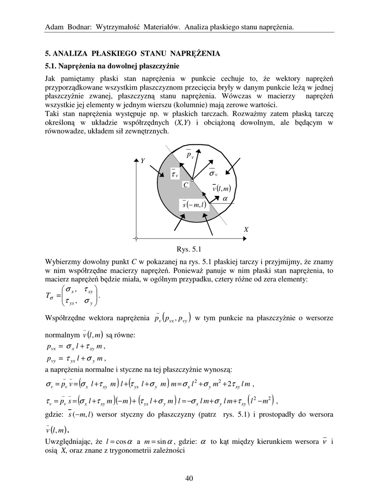 Adam Bodnar: Wytrzymałość Materiałów. Analiza płaskiego stanu naprężenia. 5. ANALIZA PŁASKIEGO STANU NAPRĘŻENIA 5.1. Naprężenia na dowolnej płaszczyźnie Jak pamiętamy płaski stan naprężenia w punkcie cechuje to, że wektory naprężeń przyporządkowane wszystkim płaszczyznom przecięcia bryły w danym punkcie leżą w jednej płaszczyźnie zwanej, płaszczyzną stanu naprężenia. Wówczas w macierzy naprężeń wszystkie jej elementy w jednym wierszu (kolumnie) mają zerowe wartości. Taki stan naprężenia występuje np. w płaskich tarczach. Rozważmy zatem płaską tarczę określoną w układzie współrzędnych (X,Y) i obciążoną dowolnym, ale będącym w równowadze, układem sił zewnętrznych. pv Y σv τv C v (l , m ) s (− m, l ) ( ( α ) ) X Rys. 5.1 Wybierzmy dowolny punkt C w pokazanej na rys. 5.1 płaskiej tarczy i przyjmijmy, że znamy w nim współrzędne macierzy naprężeń. Ponieważ panuje w nim płaski stan naprężenia, to macierz naprężeń będzie miała, w ogólnym przypadku, cztery różne od zera elementy: σ x , τ xy . Tσ = τ , σ yx y _ ( Współrzędne wektora naprężenia pv pvx , pvy ) w tym punkcie na płaszczyźnie o wersorze _ normalnym v (l , m ) są równe: p vx = σ x l + τ xy m , p vy = τ yx l + σ y m , a naprężenia normalne i styczne na tej płaszczyźnie wynoszą: _ _ σ v = pv v = (σ x l +τ xy m ) l + (τ yx l +σ y m ) m = σ x l 2 +σ y m2 + 2τ xy l m , _ _ ( ) τ v = pv s = (σ x l +τ xy m ) (− m ) + (τ yx l + σ y m ) l = −σ x l m + σ y l m +τ xy l 2 − m2 , gdzie: s (− m, l ) wersor styczny do płaszczyzny (patrz rys. 5.1) i prostopadły do wersora _ v (l , m ) . Uwzględniając, że l = cos α a m = sin α , gdzie: α to kąt między kierunkiem wersora ν i osią X, oraz znane z trygonometrii zależności 40 Adam Bodnar: Wytrzymałość Materiałów. Analiza płaskiego stanu naprężenia. cos 2α = cos 2α − sin 2α , sin 2α = 2 sin α cos α , 2 1 + 2 cos α 1 − 2 cos 2α , sin 2α = , 2 2 po przekształceniach otrzymujemy wzory : cos 2α = σv = σ x +σ y τv = − 2 σ x −σ y 2 + σ x −σ y 2 cos 2α + τ xy sin 2α , (5.1) sin 2α + τ xy cos 2α , (5.2) podające wartości naprężeń normalnych i stycznych na płaszczyźnie przekroju, o wersorze normalnym nachylonym pod kątem α do osi X. Dodatnim wartością tych naprężeń _ odpowiadają zwroty zgodne ze zwrotami wersorów v oraz s , gdyż są to miary rzutów _ ( ) wektora naprężenia pv pvx , pvy na osie wyznaczone tymi wersorami. Policzmy ile wynosi suma naprężeń normalnych na dwóch dowolnych ale wzajemnie prostopadłych płaszczyznach przekroju. Korzystając ze wzoru (5.1) otrzymujemy: σ x +σ y σ x −σ y σ v ,α + σ v,α + 90 = + cos 2α + τ xy sin 2α + 2 2 σ x +σ y σ x −σ y + + cos 2 α + 90 0 + τ xy sin 2 α + 90 0 = σ x + σ y 2 2 dowodząc w ten sposób, iż: w płaskim stanie naprężenia suma naprężeń normalnych na dwóch do siebie prostopadłych płaszczyznach jest wielkością stałą lub, inaczej, że suma naprężeń na przekątnej macierzy naprężeń jest niezmiennikiem tzn. nie zmienia swej wartości przy zmianie układu, w którym jest określana. Twierdzenie to odnosi się również do przestrzennego stanu naprężenia. ( ) ( ) 5.2. Ekstremalne naprężenia normalne i styczne Inżyniera analizującego stan naprężenia w danym punkcie interesują przede wszystkim występujące w nim ekstremalne wartości naprężeń normalnych i stycznych. Postawmy więc dwa bardzo ważne zagadnienia do rozwiązania: • na jakiej płaszczyźnie przekroju występują i ile wynoszą ekstremalne naprężenia normalne, • na jakiej płaszczyźnie przekroju występują i ile wynoszą ekstremalne naprężenia styczne. Aby rozwiązać te oba zagadnienia należy wyznaczyć ekstremalne wartości funkcji σ v = σ v (α ) oraz τ v = τ v (α ) . Zaczniemy od naprężeń normalnych. Pochodna funkcji σ v = σ v (α ) przyrównana do zera σ x −σ y dσ v = −2 sin 2α + 2τ xy cos 2α = 0 , dα 2 41 ( Adam Bodnar: Wytrzymałość Materiałów. Analiza płaskiego stanu naprężenia. pokazuje, że na tych płaszczyznach przekroju na których naprężenia normalne są ekstremalne, naprężenia styczne są równe zeru i daje równanie, z którego możemy wyznaczyć − 2τ xy − 2 τ xy 1 + nπ tg 2α = → α = arc tg (5.3) σ y −σ x 2 2 σ y −σ x kąt pod jakim nachylony jest do osi X, wersor normalny płaszczyzny lub płaszczyzn na których występują ekstremalne naprężenia normalne. Zależności (5.3) pokazują, że ekstremalne naprężenia normalne występują na dwóch wzajemnie do siebie prostopadłych płaszczyznach. Płaszczyzny te nazywamy płaszczyznami głównymi a naprężenia normalne na nich naprężeniami głównymi. Kierunki wersorów normalnych do płaszczyzn głównych czyli kierunki naprężeń głównych nazywamy kierunkami głównymi. Zatem: naprężenia główne w danym punkcie to ekstremalne wartości naprężeń normalnych, które w nim występują. Działają one na dwóch do siebie prostopadłych płaszczyznach (płaszczyznach głównych) na których naprężenia styczne są równe zeru. W celu wyznaczenia wartości naprężeń głównych w płaskim stanie naprężenia korzystamy z poniższych wzorów trygonometrycznych: tg 2α sin 2α = ± cos 2α = ± , 1 + tg 2 2α 1 1 + tg 2 2α , które wstawiamy do równania (5.1): σ max = σ 1 = σ min = σ 2 = σ x +σ y 2 σ x +σ y 2 + + σ x −σ y 1 2 1 + tg 2 2α σ x − σ y 2 + τ xy tg 2 2α 1 + tg 2 2α , 2 + τ − tg 2α xy 2 1 + tg 2 2α 1 + tg 2α −1 aby następnie po wykorzystaniu zależności (5.3) otrzymać końcowe rezultaty w postaci: σ max = σ 1 = σx +σ y 2 + σ x −σ y 2 2 2 + τ xy (5.4) σ min = σ 2 = σx +σ y 2 − σ x −σ y 2 2 2 + τ xy Wzór (5.3) podaje jedynie kąt transformacji wyjściowego układu współrzędnych do układu kierunków naprężeń głównych nie określając, kieru
