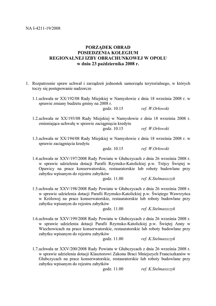 NA I-4211-19/2008 PORZĄDEK OBRAD POSIEDZENIA KOLEGIUM REGIONALNEJ IZBY OBRACHUNKOWEJ W OPOLU w dniu 23 października 2008 r. 1. Rozpatrzenie spraw uchwał i zarządzeń jednostek samorządu terytorialnego, w których toczy się postępowanie nadzorcze 1.1.uchwała nr XX/192/08 Rady Miejskiej w Namysłowie z dnia 18 września 2008 r. w sprawie zmiany budżetu gminy na 2008 r. godz. 10.15 ref. W.Orłowski 1.2.uchwała nr XX/193/08 Rady Miejskiej w Namysłowie z dnia 18 września 2008 r. zmieniająca uchwałę w sprawie zaciągnięcia kredytu godz. 10.15 ref. W.Orłowski 1.3.uchwała nr XX/194/08 Rady Miejskiej w Namysłowie z dnia 18 września 2008 r. w sprawie zaciągnięcia kredytu godz. 10.15 ref. W.Orłowski 1.4.uchwała nr XXV/197/2008 Rady Powiatu w Głubczycach z dnia 26 września 2008 r. w sprawie udzielenia dotacji Parafii Rzymsko-Katolickiej p.w. Trójcy Świętej w Opawicy na prace konserwatorskie, restauratorskie lub roboty budowlane przy zabytku wpisanym do rejestru zabytków godz. 11.00 ref. K.Stelmaszczyk 1.5.uchwała nr XXV/198/2008 Rady Powiatu w Głubczycach z dnia 26 września 2008 r. w sprawie udzielenia dotacji Parafii Rzymsko-Katolickiej p.w. Świętego Wawrzyńca w Królowej na prace konserwatorskie, restauratorskie lub roboty budowlane przy zabytku wpisanym do rejestru zabytków godz. 11.00 ref. K.Stelmaszczyk 1.6.uchwała nr XXV/199/2008 Rady Powiatu w Głubczycach z dnia 26 września 2008 r. w sprawie udzielenia dotacji Parafii Rzymsko-Katolickiej p.w. Świętej Anny w Wiechowicach na prace konserwatorskie, restauratorskie lub roboty budowlane przy zabytku wpisanym do rejestru zabytków godz. 11.00 ref. K.Stelmaszczyk 1.7.uchwała nr XXV/200/2008 Rady Powiatu w Głubczycach z dnia 26 września 2008 r. w sprawie udzielenia dotacji Klasztorowi Zakonu Braci Mniejszych Franciszkanów w Głubczycach na prace konserwatorskie, restauratorskie lub roboty budowlane przy zabytku wpisanym do rejestru zabytków godz. 11.00 ref. K.Stelmaszczyk 1.8.uchwała nr XVII/217/08 Rady Miejskiej w Białej z dnia 16 września 2008 r. w sprawie zaciągnięcia kredytu długoterminowego godz. 11.15 ref. K.Stelmaszczyk 1.9.uchwała nr XXIII/166/2008 Rady Gminy Lubsza z dnia 18 września 2008 r. w sprawie zmiany budżetu na rok 2008 godz. 11.30 ref. K.Stelmaszczyk 1.10. uchwała nr XXII/180/2008 Rady Miejskiej w Wołczynie z dnia 24 września 2008 r. w sprawie określenia wzorów formularzy dla podatków: rolnego, leśnego i od nieruchomości godz. 12.00 ref. K.Stelmaszczyk 1.11. uchwała nr XXIV/159/2008 Rady Gminy Dobrzeń Wielki z dnia 26 września 2008 r. w sprawie trybu udzielania i rozliczania dotacji dla publicznych przedszkoli i szkół prowadzonych na terenie Gminy Dobrzeń Wielki przez podmioty nienależące do sektora finansów publicznych godz. 12.15 1.12. ref. K.Stelmaszczyk uchwała nr XXVII/345/08 Rady Miejskiej w Kluczborku z dnia 30 września 2008 r. w sprawie określenia wzorów formularzy na podatek rolny, leśny i od nieruchomości godz. 12.30 ref. A.Talik 1.13. zarządzenie nr 156/08 Wójta Gminy Komprachcice z dnia 10 października 2008 r. w sprawie zmiany budżetu gminy na 2008 rok godz. 12.45 ref. A.Talik 1.14. uchwała nr XXIII/191/08 Rady Miejskiej w Głubczycach z dnia 18 września 2008 r. w sprawie określenia warunków i trybu wspierania, w tym finansowego, rozwoju sportu kwalifikowanego na terenie gminy Głubczyce godz. 13.00 ref. A.Sędkowska 2. Rozpatrzenie uchwał i zarządzeń nietypowych oraz w sprawach niejednoznacznych 2.1. uchwała nr XXV/345/08 Rady Miejskiej w Nysie z dnia 26 września 2008 r. w sprawie zmiany uchwały nr XXI/382/04 Rady Miejskiej w Nysie z dnia 26 marca 2004 r. w sprawie zasad finansowania sołectw Gminy Nysa ref. W.Orłowski 3. Przyjęcie list uchwał i zarządzeń organów jednostek samorządu terytorialnego, w których nie dopatrzono się naruszenia prawa.
