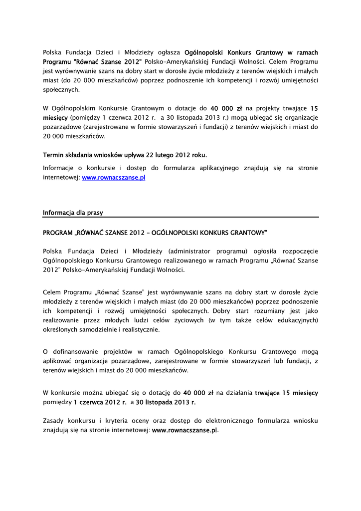 Polska Fundacja Dzieci i Młodzieży ogłasza Ogólnopolski Konkurs Grantowy w ramach Programu "Równać Szanse 2012" Polsko-Amerykańskiej Fundacji Wolności. Celem Programu jest wyrównywanie szans na dobry start w dorosłe życie młodzieży z terenów wiejskich i małych miast (do 20 000 mieszkańców) poprzez podnoszenie ich kompetencji i rozwój umiejętności społecznych. W Ogólnopolskim Konkursie Grantowym o dotacje do 40 000 zł na projekty trwające 15 miesięcy (pomiędzy 1 czerwca 2012 r. a 30 listopada 2013 r.) mogą ubiegać się organizacje pozarządowe (zarejestrowane w formie stowarzyszeń i fundacji) z terenów wiejskich i miast do 20 000 mieszkańców. Termin składania wniosków upływa 22 lutego 2012 roku. Informacje o konkursie i dostęp do formularza aplikacyjnego znajdują się na stronie internetowej: www.rownacszanse.pl Informacja dla prasy PROGRAM „RÓWNAĆ SZANSE 2012 – OGÓLNOPOLSKI KONKURS GRANTOWY” Polska Fundacja Dzieci i Młodzieży (administrator programu) ogłosiła rozpoczęcie Ogólnopolskiego Konkursu Grantowego realizowanego w ramach Programu „Równać Szanse 2012” Polsko-Amerykańskiej Fundacji Wolności. Celem Programu „Równać Szanse” jest wyrównywanie szans na dobry start w dorosłe życie młodzieży z terenów wiejskich i małych miast (do 20 000 mieszkańców) poprzez podnoszenie ich kompetencji i rozwój umiejętności społecznych. Dobry start rozumiany jest jako realizowanie przez młodych ludzi celów życiowych (w tym także celów edukacyjnych) określonych samodzielnie i realistycznie. O dofinansowanie projektów w ramach Ogólnopolskiego Konkursu Grantowego mogą aplikować organizacje pozarządowe, zarejestrowane w formie stowarzyszeń lub fundacji, z terenów wiejskich i miast do 20 000 mieszkańców. W konkursie można ubiegać się o dotację do 40 000 zł na działania trwające 15 miesięcy pomiędzy 1 czerwca 2012 r. a 30 listopada 2013 r. Zasady konkursu i kryteria oceny oraz dostęp do elektronicznego formularza wniosku znajdują się na stronie internetowej: www.rownacszanse.pl. Konkurs składa się z dwóch etapów. Pierwszym jest przygotowanie diagnozy środowiska lokalnego W drugim etapie zakwalifikowane organizacje przygotują projekty. Termin składania wniosków w pierwszym etapie konkursu upływa 22 lutego 2012 roku. Program Polsko-Amerykańskiej Fundacji Wolności „Równać Szanse” administrowany przez Polską Fundację Dzieci i Młodzieży istnieje już od 2001 r. Misją Programu jest wyrównywanie szans na dobry start w dorosłe życie młodzieży z terenów wiejskich i małych miast (do 20 000 mieszkańców) poprzez podnoszenie ich kompetencji i rozwój umiejętności społecznych. Dzięki Programowi udało się we wsiach i małych miejscowościach zrealizować już około 1 700 projektów o tematyce medialnej, ekologicznej, technicznej, artystycznej, dziedzictwa kulturowego, nauk ścisłych i wielu innych. Informacje o Programie i o zrealizowanych projektach znajdują się na stronie www.rownacszanse.pl Polska Fundacja Dzieci i Młodzieży powstała w 1991 r. Celem działań Fundacji jest wszechstronny rozwój dzieci i młodzieży oraz pomoc w formowaniu się pokolenia odpowiedzialnych, twórczych ludzi, aktywnie kształtujących własne życie i środowisko. Misją Fundacji jest wyrównywanie szans dzieci i młodzieży z terenów i środowisk, gdzie sytuacja jest trudna – wsi, małych miast i miejskich blokowisk. Podstawą działalności Fundacji jest organizowanie programów dotacyjnych i szkoleń. Fundacja nie prowadzi działalności gospodarczej, środki finansowe uzyskuje z dotacji i darowizn instytucji oraz osób prywatnych. Polsko Amerykańska Fundacja Wolności została utworzona w 1999 r. przez PolskoAmerykański Fundusz Przedsiębiorczości, a w roku 2000 otworzyła przedstawicielstwo w Polsce i rozpoczęła działalność programową. Fundacja działa na rzecz umacniania społeczeństwa obywatelskiego, demokracji i gospodarki rynkowej w Polsce, w tym wyrównywania szans rozwoju indywidualnego i społecznego, a jednocześnie wspiera procesy transformacji w innych krajach Europy Środkowo-Wschodniej. W działaniach na terenie Polski, Fundacja koncentruje się obecnie na inicjatywach edukacyjnych, służących przede wszystkim wyrównywaniu szans oraz na wyzwalaniu energii obywatelskiej w miejscach wymagających szczególnego wsparcia. Fundacja finansuje swoją działalność z przychodów funduszu wieczystego, którego źródłem są środki pochodzące z Polsko-Amerykańskiego Funduszu Przedsiębiorczości. Kontakt: Artur Łęga – koordynator Programu „Równać Szanse” Polska Fundacja Dzieci i Młodzieży (22) 826 10 16 (+48) 609 458 344 e-mail:[email protected] Informacja dla prasy PROGRAM „RÓWNAĆ SZANSE 2012 – OGÓLNOPOLSKI KONKURS GRANTOWY” Polska Fundacja Dzieci i Młodzieży (administrator programu) ogłosiła rozpoczęcie Ogólnopolskiego Konkursu Grantowego realizowanego w ramach Programu „Równać Szanse 2012” Polsko-Amerykańskiej Fundacji Wolności. Celem Programu „Równać Szanse” jest wyrównywanie szans na dobry start w dorosłe życie młodzieży z terenów wiejskich i małych miast (do 20 000 mieszkańców) poprzez podnoszenie ich kompetencji i rozwój umiejętności społecznych. Dobry start rozumiany jest jako realizowanie przez młodych ludzi celów życiowych (w tym także celów edukacyjnych) określonych samodzielnie i realistycznie. O dofinansowanie projektów w ramach Ogólnopolskiego Konkursu Grantowego mogą aplikować organizacje pozarządowe, zarejestrowane w formie stowarzyszeń lub fundacji, z terenów wiejskich i miast do 20 000 mieszkańców. W konkursie można ubiegać się o dotację do 40 000 zł na działania trwające 15 miesięcy pomiędzy 1 czerwca 2012 r. a 30 listopada 2013 r. Zasady konkursu i kryteria oceny oraz dostęp do elektronicznego formularza wniosku znajdują się na stronie internetowej: www.rownacszanse.pl.