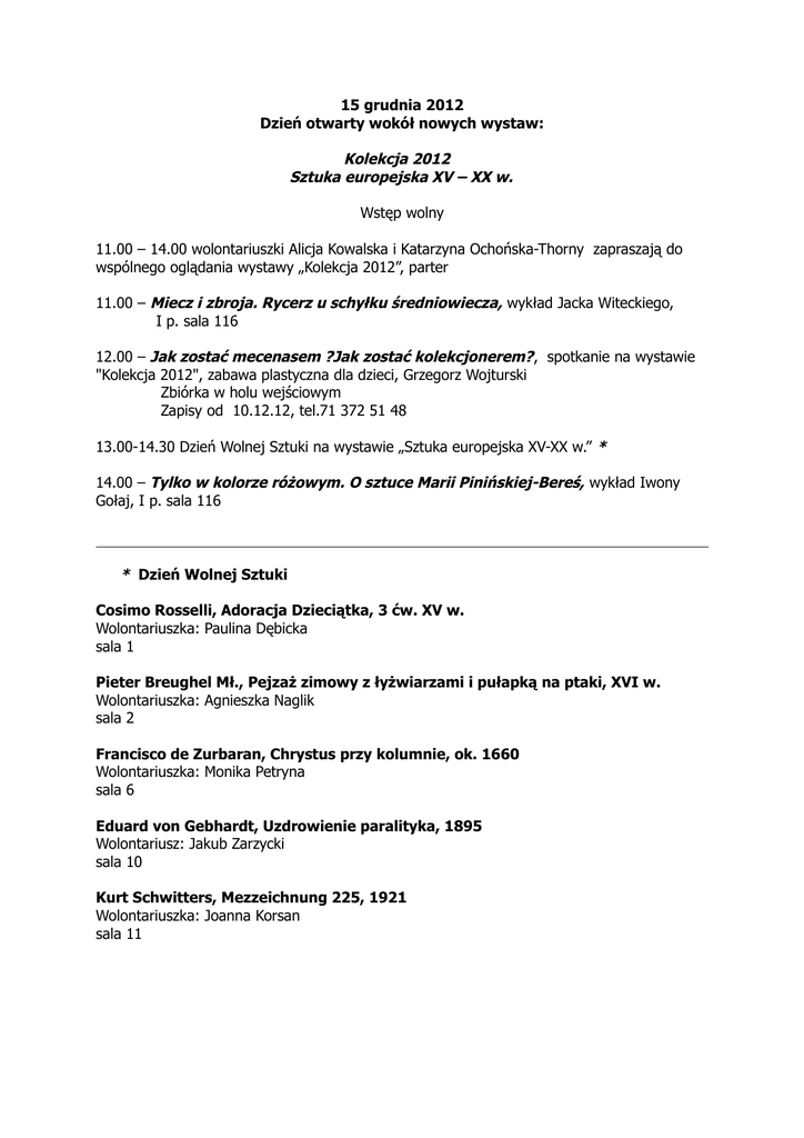 15 grudnia 2012 Dzień otwarty wokół nowych wystaw: Kolekcja 2012 Sztuka europejska XV – XX w. Wstęp wolny 11.00 – 14.00 wolontariuszki Alicja Kowalska i Katarzyna Ochońska-Thorny zapraszają do wspólnego oglądania wystawy „Kolekcja 2012”, parter 11.00 – Miecz i zbroja. Rycerz u schyłku średniowiecza, wykład Jacka Witeckiego, I p. sala 116 12.00 – Jak zostać mecenasem ?Jak zostać kolekcjonerem?, spotkanie na wystawie "Kolekcja 2012", zabawa plastyczna dla dzieci, Grzegorz Wojturski Zbiórka w holu wejściowym Zapisy od 10.12.12, tel.71 372 51 48 13.00-14.30 Dzień Wolnej Sztuki na wystawie „Sztuka europejska XV-XX w.” * 14.00 – Tylko w kolorze różowym. O sztuce Marii Pinińskiej-Bereś, wykład Iwony Gołaj, I p. sala 116 * Dzień Wolnej Sztuki Cosimo Rosselli, Adoracja Dzieciątka, 3 ćw. XV w. Wolontariuszka: Paulina Dębicka sala 1 Pieter Breughel Mł., Pejzaż zimowy z łyżwiarzami i pułapką na ptaki, XVI w. Wolontariuszka: Agnieszka Naglik sala 2 Francisco de Zurbaran, Chrystus przy kolumnie, ok. 1660 Wolontariuszka: Monika Petryna sala 6 Eduard von Gebhardt, Uzdrowienie paralityka, 1895 Wolontariusz: Jakub Zarzycki sala 10 Kurt Schwitters, Mezzeichnung 225, 1921 Wolontariuszka: Joanna Korsan sala 11