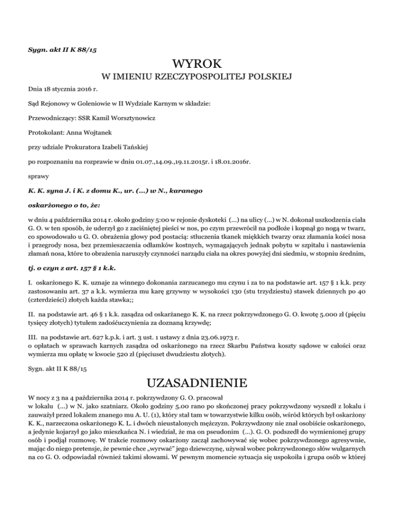 Sygn. akt II K 88/15 WYROK W IMIENIU RZECZYPOSPOLITEJ POLSKIEJ Dnia 18 stycznia 2016 r. Sąd Rejonowy w Goleniowie w II Wydziale Karnym w składzie: Przewodniczący: SSR Kamil Worsztynowicz Protokolant: Anna Wojtanek przy udziale Prokuratora Izabeli Tańskiej po rozpoznaniu na rozprawie w dniu 01.07.,14.09.,19.11.2015r. i 18.01.2016r. sprawy K. K. syna J. i K. z domu K., ur. (...) w N., karanego oskarżonego o to, że: w dniu 4 października 2014 r. około godziny 5:00 w rejonie dyskoteki (...) na ulicy (...) w N. dokonał uszkodzenia ciała G. O. w ten sposób, że uderzył go z zaciśniętej pieści w nos, po czym przewrócił na podłoże i kopnął go nogą w twarz, co spowodowało u G. O. obrażenia głowy pod postacią: stłuczenia tkanek miękkich twarzy oraz złamania kości nosa i przegrody nosa, bez przemieszczenia odłamków kostnych, wymagających jednak pobytu w szpitalu i nastawienia złamań nosa, które to obrażenia naruszyły czynności narządu ciała na okres powyżej dni siedmiu, w stopniu średnim, tj. o czyn z art. 157 § 1 k.k. I. oskarżonego K. K. uznaje za winnego dokonania zarzucanego mu czynu i za to na podstawie art. 157 § 1 k.k. przy zastosowaniu art. 37 a k.k. wymierza mu karę grzywny w wysokości 130 (stu trzydziestu) stawek dziennych po 40 (czterdzieści) złotych każda stawka;; II. na podstawie art. 46 § 1 k.k. zasądza od oskarżanego K. K. na rzecz pokrzywdzonego G. O. kwotę 5.000 zł (pięciu tysięcy złotych) tytułem zadośćuczynienia za doznaną krzywdę; III. na podstawie art. 627 k.p.k. i art. 3 ust. 1 ustawy z dnia 23.06.1973 r. o opłatach w sprawach karnych zasądza od oskarżonego na rzecz Skarbu Państwa koszty sądowe w całości oraz wymierza mu opłatę w kwocie 520 zł (pięciuset dwudziestu złotych). Sygn. akt II K 88/15 UZASADNIENIE W nocy z 3 na 4 października 2014 r. pokrzywdzony G. O. pracował w lokalu (...) w N. jako szatniarz. Około godziny 5.00 rano po skończonej pracy pokrzywdzony wyszedł z lokalu i zauważył przed lokalem znanego mu A. U. (1), który stał tam w towarzystwie kilku osób, wśród których był oskarżony K. K., narzeczona oskarżonego K. L. i dwóch nieustalonych mężczyzn. Pokrzywdzony nie znał osobiście oskarżonego, a jedynie kojarzył go jako mieszkańca N. i wiedział, że ma on pseudonim (...). G. O. podszedł do wymienionej grupy osób i podjął rozmowę. W trakcie rozmowy oskarżony zaczął zachowywać się wobec pokrzywdzonego agresywnie, mając do niego pretensje, że pewnie chce „wyrwać” jego dziewczynę, używał wobec pokrzywdzonego słów wulgarnych na co G. O. odpowiadał również takimi słowami. W pewnym momencie sytuacja się uspokoiła i grupa osób w której był oskarżony wraz z pokrzywdzonym, a za wyjątkiem A. U. (1), który udał się do swojego samochodu, ruszyła w stronę ulicy (...), idąc ulicą (...). Po chwili jednak oskarżony i pokrzywdzony znowu odezwali się do siebie, po czym pokrzywdzony chciał odłączyć się od grupy, ale widząc to, oskarżony złapał go za ramię i następnie zaciśniętą pięścią uderzył prosto w nos, po czym nałożył G. O. kaptur na głowę, przewrócił na ziemię i kopnął w twarz. Osoby towarzyszące oskarżonemu odciągnęły go od pokrzywdzonego i razem z oskarżonym oddaliły się z miejsca zdarzenia pozostawiając pokrzywdzonego. G. O. wstał, a następnie zadzwonił na policję. Na miejsce zdarzenia przybyli funkcjonariusze policji KP N. B. G. i P. K.. Zastali oni pokrzywdzonego przy ul. (...), widzieli u niego zakrwawioną twarz. W rozmowie z funkcjonariuszami G. O. opisał im sprawcę oraz wskazał, że został uderzony w twarz, a następnie przewrócony na ziemię i kopnięty przez osobę o pseudonimie (...), a także podał kierunek w którym oddalił się sprawca. Mimo podjętej próby poszukiwania sprawcy, funkcjonariusze policji, którzy dokonali penetracji terenu, nie ujawnili wskazywanej przez pokrzywdzonego osoby. Dowody: - zeznania świadka G. O. k. 3-4,41-43,47,62,101-102, - zeznania świadka B. G. k. 152v., - zeznania świadka P. K. k. 152v. - częściowo zeznania świadka A. U. (1) k. 118 W wyniku zadanych ciosów pokrzywdzony G. O. doznał obrażeń głowy pod postacią stłuczenia tkanek miękkich twarzy oraz złamania kości nosa i przegrody nosa, bez przemieszczeń odłamów kostnych, wymagających jednak pobytu w szpitalu i nastawienia złamań nosa, które to obrażenia spowodowały naruszenie czynności narządu ciała jakim jest głowa, na okres czasu powyżej siedmiu dni w stopniu średnim. Złamanie nosa jakiego doznał pokrzywdzony wymagało pobytu w szpitalu przez okres dwóch dni, wykonania zabiegu chirurgicznego, a także skutkowało dolegliwościami u pokrzywdzonego związanymi z drożnością nosa. Dowody: - opinia biegłego k. 13-17, - karta informacyjna k. 6, - zeznania świadka G. O. k. 3-4 Następnego dnia po zdarzeniu pokrzywdzony G. O. skontaktował się z A. U. i zapytał go jak nazywa się mężczyzna o pseudonimie (...) przez którego został uderzony, na co A. U. (2) oświadczył, że nazywa się on K. K.. Ponadto oskarżony sam chciał skontaktować się G. O. i w nocy z 23/24 stycznia 2015 r. przyszedł do lokalu (...) w godzinach pracy pokrzywdzonego, ale ze względu na agresywne zachowanie nie został wpuszczony do lokalu. Dowody: - zeznania świadka G. O. k. 3-4,47,62,101-102, - zeznania świadka T. S. k. 63-64,102 K. K. ma (...), ma wykształcenie wyższe – inżynier nawigator. Pracuje jako nawigator na statkach, otrzymuje wynagrodzenie w kwocie 3.000 – 3.800 euro. Oskarżony jest kawalerem, ma na utrzymaniu pasierbicę w wieku 13 lat. Oskarżony był karany w 2007 roku przez sąd na terenie Norwegii, nie był leczony odwykowo ani psychiatrycznie. Dowody: - dane oskarżonego k. 100v, - dane osobopoznawcze k. 65, - karta karna k. 56-57,130-131 Oskarżony K. K. przesłuchiwany w postępowaniu przygotowawczym nie przyznał się do zarzucanego mu czynu i odmówił