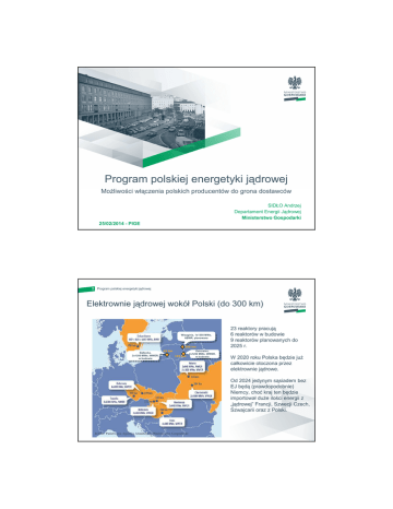 Program polskiej energetyki jądrowej MoŜliwości włączenia polskich producentów do grona dostawców SIDŁO Andrzej Departament Energii Jądrowej Ministerstwo Gospodarki 25/02/2014 - PIGE 2 Program polskiej energetyki jądrowej Elektrownie jądrowej wokół Polski (do 300 km) Wisaginia, 1x1350 MWe, Wisaginia, 1x1350 MWe, ABWR, planowana ABWR, planowana 256 km Bałtycka, Bałtycka, 2x1200 MWe, WWER, 2x1200 MWe, WWER, w budowie w budowie 65 km 181 km Ostrowiec, Ostrowiec, 2x1200 MWe, WWER, 2x1200 MWe, WWER, w budowie w budowie 23 reaktory pracują 6 reaktorów w budowie 9 reaktorów planowanych do 2025 r. W 2020 roku Polska będzie juŜ całkowicie otoczona przez elektrownie jądrowe. Od 2024 jedynym sąsiadem bez EJ będą (prawdopodobnie) Niemcy, choć kraj ten będzie importował duŜe ilości energii z „jądrowej” Francji, Szwecji Czech, Szwajcarii oraz z Polski. źródło: Państwowa Agencja Atomistyki, Ministerstwo Gospodarki 3 Program polskiej energetyki jądrowej Uchwała nr 4/2009 Rady Ministrów z dnia 13 stycznia 2009r. w sprawie działań podejmowanych w zakresie rozwoju energetyki jądrowej : § 1. Rada Ministrów uznaje za niezbędne przygotowanie i wdroŜenie Programu polskiej energetyki jądrowej. Rozporządzenie Rady Ministrów z dnia 12 maja 2009 r. w sprawie ustanowienia Pełnomocnika Rządu do spraw Polskiej Energetyki Jądrowej § 2.2. Do zadań Pełnomocnika naleŜy, w szczególności, opracowanie i przedstawienie Radzie Ministrów projektu Programu polskiej energetyki jądrowej. Załącznik do uchwały nr 157/2010 Rady Ministrów z dnia 29 września 2010 roku Polityka energetyczna Polski do 2030r. Pkt 4.2. Działania na rzecz dywersyfikacji struktury wytwarzania energii elektrycznej poprzez wprowadzenie energetyki jądrowej obejmują: • • 4 stworzenie podstaw instytucjonalnych do przygotowania i wdroŜenia programu polskiej energetyki jądrowej, przygotowanie projektu programu polskiej energetyki jądrowej (…) oraz przedstawienie programu do zatwierdzenia Radzie Ministrów. Program polskiej energetyki jądrowej Prace nad opracowaniem PPEJ – konsultacje transgraniczne (2012-2013) W okresie od lipca do grudnia 2012 odbyto spotkania na poziomie eksperckim z krajami zainteresowanymi, tj. z: •Słowacją, •Austrią, •Niemcami, •Danią. Formalnie proces konsultacji transgranicznych został zakończony podpisaniem Protokołu z konsultacji z Austrią, co miało miejsce w maju 2013. 5 Program polskiej energetyki jądrowej Dywersyfikacja źródeł energii uzyskana dzięki energetyce jądrowej Gaz ziemny 9% Olej opałowy 1% Węgiel kamienny 36% OZE 19% Atom 12% 2030 Węgiel brunatny 23% źródło: Uaktualnienie prognozy zapotrzebowania na paliwa i energię do roku 2030, ARE S.A., czerwiec 2013 6 Program polskiej energetyki jądrowej Starzenie się polskich elektrowni źródło: „Statystyka elektroenergetyki polskiej 2011”, ARE S.A., Warszawa 2012 Z zainstalowanych obecnie w polskich elektrowniach 33,5 GW mocy do 2020 r. zostanie wyłączonych 4,9 GW oraz kolejnych 5,4 GW do 2030 r. – razem 30% mocy zainstalowanej. Elektrownie jądrowe częściowo uzupełnią te ubytki. 7 Program polskiej energetyki jądrowej Etapy PPEJ: Etap I - Etap II - do 31.12.2013: Stworzenie podstaw instytucjonalnych i programowych do rozwoju energetyki jądrowej; Uchwalenie i wejście w Ŝycie przepisów prawnych niezbędnych dla rozwoju i funkcjonowania energetyki jądrowej; 1.01.2014 - 31.12.2016 28/01/2014 – zatwierdzenie przez Radę Ministrów Programu polskiej energetyki jądrowej (PPEJ) Etap III - Etap IV - Etap V - Ustalenie lokalizacji i zawarcie kontraktu na wybraną technologię pierwszej elektrowni jądrowej; 1.01.2017 - 31.12.2018: Wykonanie projektu technicznego i uzyskanie wymaganych prawem decyzji i opinii; 1.01.2019 - 31.12.2024: Pozwolenie na budowę, budowa i podłączenie do sieci pierwszego bloku pierwszej elektrowni jądrowej, rozpoczęcie budowy kolejnych bloków/elektrowni jądrowych; 1.01.2025 - 31.12.2030: Kontynuacja i rozpoczęcie budowy kolejnych bloków / rozpoczęcie budowy drugiej elektrowni jądrowej. Zakończenie budowy drugiej elektrowni jądrowej przewidywane jest na 2035 rok. (6GWe łącznie) 8 Program polskiej energetyki jądrowej Stan realizacji PPEJ – prawo Rozpoczęcie i przeprowadzenie procesu inwestycyjnego umoŜliwiają 2 ustawy: - znowelizowana ustawa - Prawo atomowe - ustawa o przygotowaniu i realizacji inwestycji w zakresie obiektów energetyki jądrowej oraz inwestycji towarzyszących (w skrócie zwana „ustawą inwestycyjną”). Do Prawa atomowego dołączonych jest równieŜ ok. 45 rozporządzeń, w tym 3 rozporządzenia Ministra Gospodarki. Rozporządzenie oczekujące na podpis Premiera RP: Rozporządzenia dotyczącego rodzajów urządzeń technicznych podlegających dozorowi technicznemu w EJ MG pracuje obecnie nad następującymi aktami prawnymi: - Nowelizacji ustawy - Prawa atomowego w celu implementacji dyrektywy Rady 2011/70/Euroatom, tzw. „dyrektywa odpadowa” (etap sejmowy) - Projekt Rozporządzenia Ministra Gospodarki w sprawie warunków technicznych dozoru technicznego dla urządzeń technicznych; uwzględnianie uwag z konsultacji społecznych 9 Program polskiej energetyki jądrowej Stan realizacji PPEJ – działania inwestora PGE 2014 – Oczekiwane rozstrzygnięcie przetargu na świadczenie usług inŜyniera kontraktu (III kwartał) Do końca 2016 roku oczekiwane jest zakończenie przetargu postępowania zintegrowanego: dostawa technologii, budowa elektrowni, pozyskanie finansowania. 10 Program polskiej energetyki jądrowej Stan realizacji PPEJ – zaangaŜowanie przemysłu krajowego ROZDZIAŁ XV PPEJ: Działania Inwestora/Dostawcy technologii: -Określenie listy produktów i usług, których wykonanie moŜe być zlecone przedsiębiorstwom krajowym, - Pozyskanie deklaracji przedsiębiorstw krajowych do udziału w budowie EJ, -Weryfikacja otrzymanych zgłoszeń pod kątem stanu technologicznego, kompetencyj