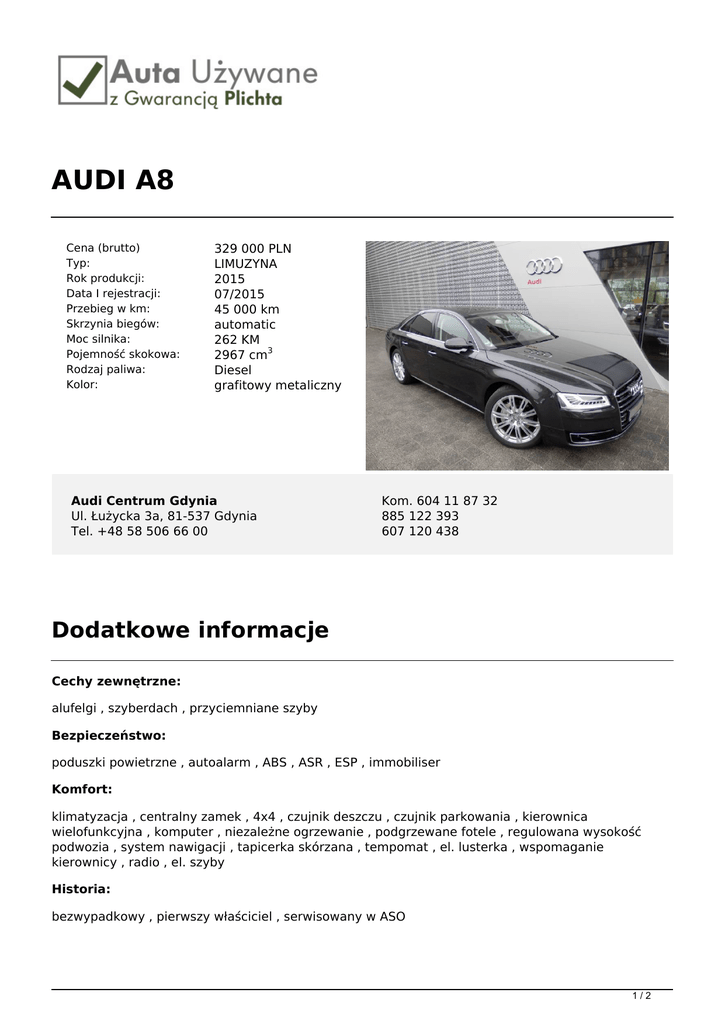 AUDI A8 Cena (brutto) Typ: Rok produkcji: Data I rejestracji: Przebieg w km: Skrzynia biegów: Moc silnika: Pojemność skokowa: Rodzaj paliwa: Kolor: 329 000 PLN LIMUZYNA 2015 07/2015 45 000 km automatic 262 KM 2967 cm3 Diesel grafitowy metaliczny Audi Centrum Gdynia Ul. Łużycka 3a, 81-537 Gdynia Tel. +48 58 506 66 00 Kom. 604 11 87 32 885 122 393 607 120 438 Dodatkowe informacje Cechy zewnętrzne: alufelgi , szyberdach , przyciemniane szyby Bezpieczeństwo: poduszki powietrzne , autoalarm , ABS , ASR , ESP , immobiliser Komfort: klimatyzacja , centralny zamek , 4x4 , czujnik deszczu , czujnik parkowania , kierownica wielofunkcyjna , komputer , niezależne ogrzewanie , podgrzewane fotele , regulowana wysokość podwozia , system nawigacji , tapicerka skórzana , tempomat , el. lusterka , wspomaganie kierownicy , radio , el. szyby Historia: bezwypadkowy , pierwszy właściciel , serwisowany w ASO 1/2 Gwarancja: Gwarancja Fabryczna Gwarancja Szanowni Państwo, Pragniemy Państwa poinformować, iż firma Plichta – Autoryzowany Dealer Škoda Auto prowadzi skup oraz sprzedaż samochodów używanych wszystkich marek, oferując także samochody używane z gwarancją objęte programem „Auta używane z Gwarancją Plichta”. W ramach programu „Auta Używane z Gwarancją Plichta ” każdy Klient otrzymuje atrakcyjny pakiet zniżek pozwalający zoptymalizować koszty eksploatacji samochodu: -50% na serwis klimatyzacji -50% na ustawienie zbieżności -50% na kosmetykę auta -50% na ścieżkę diagnostyczną -25% na wymiany oleju -25% na zakup opon + 5zł na sezon za hotelowanie opon -15% na części i akcesoria Oferujemy również kompleksową obsługę w zakresie finansowania i ubezpieczenia: - kredyty już od 4,99% - leasingi i kredyty bez zaświadczeń - uproszczone procedury – decyzja już od 30 min. - atrakcyjne pakiety AC/OC/NW/ASS wiodących firm ubezpieczeniowych Możliwość pozostawienia dotychczas użytkowanego auta w rozliczeniu – BEZPŁATNA WYCENA!!! Zapraszamy wszystkich Klientów na jazdę próbną wybranym autem. Numer oferty: GA015 Informacja nie stanowi oferty w rozumieniu art. 66 KC. Podane dane mają charakter wyłącznie informacyjny. 2/2 Powered by TCPDF (www.tcpdf.org)
