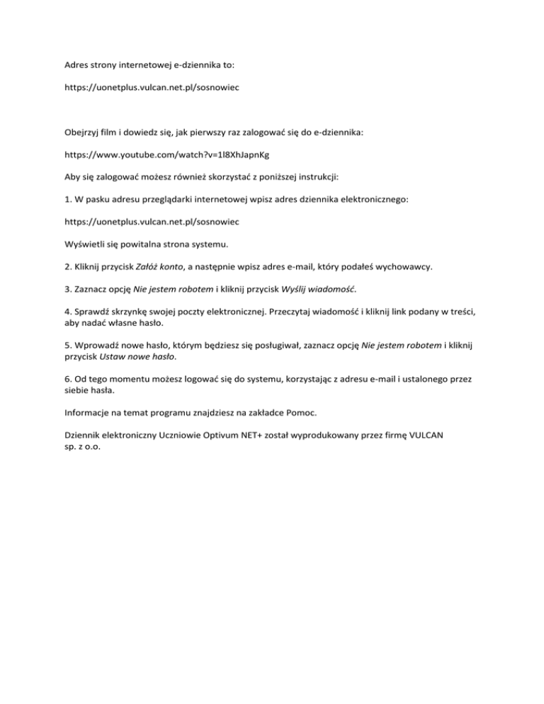 Adres strony internetowej e-dziennika to: https://uonetplus.vulcan.net.pl/sosnowiec Obejrzyj film i dowiedz się, jak pierwszy raz zalogować się do e-dziennika: https://www.youtube.com/watch?v=1l8XhJapnKg Aby się zalogować możesz również skorzystać z poniższej instrukcji: 1. W pasku adresu przeglądarki internetowej wpisz adres dziennika elektronicznego: https://uonetplus.vulcan.net.pl/sosnowiec Wyświetli się powitalna strona systemu. 2. Kliknij przycisk Załóż konto, a następnie wpisz adres e-mail, który podałeś wychowawcy. 3. Zaznacz opcję Nie jestem robotem i kliknij przycisk Wyślij wiadomość. 4. Sprawdź skrzynkę swojej poczty elektronicznej. Przeczytaj wiadomość i kliknij link podany w treści, aby nadać własne hasło. 5. Wprowadź nowe hasło, którym będziesz się posługiwał, zaznacz opcję Nie jestem robotem i kliknij przycisk Ustaw nowe hasło. 6. Od tego momentu możesz logować się do systemu, korzystając z adresu e-mail i ustalonego przez siebie hasła. Informacje na temat programu znajdziesz na zakładce Pomoc. Dziennik elektroniczny Uczniowie Optivum NET+ został wyprodukowany przez firmę VULCAN sp. z o.o.