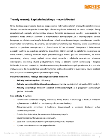 Trendy rozwoju kapitału ludzkiego – wyniki badań Firma Certes przeprowadziła badania bezpośrednie nabywców szkoleń oraz rynku szkoleniowego. Śledząc otoczenie nabywców istotne było dla nas uzyskanie informacji na temat rodzaju i formy zaspakajanych potrzeb użytkowników szkoleń. Potrzeba zdobywania wiedzy i uczęszczania na szkolenia może wynikać zarówno z motywatorów zewnętrznych jak i wewnętrznych. Ludzie korzystają ze szkoleń, coachingów i doradztwa z chęci rozwoju osobistego, zawodowego, prestiżu (motywator wewnętrzny), dla awansu (motywator zewnętrzny) itp. Niestety, często uczestnictwo wynika z czynników zewnętrznych – „firma kazała iść na szkolenie”. Motywator i świadomość potrzeby wpływa na przebieg szkolenia. Uczestnicy, którzy przyszli na szkolenie z przymusu są mniej otwarci, niekiedy ironiczni wręcz przeszkadzający. Istotna jest też świadomość, że ludzie poszukujący wiedzy mogą wybrać różne drogi rozwoju - szkolenia zewnętrzne, szkolenia wewnętrzne, coaching, studia podyplomowe, kursy a czasami nawet samonaukę - książka, biblioteka, Internet, znajomi itp. Wiedza na temat użytkowników naszych produktów, ich potrzeb, motywatorów do skorzystania z usług firmy Certes jest bardzo ważna w budowaniu nowej strategii oraz pracy nad wzrostem jakości prowadzonych usług. Przeprowadziliśmy 3 rodzaje badań rynku i wśród klientów: • Ankiety badania rynku – 122 osoby; • Ankiety satysfakcji klientów szkoleń komercyjnych, z ostatnich 3 lat (próba 1072 osoby); • Ankiety satysfakcji klientów szkoleń dofinansowanych z 3 projektów zamkniętych (próba 1540 osób). Cele ankiety 1 (rynku): • Sprawdzenie zależności między wielkością firmy, branżą i lokalizacją, a liczbą i rodzajem wykonywanych szkoleń w celu lepszego dopasowania oferty. • Zdiagnozowanie czynników i kryteriów decydujących o wyborze dostawcy usług szkoleniowych/ofert. • Potwierdzenie tendencji rozwoju szkoleń wewnętrznych. • Szukanie niszy rynkowej/grup docelowych. • Zbadanie skutecznych źródeł i sposobów zdobywania klientów. • Wyznaczenie kierunku rozwoju produktów. Certes Sp. z o.o. | Wał Miedzeszyński 552C | 03-994 Warszawa | Tel. +48 22 353 82 20 | Faks +48 22 353 82 21 | [email protected] | www.certes.pl NIP 5213445303 | REGON 141029299 | KRS 0000283010 | Bank Millenium S.A. 92 1160 2202 0000 0000 9493 5861 1 Cele ankiety 2 i 3 (obecnych klientów): • Ocena satysfakcji klientów z przeprowadzonych usług. • Poszukiwanie kluczowych czynników sukcesu. Badanie rynku Badanie ankietowe z zakresu: „Analiza rynku i odbiorców usług szkoleniowych” zostało przeprowadzone na próbie liczącej 122 jednostki. Narzędziem badawczym była opracowana przez zespół projektowy firmy Certes ankieta, którą zamieściliśmy na portalu www.ankietka.pl. Zebrane wyniki pochodzą z czternastu województw kraju, przy czym 64% badanych posiada lokalizację siedziby przedsiębiorstwa w województwie mazowieckim. Wśród badanych odbiorców usług szkoleniowych znaleźli się przedstawiciele kluczowych dla rynku szkoleniowego branż, mianowicie: • Handel/Dystrybucja (25,41%) • Farmaceutyka (11,48%) • Usługi (10,66%) • Przemysł (10,66%) • IT/telekomunikacja (5,74%) • Bankowość (4,10%) • Banki/ubezpieczenia (4,10%) • Transport/Logistyka/Spedycja (3,28%) • Media/Reklama/PR (2,46%) • Administracja publiczna (2,46%) • oraz inne (19,67%). Liczba pracowników zatrudnionych w grupie przedsiębiorstw biorących udział w badaniu została pogrupowana wg następującego klucza: 1. 1 – 9 pracowników 2. 10 – 49 pracowników 3. 50 – 99 pracowników 4. 100 – 249 pracowników 5. 250 i więcej pracowników Certes Sp. z o.o. | Wał Miedzeszyński 552C | 03-994 Warszawa | Tel. +48 22 353 82 20 | Faks +48 22 353 82 21 | [email protected] | www.certes.pl NIP 5213445303 | REGON 141029299 | KRS 0000283010 | Bank Millenium S.A. 92 1160 2202 0000 0000 9493 5861 2 Wykres 1. Liczba pracowników zatrudnionych w ankietowanym przedsiębiorstwie !"#$%&'()&#*+,"-.+'+'$&/)01,"*,23'()$415"6%"*)5/+"4' !"#"$" !%&" !%#'$" !'&" )(%"+",+-./0" '1&" (%#$$" !)&" !%%#)'$" !*&" Źródło: opracowanie własne na podstawie przeprowadzonego badania Blisko 50% respondentów reprezentowało przedsiębiorstwa liczące 250 i więcej pracowników. Liczebności pracowników w pozostałych wyodrębnionych przedziałach kształtują się na podobnym (od 10% do 16%) poziomie. Odpowiedzi na pytania ankiety udzielały osoby, które w przedsiębiorstwach są odpowiedzialne za zagadnienia dotyczące szkoleń i rozwoju pracowników: menadżerowie HR, menadżerowie działów lub pionów, a także osoby zarządzające jednostkami gospodarczymi, czyli właściciele firm, prezesi lub dyrektorzy zarządzający. Ich zadaniem jest dobór szeroko rozumianej oferty szkoleniowej, która zabezpieczy potrzeby zgłaszane przez pracowników, ponieważ jak wynika z odpowiedzi to właśnie pracownicy w 75% sami zgłaszają takie zapotrzebowanie. Głównym źródłem poszukiwania dostawców szkoleń jest, dla 34 % badanych, rekomendacja innych osób. W 27 % Internet stanowi o sposobie wyboru firmy, zaś 22% spośród ankietowanych udało się przekonać do wyboru poprzez otrzymanie bezpośredniej oferty ze strony firm szkoleniowych. Po dokładnym rozpoznaniu rynku i dokonaniu wyboru dostawcy szkoleń, ankietowani w 87% przypadków wykazali zadowolenie z finalnej oferty przedstawionej i realizowanej przez wyselekcjonowanego dostawcę. Certes Sp. z o.o. | Wał Miedzeszyński 552C | 03-994 Warszawa | Tel. +48 22 353 82 20 | Faks +48 22 353 82 21 | [email protected] | www.certes.pl NIP 5213445303 | REGON 141029299 | KRS 0000283010 | Bank Millenium S.A. 92 1160 2202 0000 0000 9493 5861 3 Kluczowe czynniki jakie decydują o wyborze dostawcy usług szkoleniowych przedstawia wykres poniżej. Wykres 2. Kluczowe czynniki decydujące o wyborze dostawcy szkoleń !"#$%&'()$%*++