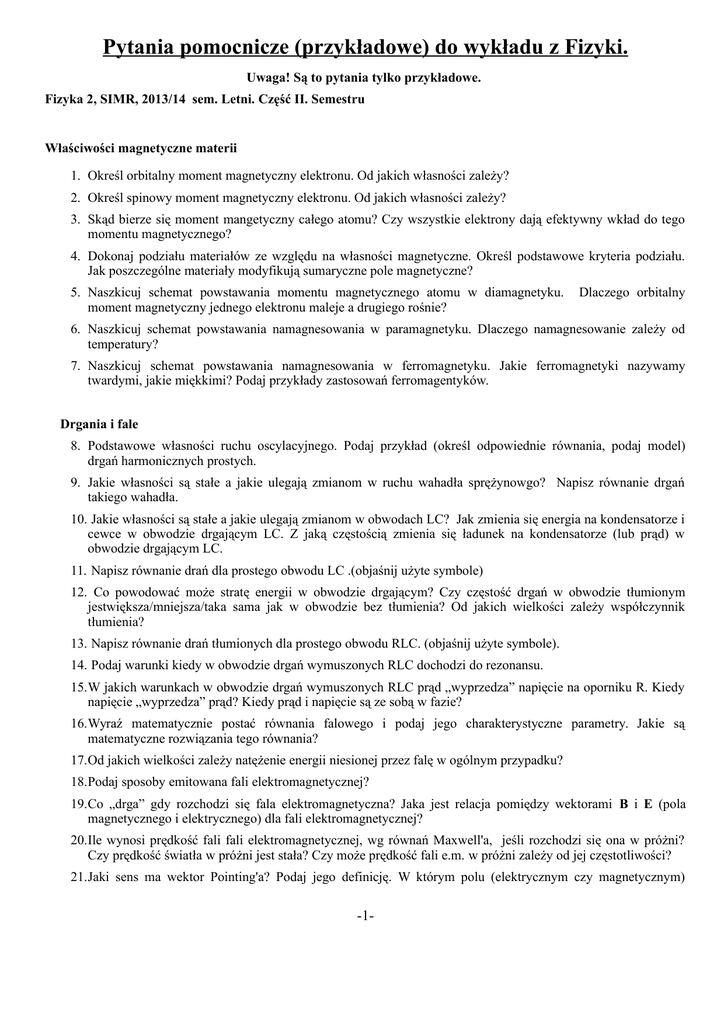 Pytania pomocnicze (przykładowe) do wykładu z Fizyki.