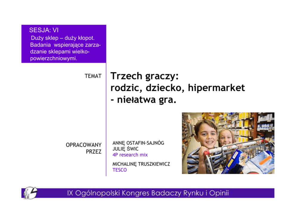 SESJA: VI DuŜy sklep – duŜy kłopot. Badania wspierające zarzadzanie sklepami wielkopowierzchniowymi. TEMAT OPRACOWANY PRZEZ Trzech graczy: rodzic, dziecko, hipermarket - niełatwa gra. ANNĘ OSTAFIN-SAJNÓG JULIĘ ŚWIC 4P research mix MICHALINĘ TRUSZKIEWICZ TESCO dlaczego „niełatwa gra”? • „gracze” mają róŜne oczekiwania i interesy • ich cele częściowo są teŜ wewnętrznie sprzeczne • … a są przecieŜ jeszcze klienci bez dzieci… czy nie ma jednego, optymalnego dla wszystkich, rozwiązania? Film 1 2 metodologia • desk research przebieg socjalizacji konsumenckiej; analiza internetowych forów rodziców • badanie etnograficzne obserwacje w sklepach; N=12 (rodzice z dziećmi w wieku 0-3, 3½-5, 5-7½, 8-12 lat) • krótkie wywiady z dziećmi / rysunki dzieci N=12 (dzieci w wieku 0-3, 3½-5, 5-7½, 8-12 lat) • wywiady zogniskowane z rodzicami 4 FGI (po jednym na kaŜdą z powyŜszych grup wiekowych) • dane z badań ilościowych prowadzonych dla TESCO czas: lato 2008 3 gracz I: RODZICE rodzice – sytuacja/ zadania • muszą zrobić zakupy • muszą przypilnować dziecko/ dzieci • chcą przy okazji czegoś dziecko nauczyć • są pod presją społeczną, są oceniani jak sprawdzają się w roli rodzicielskiej – na podstawie zachowania ich dzieci • często są w sytuacji przymusowej – bo nie mają z kim zostawić dziecka test dojrzałości do rodzicielstwa amerykańskie forum dla rodziców 5 rodzice – zachowania (1) • nadzorowanie – aby dziecku nie stała się krzywda, nie zgubiło się, nie przeszkadzało innym, niczego nie zniszczyło • pacyfikacja – znajdowanie zajęcia dla dziecka aby się nie nudziło – negocjowanie odpowiedniego zachowania (czasem „przekupywanie”) • kooperacja – w przypadku starszych dzieci – koordynowanie zakupów/ decyzji podejmowanych podczas zakupów, korzystanie z pomocy dzieci Film 2 6 rodzice – zachowania (2) • edukacja - młodsze dzieci (często forma zabawy): - np. nazywanie, odnajdywanie przedmiotów - nauka kolorów, nauka liczenia; - starsze dzieci: - tłumaczenie zasad promocji - wartości towarów (relacji jakości i ceny) - uczenie „gospodarności”, „wartości pieniądza” - zwracania uwagi na waŜne atrybuty produktów - uczenie „odraczania przyjemności” Porady dla rodziców: „Supremarket survival”, „Winning ways to grocery shop with young children”, „Parenting tips: shopping with children”, „Beating pesterpower”; „Zakupy z dziećmi”, „Noworodek na zakupach”, „Jak robić zakupy z trzylatkiem” Film 2 7 rodzice – zachowania (3) 8 rodzice – zachowania (4) wypracowane strategie radzenia sobie z uciąŜliwymi zachowaniami dzieci w trakcie zakupów: • z nudą/ marudzeniem: - skracanie zakupów - angaŜowanie dziecka w zakupy - przekupywanie - pouczanie, czasami krzyk - ignorowanie • z namowami na zakup niechcianych produktów: - umawianie się wcześniej na zakup dla dziecka określonej rzeczy, np. zabawki - oferowanie alternatywy - asertywne odmawianie - pozorne uleganie namowom dziecka - przy kasie odkładanie produktów po cichu 9 rodzice – postawy (1) czy zakupy z dziećmi to przyjemność, czy przykry obowiązek? konieczność, przykry obowiązek przyjemność 6% czasem przyjemność, a czasem nie 29% • słaby związek z wiekiem dziecka • brak związku z płcią rodzica 39% • negatywny związek z poziomem dochodu brak związku między ogólną satysfakcją z zakupów, a tym czy lubi się zakupy z dziećmi, czy nie 25% częściej przyjemność, ale czasem meczące CSP, próba losowa sklepów TESCO, N=3000, VIi-VIIi, 2008 10 rodzice – postawy (2) dlaczego zabiera dzieci na zakupy? bo to przyjemność dla mnie 7% dziecko ma swoje gusta i preferencje 33% 22% nie mam z kim zostawić dzieci 38% dzieci lubią chodzić na zakupy 15% wspólne spędzanie czasu 17% dzieci uczą się robić zakupy CSP, próba losowa sklepów TESCO, N=3000, VIi-VIiI, 2008 11 rodzice – postawy (3) dla jednych stres, dla innych sama przyjemność ☺ • bardziej „trafione” zakupy artykułów dziecięcych • wspólne spędzanie czasu; „rodzinna rozrywka” • starsze dzieci - pomoc – (noszenie siatek, pchanie wózka, doradzanie) • „towarzyskość” - zakupy z kimś, nie w samotności • dzieci uczą się robić zakupy • bardziej chaotyczne zakupy opieka rozprasza, zapomina się o części zakupów • nerwowe – gdy dzieci są „niegrzeczne” • uciąŜliwe – wąskie alejki/ kasy, niebezpieczeństwa czyhające na dzieci • przekonanie, Ŝe trwają dłuŜej i Ŝe wydaje się więcej pieniędzy z obserwacji i wypowiedzi niebezpośrednich wynika co innego! 12 rodzice – postawy (4) • zakupy z dziećmi często trwają krócej (zmęczenie, marudzenie skracanie) • są mniej efektywne – tracenie energii na pilnowanie/ zabawianie/ pacyfikowanie dziecka; z niektórych produktów się rezygnuje, a o niektórych się zapomina albo realizuje jedynie zakupy „z listy” • faktycznie wydaje się więc raczej mniej; zakupy „wymuszane” lub kupowane w formie „przekupstwa” – zwykle pojedyncze, niedrogie produkty (lizak, chipsy, naklejki, jazda na karuzeli) 13 rodzice – postawy (5) „Nie ma dla mnie szczególnych przeszkód, aby zabierać dzieci na zakupy, przyzwyczajone od zawsze, nie było gdzie ich zostawiać, takŜe się zahartowały i nigdy nie robiły większych problemów, wręcz przeciwnie, bawi je wkładanie zakupów do kosza i wykładanie do kas, Szczególnie tych samoobsługowych.” [mama] „Robię zakupy z dziećmi w wózku – do tej pory wchodziła mi trójka. Czasem zgadzam się na zakup bakszyszu w postaci ciasteczek, a czasem nie […] Podobnie chodzimy na bazarek, czy do okolicznych sklepów. Myślę, Ŝe dzieciaki mają z tego frajdę i naukę Ŝycia.” [tata] „ Przyznam, Ŝe na cało-rodzinne [zakupy z dziećmi] teŜ lubię z nimi iść. One uczą się jak to wszystko wygląda, doradzą.” [mama] 