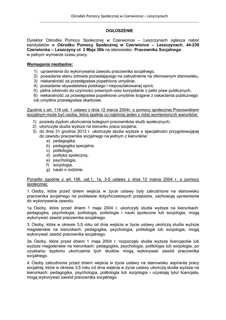 Ośrodek Pomocy Społecznej w Czerwionce – Leszczynach ....................................................................................................................................................... OGŁOSZENIE Dyrektor Ośrodka Pomocy Społecznej w Czerwionce – Leszczynach ogłasza nabór kandydatów w Ośrodku Pomocy Społecznej w Czerwionce – Leszczynach, 44-230 Czerwionka – Leszczyny ul. 3 Maja 36b na stanowisko: Pracownika Socjalnego w pełnym wymiarze czasu pracy. Wymagania niezbędne: 1) uprawnienia do wykonywania zawodu pracownika socjalnego, 2) posiadania stanu zdrowia pozwalającego na zatrudnienie na oferowanym stanowisku, 3) niekaralność za przestępstwa popełnione umyślnie, 4) posiadanie obywatelstwa polskiego i nieposzlakowanej opinii, 5) pełna zdolność do czynności prawnych oraz korzystanie z pełni praw publicznych, 6) niekaralność za przestępstwa popełnione umyślnie ścigane z oskarżenia publicznego lub umyślne przestępstwa skarbowe. Zgodnie z art. 116 ust. 1 ustawy z dnia 12 marca 2004r. o pomocy społecznej Pracownikiem socjalnym może być osoba, która spełnia co najmniej jeden z niżej wymienionych warunków: 1) posiada dyplom ukończenia kolegium pracowników służb społecznych; 2) ukończyła studia wyższe na kierunku praca socjalna; 3) do dnia 31 grudnia 2013 r. ukończyła studia wyższe o specjalności przygotowującej do zawodu pracownika socjalnego na jednym z kierunków: a) pedagogika, b) pedagogika specjalna, c) politologia, d) polityka społeczna, e) psychologia, f) socjologia, g) nauki o rodzinie. Ponadto zgodnie z art. 156. ust.1, 1a, 3-5 ustawy z dnia 12 marca 2004 r. o pomocy społecznej: 1. Osoby, które przed dniem wejścia w życie ustawy były zatrudnione na stanowisku pracownika socjalnego na podstawie dotychczasowych przepisów, zachowują uprawnienia do wykonywania zawodu. 1a. Osoby, które przed dniem 1 maja 2004 r. ukończyły studia wyższe na kierunkach: pedagogika, psychologia, politologia, politologia i nauki społeczne lub socjologia, mogą wykonywać zawód pracownika socjalnego. 3. Osoby, które w okresie 3,5 roku od dnia wejścia w życie ustawy ukończą studia wyższe magisterskie na kierunkach: pedagogika, psychologia, politologia lub socjologia, mogą wykonywać zawód pracownika socjalnego. 3a. Osoby, które przed dniem 1 maja 2004 r. rozpoczęły studia wyższe licencjackie lub wyższe magisterskie na kierunkach: pedagogika, psychologia, politologia lub socjologia, po uzyskaniu dyplomu ukończenia tych studiów mogą wykonywać zawód pracownika socjalnego. 4. Osoby zatrudnione przed dniem wejścia w życie ustawy na stanowisku aspiranta pracy socjalnej, które w okresie 3,5 roku od dnia wejścia w życie ustawy ukończą studia wyższe na kierunkach: pedagogika, psychologia, politologia lub socjologia i uzyskają tytuł licencjata, mogą wykonywać zawód pracownika socjalnego. Ośrodek Pomocy Społecznej w Czerwionce – Leszczynach ....................................................................................................................................................... 5. Osoby zatrudnione przed dniem wejścia w życie ustawy na stanowisku aspiranta pracy socjalnej, które w okresie 5,5 roku od dnia wejścia w życie ustawy ukończą studia wyższe magisterskie na kierunkach: pedagogika, psychologia, politologia lub socjologia, mogą wykonywać zawód pracownika socjalnego. Ponadto zgodnie z art. 5 ust. 1-3 ustawy z dnia 16 lutego 2007 r. o zmianie ustawy o pomocy społecznej (Dz. U. Nr 48, poz. 320). 1. Osoby, które przed dniem 1 stycznia 2007 r. otrzymały dyplom wyższej szkoły zawodowej o specjalności praca socjalna, mogą wykonywać zawód pracownika socjalnego. 2. Osoby, które do dnia 1 stycznia 2008 r. otrzymały dyplom uzyskania tytułu zawodowego w zawodzie pracownik socjalny, mogą wykonywać zawód pracownika socjalnego. 3. Osoby, które przed dniem 1 stycznia 2008 r. ukończyły lub kontynuowały studia wyższe o specjalności praca socjalna na jednym z kierunków: pedagogika, politologia, polityka społeczna, psychologia, socjologia lub nauki o rodzinie, po uzyskaniu dyplomu ukończenia tych studiów mogą wykonywać zawód pracownika socjalnego. Wymagane dokumenty : 1) list motywacyjny, 2) CV z opisem dotychczasowej kariery zawodowej i przedstawienie dodatkowych umiejętności, 3) kserokopie dokumentów potwierdzających posiadane wykształcenie, 4) kserokopie posiadanych dyplomów, świadectw, zaświadczeń, certyfikatów ukończenia innych form podnoszenia kwalifikacji (studia podyplomowe, egzaminy zawodowe, kursy), 5) kserokopie dotychczasowych świadectw pracy lub inne dokumenty potwierdzające posiadane doświadczenie zawodowe, 6) kwestionariusz osobowy dla osoby ubiegającej się o zatrudnienie ( załącznik nr 1), 7) oświadczenie kandydata o pełnej zdolności do czynności prawnych oraz korzystaniu z pełni praw publicznych, 8) oświadczenie kandydata o braku prawomocnego skazania za umyślne przestępstwo ścigane z oskarżenia publicznego lub umyślne przestępstwo skarbowe, 9) oświadczenie kandydata o posiadaniu nieposzlakowanej opinii, 10) oświadczenie kandydata o wyrażeniu zgody na przetwarzanie danych osobowych do celów rekrutacji, zgodnie z ustawą z dnia 29 sierpnia 1997r. o ochronie danych osobowych (Dz.U.2014.1182 j.t. z późń.zm.), 11) oświadczenie o braku przeciwwskazań zdrowotnych do wykonywania pracy na wymienionym stanowisku. Mile widziane doświadczenie w realizacji projektów unijnych. Termin i miejsce składania dokumentów: Dokumenty w zamkniętej kopercie z dopiskiem „Nabór na stanowisko Pracownik Socjalny w Ośrodku Pomocy Społecznej w Czerwionce-Leszczynach” w formie pisemnej należy składać w terminie do dnia 21 grudnia 2015r. do godz. 15.30 w siedzibie Ośrodka Pomocy Społecznej w Czerwionce-Leszczynach przy ul. 3 Maja 36b – sekretariat pok. nr 4. W przypadku przesłania dokumentów aplikacyjnych pocztą lub za