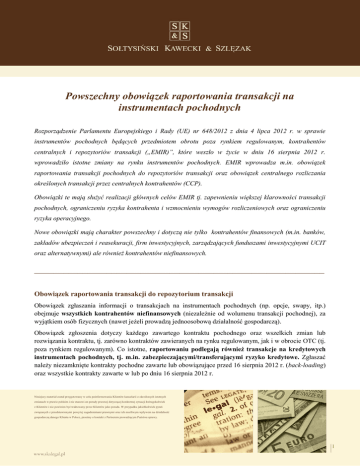 Powszechny obowiązek raportowania transakcji na instrumentach pochodnych Rozporządzenie Parlamentu Europejskiego i Rady (UE) nr 648/2012 z dnia 4 lipca 2012 r. w sprawie instrumentów pochodnych będących przedmiotem obrotu poza rynkiem regulowanym, kontrahentów centralnych i repozytoriów transakcji („EMIR)”, które weszło w życie w dniu 16 sierpnia 2012 r. wprowadziło istotne zmiany na rynku instrumentów pochodnych. EMIR wprowadza m.in. obowiązek raportowania transakcji pochodnych do repozytoriów transakcji oraz obowiązek centralnego rozliczania określonych transakcji przez centralnych kontrahentów (CCP). Obowiązki te mają służyć realizacji głównych celów EMIR tj. zapewnieniu większej klarowności transakcji pochodnych, ograniczeniu ryzyka kontrahenta i wzmocnieniu wymogów rozliczeniowych oraz ograniczeniu ryzyka operacyjnego. Nowe obowiązki mają charakter powszechny i dotyczą nie tylko kontrahentów finansowych (m.in. banków, zakładów ubezpieczeń i reasekuracji, firm inwestycyjnych, zarządzających funduszami inwestycyjnymi UCIT oraz alternatywnymi) ale również kontrahentów niefinansowych. ____________________________________________________________ Obowiązek raportowania transakcji do repozytorium transakcji Obowiązek zgłaszania informacji o transakcjach na instrumentach pochodnych (np. opcje, swapy, itp.) obejmuje wszystkich kontrahentów niefinansowych (niezależnie od wolumenu transakcji pochodnej), za wyjątkiem osób fizycznych (nawet jeżeli prowadzą jednoosobową działalność gospodarczą). Obowiązek zgłoszenia dotyczy każdego zawartego kontraktu pochodnego oraz wszelkich zmian lub rozwiązania kontraktu, tj. zarówno kontraktów zawieranych na rynku regulowanym, jak i w obrocie OTC (tj. poza rynkiem regulowanym). Co istotne, raportowaniu podlegają również transakcje na kredytowych instrumentach pochodnych, tj. m.in. zabezpieczającymi/transferującymi ryzyko kredytowe. Zgłaszać należy niezamknięte kontrakty pochodne zawarte lub obowiązujące przed 16 sierpnia 2012 r. (back-loading) oraz wszystkie kontrakty zawarte w lub po dniu 16 sierpnia 2012 r. Niniejszy materiał został przygotowany w celu poinformowania Klientów kancelarii o określonych istotnych zmianach w prawie polskim i nie stanowi on porady prawnej dotyczącej konkretnej sytuacji któregokolwiek z Klientów i nie powinien być traktowany przez Klientów jako porada. W przypadku jakichkolwiek pytań związanych z przedstawionymi powyżej zagadnieniami prawnymi oraz ich możliwym wpływem na działalność gospodarczą danego Klienta w Polsce, prosimy o kontakt z Partnerem prowadzącym Państwa sprawy. 1 18 maja 2013 r. Legal update Zgłoszenie transakcji kontrahent lub CCP może powierzyć innemu podmiotowi (np. drugiej stronie kontraktu). Raportowanie o kontraktach pochodnych jest obecnie fakultatywne, ale stanie się obowiązkowe z chwilą zarejestrowania w Europejskim Urzędzie Nadzoru Giełd i Papierów Wartościowych (ESMA) pierwszego repozytorium. Zakłada się, że nastąpi to w drugiej połowie września 2013 r. Początkowo obowiązek raportowania będzie dotyczył wyłącznie instrumentów pochodnych na stopę procentową oraz kredytowych; w zakresie pozostałych kontraktów pochodnych obowiązek ten wejdzie w życie z dniem 1 stycznia 2014 r. (o ile do 1 października w ESMA zarejestrowane zostanie pierwsze repozytorium). Krajowy Depozyt Papierów Wartościowych S.A. (KDPW) – repozytorium transakcji Zgodnie z nowelizacją ustawy o obrocie instrumentami finansowymi, zadania repozytorium transakcji w Polsce pełni KDPW. Szczegółowe informacje nt. uzyskania statusu uczestnika, dostępu oraz raportowania w repozytorium znaleźć można na stronie internetowej KDPW w zakładce „Repozytorium transakcji” dr Marcin Olechowski Justyna Młodzianowska Partner, Adwokat T. +48 22 608 70 62 [email protected] Of counsel, radca prawny T. + 48 22 608 70 41 [email protected] 2