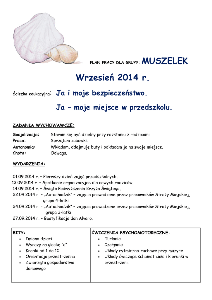 PLAN PRACY DLA GRUPY: MUSZELEK Wrzesień 2014 r. Ścieżka edukacyjna : Ja i moje bezpieczeństwo. Ja – moje miejsce w przedszkolu. ZADANIA WYCHOWAWCZE: Socjalizacja: Praca: Staram się być dzielny przy rozstaniu z rodzicami. Sprzątam zabawki. Autonomia: Cnota: Wkładam, ddejmuję buty i odkładam je na swoje miejsce. Odwaga. WYDARZENIA: 01.09.2014 r. – Pierwszy dzień zajęć przedszkolnych, 13.09.2014 r. – Spotkanie organizacyjne dla nowych rodziców, 14.09.2014 r. – Święto Podwyższenia Krzyża Świętego, 22.09.2014 r. – „Autochodzik” – zajęcia prowadzone przez pracowników Straży Miejskiej, grupa 4-latki 24.09.2014 r. - „Autochodzik” – zajęcia prowadzone przez pracowników Straży Miejskiej, grupa 3-latki 27.09.2014 r. – Beatyfikacja don Alvaro. BITY: Imiona dzieci Wyrazy na głoskę ”a” Kropki od 1 do 10 Orientacja przestrzenna Zwierzęta gospodarstwa domowego ĆWICZENIA PSYCHOMOTORYCZNE: Turlanie Czołganie Układy rytmiczno-ruchowe przy muzyce Układy ćwiczące schemat ciała i kierunki w przestrzeni. ĆWICZENIA LOGOPEDYCZNE: Wahadełko –kierowanie języka w kąciki ust bez dotykania warg i zębów Wysuwanie języka na zewnątrz i cofanie w głąb przy bardzo szeroko otwartej jamie ustnej Oblizywanie ruchem okrężnym warg Oblizywanie zewnętrznej i wewnętrznej powierzchni zębów ruchem okrężnym WIERSZE: „Mam trzy latka” Irena Suchorzewska Mam trzy latka, trzy i pół, Sięgam główką ponad stół. Do przedszkola chodzę z workiem, I mam znaczek z muchomorkiem. Pantofelki ładnie zmieniam, Myję ręce do jedzenia. Zjadam wszystko z talerzyka, Tańczę, kiedy gra muzyka. Umiem wierszyk o koteczku, O tchórzliwym koziołeczku, I o piesku, co był w polu, Nauczyłam się w przedszkolu. WIERSZ LOGOPEDYCZNY: „Głoska a” Ma mnie Ania, Ada, Ala, słychać nie gdy mówisz lala. Jestem, kiedy powiesz tata, ma mnie także akrobata. każda mama tez mnie ma, Bo ja jestem głoska…a! PIOSENKI: „Taki duży, taki mały” Arka Noego Taki duży taki mały może Świętym być Taki gruby taki chudy może Świętym być Taki ja i taki ty może Świętym być Taki ja i taki ty może Świętym być Święty kocha Boga życia mu nie szkoda Kocha Bliźniego jak siebie samego Święty kocha Boga życia mu nie szkoda Kocha Bliźniego jak siebie samego Taki duży taki mały ... Kto się nawróci ten się nie smuci Każdy Święty chodzi uśmiechnięty Tylko nawrócona jest zadowolona Każda Święta chodzi uśmiechnięta Taki duży taki mały... Nic nie potrzebuje zawsze się raduje bo święta załoga kocha tylko Boga /x2 Taki duży taki mały ... Gdzie można dzisiaj Świętych zobaczyć są między nami w szkole i w pracy /x2 ZAGADKI: Mówią o nim: przyjaciel człowieka, na obcych zazwyczaj szczeka. Co to za zwierzę, czy wiesz? Tak oczywiście to ... Łazi własnymi drogami, ugania się za myszkami, lubi wspinać się na płotek. - Kto to jest? Tak to ... Hodowana przez górali, smaczną trawkę je na hali z jej wełenki jest czapeczka. Czy już wiesz? To .... W oborze na sianku sypia, ma rogi, ogon i kopyta, daje mleczko bardzo zdrowe. Wszyscy znają dobrze ... Nie śpiewa, tylko gdacze, jej dzieckiem jest kurczaczek, nie ma sierści, tylko pióra. Kto to jest? To jest ... Audycje: Tadeusz Baird Colas Breugnon - Taniec I Alessandro Marcello- Koncert na obój i orkiestrę d - moll cz.3 Allegro
