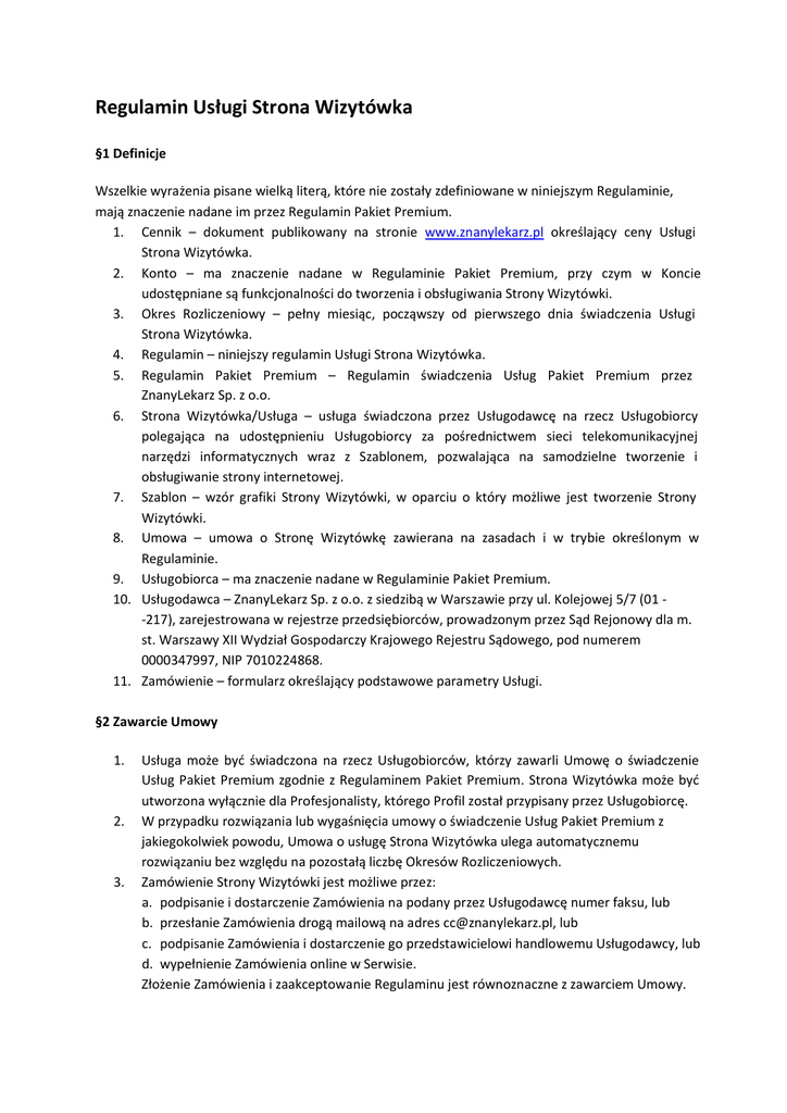 Regulamin Usługi Strona Wizytówka §1 Definicje Wszelkie wyrażenia pisane wielką literą, które nie zostały zdefiniowane w niniejszym Regulaminie, mają znaczenie nadane im przez Regulamin Pakiet Premium. 1. Cennik – dokument publikowany na stronie www.znanylekarz.pl określający ceny Usługi Strona Wizytówka. 2. Konto – ma znaczenie nadane w Regulaminie Pakiet Premium, przy czym w Koncie udostępniane są funkcjonalności do tworzenia i obsługiwania Strony Wizytówki. 3. Okres Rozliczeniowy – pełny miesiąc, począwszy od pierwszego dnia świadczenia Usługi Strona Wizytówka. 4. Regulamin – niniejszy regulamin Usługi Strona Wizytówka. 5. Regulamin Pakiet Premium – Regulamin świadczenia Usług Pakiet Premium przez ZnanyLekarz Sp. z o.o. 6. Strona Wizytówka/Usługa – usługa świadczona przez Usługodawcę na rzecz Usługobiorcy polegająca na udostępnieniu Usługobiorcy za pośrednictwem sieci telekomunikacyjnej narzędzi informatycznych wraz z Szablonem, pozwalająca na samodzielne tworzenie i obsługiwanie strony internetowej. 7. Szablon – wzór grafiki Strony Wizytówki, w oparciu o który możliwe jest tworzenie Strony Wizytówki. 8. Umowa – umowa o Stronę Wizytówkę zawierana na zasadach i w trybie określonym w Regulaminie. 9. Usługobiorca – ma znaczenie nadane w Regulaminie Pakiet Premium. 10. Usługodawca – ZnanyLekarz Sp. z o.o. z siedzibą w Warszawie przy ul. Kolejowej 5/7 (01 ‐217), zarejestrowana w rejestrze przedsiębiorców, prowadzonym przez Sąd Rejonowy dla m. st. Warszawy XII Wydział Gospodarczy Krajowego Rejestru Sądowego, pod numerem 0000347997, NIP 7010224868. 11. Zamówienie – formularz określający podstawowe parametry Usługi. §2 Zawarcie Umowy 1. 2. 3. Usługa może być świadczona na rzecz Usługobiorców, którzy zawarli Umowę o świadczenie Usług Pakiet Premium zgodnie z Regulaminem Pakiet Premium. Strona Wizytówka może być utworzona wyłącznie dla Profesjonalisty, którego Profil został przypisany przez Usługobiorcę. W przypadku rozwiązania lub wygaśnięcia umowy o świadczenie Usług Pakiet Premium z jakiegokolwiek powodu, Umowa o usługę Strona Wizytówka ulega automatycznemu rozwiązaniu bez względu na pozostałą liczbę Okresów Rozliczeniowych. Zamówienie Strony Wizytówki jest możliwe przez: a. podpisanie i dostarczenie Zamówienia na podany przez Usługodawcę numer faksu, lub b. przesłanie Zamówienia drogą mailową na adres [email protected], lub c. podpisanie Zamówienia i dostarczenie go przedstawicielowi handlowemu Usługodawcy, lub d. wypełnienie Zamówienia online w Serwisie. Złożenie Zamówienia i zaakceptowanie Regulaminu jest równoznaczne z zawarciem Umowy. 4. 5. Wypełniając Zamówienie Usługobiorca w szczególności: a. może dokonać wyboru domeny pod którą prezentowana będzie Strona Wizytówka – wybór domeny zależy od jej dostępności. W przypadku wyboru domeny jej zakupu we własnym imieniu i na swoją rzecz dokonuje Usługodawca. b. może wskazać posiadaną przez siebie domenę jako właściwą dla Strony Wizytówki. W takim przypadku Usługobiorca zobowiązany jest dokonać przekierowania domeny do Strony Wizytówki. Rozpoczęcie świadczenia Usługi następuje w dniu opublikowania Strony Wizytówki. Od tego dnia rozpoczyna bieg Okres Rozliczeniowy. §3 Prawa i obowiązki Usługobiorcy i Usługodawcy 1. 2. 3. 4. 5. 6. 7. 8. Usługobiorca zobowiązuje się do wprowadzenia wszelkich danych i treści niezbędnych dla prawidłowego opublikowania Strony Wizytówki. Wprowadzenie danych powinno nastąpić w czasie 72 godzin od chwili wypełnienia Zamówienia. Brak wprowadzenia danych nie wstrzymuje rozpoczęcia świadczenia Usługi. W Serwisie Usługobiorca może dokonać wyboru Szablonu oraz parametrów technicznych Strony Wizytówki. Usługodawca zobowiązuje się do publikacji Strony Wizytówki w terminie 24 godzin od chwili wprowadzenia danych i treści, o których mowa w ust. 1 powyżej. W przypadku wyboru lub przypisania domeny, czas ten ulega wydłużeniu do 5 dni roboczych. Wprowadzając dane i treści, Usługobiorca wyraża zgodę na ich publikację na Stronie Wizytówce. Usługobiorca przyjmuje do wiadomości, że dane te mogą być indeksowane przez wyszukiwarki, a także mogą posłużyć do promowania Usługodawcy. Usługobiorca upoważnia Usługodawcę do edytowania i poprawiania wprowadzonych danych i treści. Poprawianie i edytowanie danych i treści może nastąpić w celu poprawy ich jakości (graficznej lub merytorycznej). Wprowadzając dane i treści Usługobiorca oświadcza, że są one prawdziwe i zgodne z prawem. Usługobiorca nie może wprowadzać danych i treści sprzecznych z prawem lub nieprawdziwych, a także naruszających regulacje korporacyjne obowiązujące Usługobiorcę. Zabrania się również wprowadzania danych i treści naruszających dobre obyczaje, naruszających dobre imię Usługodawcy lub innych podmiotów, a także zawierających słowa powszechnie uznane za wulgarne lub obraźliwe. Usługobiorca, który w celu prawidłowej realizacji Usługi dostarcza treści lub materiały stanowiące utwory w rozumieniu ustawy z dnia 4 lutego 1994 r. o prawie autorskim i prawach pokrewnych oświadcza, że dysponuje prawem lub zgodami niezbędnymi do ich rozpowszechnienia oraz że utwory te nie naruszają praw osób trzecich, a w szczególności autorskich praw majątkowych ani praw własności przemysłowej. Wprowadzając utwory Usługobiorca udziela Usługodawcy niewyłącznej, nieograniczonej w czasie, nieodpłatnej licencji na korzystanie z treści i materiałów na terytorium całego świata, na polach eksploatacji takich jak: zwielokrotnianie techniką analogową i cyfrową, wprowadzanie do pamięci komputera, wprowadzanie do sieci komputerowej lub multimedialnej, wprowadzanie do obrotu, najem, dzierżawa, publiczne udostępnianie w miejscu i czasie wybranym przez 9. 10. 11. 12. 13. 14. Usługodawcę, wyświetlanie, nadawanie, 