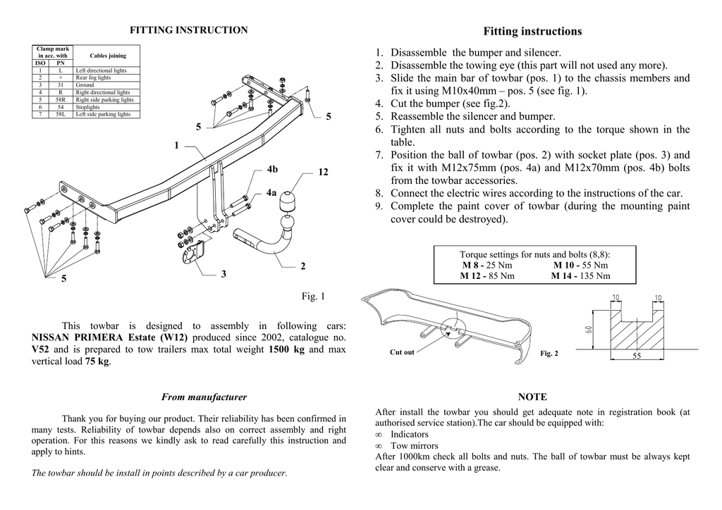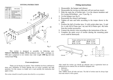 FITTING INSTRUCTION Clamp mark in acc. with ISO PN 1 L 2 + 3 31 4 R 5 58R 6 54 7 58L Fitting instructions Cables joining Left directional lights Rear fog lights Ground Right directional lights Right side parking lights Stoplights Left side parking lights 5 5 1 4b 12 4a 5 3 1. Disassemble the bumper and silencer. 2. Disassemble the towing eye (this part will not used any more). 3. Slide the main bar of towbar (pos. 1) to the chassis members and fix it using M10x40mm – pos. 5 (see fig. 1). 4. Cut the bumper (see fig.2). 5. Reassemble the silencer and bumper. 6. Tighten all nuts and bolts according to the torque shown in the table. 7. Position the ball of towbar (pos. 2) with socket plate (pos. 3) and fix it with M12x75mm (pos. 4a) and M12x70mm (pos. 4b) bolts from the towbar accessories. 8. Connect the electric wires according to the instructions of the car. 9. Complete the paint cover of towbar (during the mounting paint cover could be destroyed). Torque settings for nuts and bolts (8,8): M 8 - 25 Nm M 10 - 55 Nm M 12 - 85 Nm M 14 - 135 Nm 2 Fig. 1 This towbar is designed to assembly in following cars: NISSAN PRIMERA Estate (W12) produced since 2002, catalogue no. V52 and is prepared to tow trailers max total weight 1500 kg and max vertical load 75 kg. From manufacturer Thank you for buying our product. Their reliability has been confirmed in many tests. Reliability of towbar depends also on correct assembly and right operation. For this reasons we kindly ask to read carefully this instruction and apply to hints. The towbar should be install in points described by a car producer. Cut out Fig. 2 55 NOTE After install the towbar you should get adequate note in registration book (at authorised service station).The car should be equipped with: • Indicators • Tow mirrors After 1000km check all bolts and nuts. The ball of towbar must be always kept clear and conserve with a grease. PPUH AUTO-HAK S.J. Towbar accessories: Produkcja Haków Holowniczych Henryk & Zbigniew Nejman 76-200 SŁUPSK ul. Słoneczna 16K tel/fax (059) 8-414-414; 8-414-413 E-mail: [email protected] www.autohak.com.pl Towing hitch (without electrical set) Class: A50-X Cat. no. V52 Technical data: D-value: 8,30 kN maximum trailer weight: 1500 kg maximum vertical cup load: 75 kg Designed for: Manufacturer: NISSAN Model: PRIMERA Type: ESTATE W12 produced since 2002 Approval number acc. to regulations EKG/ONZ 55.01: E20-55R-01 0991 Foreword This towbar is designed according to rules of safety traffic regulations. The towing hitch is a safety component and can be install only by qualified personnel. Any alteration or conversion of the towing hitch is prohibited and would lead to cancellation of design certification. Remove insulating compound and underseal from vehicle (if present) in the area of the matting surfaces of the towing hitch. The vehicle manufacturer’s specifications regarding trailer load and max. vertical cup load are decisive for driving, and values for the towing hitch cannot be exceeded. D-value formula: Max trailer weight [kg] x Max vehicle weight [kg] Max trailer weight [kg] + Max vehicle weight [kg] X 9,81 1000 = D [kN] INSTRUCTION De montage et d’exploitation du dispositif d'attelage à boule Désignation de borne selon la norme ISO PN 1 L 2 3 + 31 4 R 5 6 7 58R 54 58L Instructions de montage 1. Pour monter l’attelage il faut démonter le pare-chocs et le silencieux. 2. Desserrer l’anneau de remorquage, il ne sera plus utilisé. 3. Faire glisser la poutre de l’attelage (pos.1) dans les longerons et serrer à l’aide des vis M10x40mm (pos. 5) comme indiqué sur le dessin 1. 4. Découper un fragment du pare-chocs (voir le dessin 2). Monter le parechocs et le silencieux. Connexion des câbles Pour indicateurs de direction gauche Feux de brouillard arrière Au poids du véhicule Pour indicateurs de direction droite Feux de circulation droites Pour feux de freinage Feux de circulation gauches 5 5 1 4b 12 découper Dessin 2 55 4a 2 5 Dessin 1 3 Le dispositif d'attelage à boule est conçu pour être monté dans la voiture: NISSAN PRIMERA COMBI (W12), produit à partir de 2002, numéro de catalogue V52 et est utilisé pour tirer des remorques du poids total 1500 kg et de la pression totale sur la boule max 75 kg. 5. Serrer la boule d’attelage (pos.2) avec la tôle sous la prise (pos.3) à l’aide des vis M12x75mm (pos. 4a) et M12x70mm (pos. 4b). 6. Serrer toutes les vis aux couples de serrage, comme indiqué dans le tableau. 7. Connecter les câbles de la prise 7 – à l'installation électrique en conformité avec les instructions d'une usine automobile (recommandé la mise en œuvre d’une station-service autorisée). 8. Remplir des pertes de peinture causées durant l'installation. Couples de serrage recommandé pour les vis et les écrous 8,8: M6 - 11 Nm M 8 - 25 Nm M 10 - 50 Nm M 12 - 87 Nm M 14 - 138 Nm M16 - 210 Nm Attention DE LA PART DU FABRICANT Merci d'avoir choisi le dispositif d'attelage à boule produit par notre société. Son fiabilité a été confirmée dans de nombreux tests et par les opinions des clients satisfaits. Toutefois, la fiabilité des dispositifs d'attelage à boule dépend aussi d'installation et d’exploitation correcte. Pour cette raison, nous vous demandons de lire attentivement cette instruction de montage et de respecter les conseils. Le dispositif d'attelage à boule doit être monté dans des emplacements prévus a ce but par le fabricant de voiture. Après le montage du dispositif d'attelage à boule, il faut obtenir l’inscription dans le certificat d’immatriculation de vehicule à la station de contrôle technique, adéquate au domicile. Le véhicule doit être équipé de : - indicateurs de direction latéraux - retroviseurs exterieurs, elles doivent couvrir au moins la largeur de remorque Vérifier le serrage de toute la boulonnerie après 1 000 km de traction. La boule d'attelage doit être maintenue propre et conservée de graisse consistente. PPU