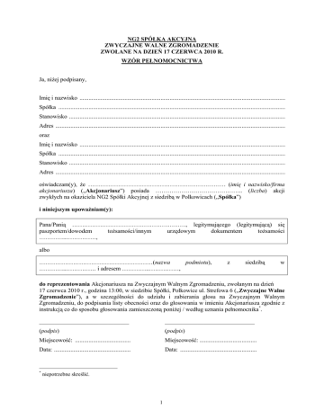 NG2 SPÓŁKA AKCYJNA ZWYCZAJNE WALNE ZGROMADZENIE ZWOŁANE NA DZIEŃ 17 CZERWCA 2010 R. WZÓR PEŁNOMOCNICTWA Ja, niżej podpisany, Imię i nazwisko ......................................................................................................................................... Spółka ....................................................................................................................................................... Stanowisko ................................................................................................................................................ Adres ......................................................................................................................................................... oraz Imię i nazwisko ......................................................................................................................................... Spółka ....................................................................................................................................................... Stanowisko ................................................................................................................................................ Adres ......................................................................................................................................................... oświadczam(y), że …………………………………………………………… (imię i nazwisko/firma akcjonariusza) („Akcjonariusz”) posiada …………………………………….. (liczba) akcji zwykłych na okaziciela NG2 Spółki Akcyjnej z siedzibą w Polkowicach („Spółka”) i niniejszym upoważniam(y): Pana/Panią …………………………………………………, legitymującego (legitymującą) się paszportem/dowodem tożsamości/innym urzędowym dokumentem tożsamości …………..……………, albo …………………………………………………(nazwa podmiotu), …………..…………… i adresem …………..……………, z siedzibą w do reprezentowania Akcjonariusza na Zwyczajnym Walnym Zgromadzeniu, zwołanym na dzień 17 czerwca 2010 r., godzina 13:00, w siedzibie Spółki, Polkowice ul. Strefowa 6 („Zwyczajne Walne Zgromadzenie”), a w szczególności do udziału i zabierania głosu na Zwyczajnym Walnym Zgromadzeniu, do podpisania listy obecności oraz do głosowania w imieniu Akcjonariusza zgodnie z instrukcją co do sposobu głosowania zamieszczoną poniżej / według uznania pełnomocnika *. ______________________________ ______________________________ (podpis) (podpis) Miejscowość: ..................................... Miejscowość: ...................................... Data: ................................................... Data: ................................................... * niepotrzebne skreślić. 1 WAŻNE INFORMACJE: Identyfikacja Akcjonariusza W celu identyfikacji Akcjonariusza udzielającego pełnomocnictwa, do niniejszego pełnomocnictwa powinna zostać załączona: (i) w przypadku akcjonariusza będącego osobą fizyczną - kopia dowodu osobistego, paszportu lub innego urzędowego dokumentu potwierdzającego tożsamość akcjonariusza; albo (ii) w przypadku akcjonariusza innego niż osoba fizyczna – kopia odpisu z właściwego rejestru lub innego dokumentu potwierdzającego upoważnienie osoby fizycznej (lub osób fizycznych) do reprezentowania Akcjonariusza na Zwyczajnym Walnym Zgromadzeniu (np. nieprzerwany ciąg pełnomocnictw). W przypadku wątpliwości co do prawdziwości kopii wyżej wymienionych dokumentów, Zarząd zastrzega sobie prawo do żądania od pełnomocnika okazania przy sporządzaniu listy obecności: (i) w przypadku akcjonariusza będącego osobą fizyczną – kopii potwierdzonej za zgodność z oryginałem przez notariusza lub inny podmiot uprawniony do potwierdzania za zgodność z oryginałem kopii dowodu osobistego, paszportu lub innego urzędowego dokumentu potwierdzającego tożsamość akcjonariusza; albo (ii) w przypadku akcjonariusza innego niż osoba fizyczna - oryginału lub kopii potwierdzonej za zgodność z oryginałem przez notariusza lub inny podmiot uprawniony do potwierdzania za zgodność z oryginałem odpisu z właściwego rejestru lub innego dokumentu potwierdzającego upoważnienie osoby fizycznej (lub osób fizycznych) do reprezentowania pełnomocnika na Zwyczajnym Walnym Zgromadzeniu (np. nieprzerwany ciąg pełnomocnictw). Identyfikacja pełnomocnika W celu identyfikacji pełnomocnika, Zarząd zastrzega sobie prawo do żądania od pełnomocnika okazania przy sporządzaniu listy obecności: (i) w przypadku pełnomocnika będącego osobą fizyczną - dowodu osobistego, paszportu lub innego urzędowego dokumentu potwierdzającego tożsamość pełnomocnika; albo (ii) w przypadku pełnomocnika innego niż osoba fizyczna - oryginału lub kopii potwierdzonej za zgodność z oryginałem przez notariusza lub inny podmiot uprawniony do potwierdzania za zgodność z oryginałem odpisu z właściwego rejestru lub innego dokumentu potwierdzającego upoważnienie osoby fizycznej (osób fizycznych) do reprezentowania akcjonariusza na Zwyczajnym Walnym Zgromadzeniu (np. nieprzerwany ciąg pełnomocnictw). ZWRACAMY UWAGĘ, ŻE W PRZYPADKU ROZBIEŻNOŚCI POMIĘDZY DANYMI AKCJONARIUSZA WSKAZANYMI W PEŁNOMOCNICTWIE A DANYMI ZNAJDUJĄCYMI SIĘ NA LIŚCIE AKCJONARIUSZY SPORZĄDZONEJ W OPARCIU O WYKAZ OTRZYMANY OD PODMIOTU PROWADZĄCEGO DEPOZYT PAPIERÓW WARTOŚCIOWYCH (KRAJOWY DEPOZYT PAPIERÓW WARTOŚCIOWYCH S.A.) I PRZEKAZANEGO SPÓŁCE ZGODNIE Z ART. 4063 KODEKSU SPÓŁEK HANDLOWYCH, AKCJONARIUSZ MOŻE NIE ZOSTAĆ DOPUSZCZONY DO UCZESTNICTWA W ZWYCZAJNYM WALNYM ZGROMADZENIU. ZWRACAMY UWAGĘ, ŻE SPÓŁKA NIE NAKŁADA OBOWIĄZKU UDZIELANIA PEŁNOMOCNICTWA NA POWYŻSZYM FORMULARZU. 2 INSTRUKCJA DOTYCZĄCA WYKONYWANIA PRAWA GŁOSU PRZEZ PEŁNOMOCNIKA Zwyczajne Walne Zgromadzenie NG2 Sp
