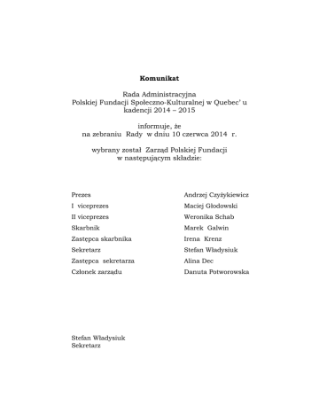 Komunikat Rada Administracyjna Polskiej Fundacji Społeczno-Kulturalnej w Quebec’ u kadencji 2014 – 2015 informuje, że na zebraniu Rady w dniu 10 czerwca 2014 r. wybrany został Zarząd Polskiej Fundacji w następującym składzie: Prezes Andrzej Czyżykiewicz I viceprezes Maciej Głodowski II viceprezes Weronika Schab Skarbnik Marek Galwin Zastępca skarbnika Irena Krenz Sekretarz Stefan Władysiuk Zastępca sekretarza Alina Dec Członek zarządu Danuta Potworowska Stefan Władysiuk Sekretarz