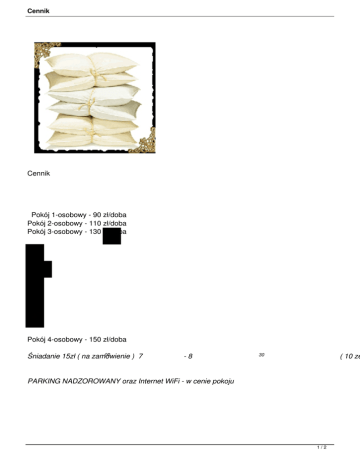 Cennik Cennik Pokój 1-osobowy - 90 zł/doba Pokój 2-osobowy - 110 zł/doba Pokój 3-osobowy - 130 zł/doba Pokój 4-osobowy - 150 zł/doba 00 Śniadanie 15zł ( na zamówienie ) 7 -8 ( 10 ze 30 PARKING NADZOROWANY oraz Internet WiFi - w cenie pokoju 1/2 Cennik Serdecznie Zapraszamy 2/2