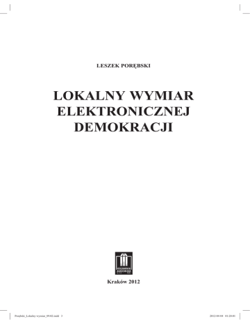 LESZEK POR BSKI LOKALNY WYMIAR ELEKTRONICZNEJ DEMOKRACJI Kraków 2012 Por bski_Lokalny wymiar_09.02.indd 3 2012-04-04 01:20:01 SPIS TRE!CI Wprowadzenie ................................................................................................................... 7 Rozdzia! 1 Nowe technologie a przemiany "ycia spo!ecznego .......................................................... 13 1.1. Nowy, cyfrowy #wiat .......................................................................................... 13 1.2. Na drodze ku spo!ecze$stwu informacyjnemu ................................................... 20 Rozdzia! 2 Nowe technologie w sferze polityki ................................................................................. 2.1. Poj cie „elektroniczna demokracja” i jego istota ................................................ 2.2. G!ówne aspekty elektronicznej demokracji ........................................................ 2.3. Elektroniczna administracja ................................................................................ 31 31 40 51 Rozdzia! 3 Nowe technologie w funkcjonowaniu instytucji publicznych .......................................... 59 3.1. G!ówne funkcje, formy i etapy rozwojowe elektronicznej administracji ........... 59 3.2. Koncepcje oceny wykorzystania nowych technologii przez instytucje publiczne ............................................................................................................. 70 Rozdzia! 4 Zaawansowanie rozwoju elektronicznej administracji w badaniach empirycznych ........ 81 4.1. G!ówne rodzaje bada$ ......................................................................................... 81 4.2. Badania UNDESA ............................................................................................... 84 4.3. Badania Capgemini dla Komisji Europejskiej .................................................... 88 4.4. Badania Uniwersytetu Brown ............................................................................. 92 4.5. Badania najwi kszych metropolii ....................................................................... 97 4.6. Polska w badaniach poziomu zaawansowania elektronicznej administracji ...... 102 Rozdzia! 5 Polski system samorz%du terytorialnego ........................................................................... 109 5.1. Przemiany systemu samorz%du terytorialnego w III RP ..................................... 109 5.2. Pozycja powiatu w systemie samorz%du terytorialnego ...................................... 113 Rozdzia! 6 Wykorzystanie nowych technologii przez polskie instytucje samorz%dowe jako przedmiot bada$ ........................................................................................................ 119 6.1. Metodologia i wyniki dotychczasowych bada$ rozwoju elektronicznej administracji w polskich instytucjach samorz%dowych ...................................... 119 6.2. Analiza witryn powiatów ziemskich. Cel, zakres i metoda bada$ ...................... 125 Por bski_Lokalny wymiar_09.02.indd 5 2012-04-04 01:20:02 Rozdzia! 7 Powiaty w Internecie. Dost pno#& g!ównych typów informacji i serwisów .................... 133 7.1. Zawarto#& witryn powiatowych. Wyniki sumaryczne ........................................ 133 7.2. Funkcja informacyjna .......................................................................................... 141 7.3. Funkcja promocyjna ............................................................................................ 150 7.4. Funkcja konsultacyjna ......................................................................................... 156 7.5. Funkcja us!ugowa ................................................................................................ 163 7.6. Multimedialno#& i dost pno#& witryn dla niepe!nosprawnych ........................... 167 7.7. Witryny powiatowe a Biuletyny Informacji Publicznej. Porównawcza analiza zawarto#ci ............................................................................................................ 171 Rozdzia! 8 Powiaty w Internecie. Ró"nice terytorialne i ich determinanty ........................................ 177 8.1. Ocena zawarto#ci witryn samorz%dowych a wybrane czynniki spo!eczne i ekonomiczne ..................................................................................................... 178 8.2. Zaawansowanie rozwoju elektronicznej administracji w powiatowych instytucjach samorz%dowych. Ró"nice terytorialne ............................................ 182 8.3. Zwyci zcy i przegrani. Ranking zaawansowania sieciowej oferty samorz%dów ........................................................................................................ 187 8.4. Indeks Zaawansowania Elektronicznej Administracji ........................................ 200 8.5. Najlepsze witryny powiatowe w Polsce .............................................................. 206 Summary. Local Dimension of E-Democracy .................................................................. 211 Aneks ................................................................................................................................ 215 Spis tabel ........................................................................................................................... 231 Spis wykresów .................................................................................................................. 233 Wykaz literatury cytowanej w tek#cie .............................................................................. 235 Indeks osobowy ................................................................................................................ 249 Por bski_Lokalny wymiar_09.02.indd 6 2012-04-04 01:20:02 WPROWADZENIE Gwa!towny rozwój Internetu i innych technologii informacyjnych i komunikacyjnych (Information and Communication Technologies – ICT), jaki nast%pi! w ostatnich dekadach, zmieni! nie tylko "ycie codzie