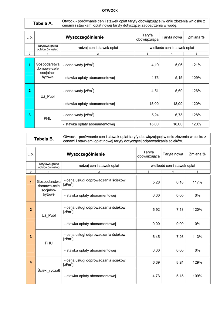 OTWOCK Tabela A. Wyszczególnienie L.p. 0 1 Otwock - porównanie cen i stawek opłat taryfy obowiązującej w dniu złożenia wniosku z cenami i stawkami opłat nowej taryfy dotyczącej zaopatrzenia w wodę. Taryfowa grupa odbiorców usług rodzaj cen i stawek opłat 1 2 Taryfa Taryfa nowa obowiązująca wielkość cen i stawek opłat 3 Gospodarstwa - cena wody [zł/m3] domowe-cele socjalnobytowe - stawka opłaty abonamentowej 3 2 Zmiana % - cena wody [zł/m ] 4 5 4,19 5,06 121% 4,73 5,15 109% 4,51 5,69 126% 15,00 18,00 120% 5,24 6,73 128% 15,00 18,00 120% Uż_Publ - stawka opłaty abonamentowej 3 3 - cena wody [zł/m ] PHU - stawka opłaty abonamentowej Tabela B. Wyszczególnienie L.p. 0 1 Otwock - porównanie cen i stawek opłat taryfy obowiązującej w dniu złożenia wniosku z cenami i stawkami opłat nowej taryfy dotyczącej odprowadzania ścieków. Taryfowa grupa odbiorców usług rodzaj cen i stawek opłat 1 2 usługi odprowadzania ścieków Gospodarstwa - cena 3 ] [zł/m domowe-cele socjalnobytowe - stawka opłaty abonamentowej 2 Taryfa Taryfa nowa obowiązująca Zmiana % wielkość cen i stawek opłat 3 4 5 5,28 6,18 117% 0,00 0,00 0% - cena usługi odprowadzania ścieków 3 [zł/m ] 5,92 7,13 120% - stawka opłaty abonamentowej 0,00 0,00 0% - cena usługi odprowadzania ścieków 3 [zł/m ] 6,45 7,26 113% - stawka opłaty abonamentowej 0,00 0,00 0% - cena usługi odprowadzania ścieków 3 [zł/m ] 6,39 8,24 129% - stawka opłaty abonamentowej 4,73 5,15 109% Uż_Publ 3 PHU 4 Ścieki_ryczałt Tabela C. Ustalenie poziomu niezbędnych przychodów OPWiK (Otwock). Przychody - wykonanie L.p. Wyszczególnienie 0 1 1 Zaopatrzenie w wodę Niezbędne przychody w roku obrachunkowym poprzedzającym wprowadzenie nowych taryf w roku obowiązywania nowych taryf [zł/rok] [zł/12 m-cy] 2 3 2011-04-01 2012-08-01 2012-03-31 2013-07-31 koszty użytkowania i utrzymania, w tym 8 455 475 7 694 404 a) amortyzacja lub odpisy umorzeniowe lub inwestycje ze środków własnych 4 332 813 3 475 244 b) koszty zakupionej wody 0 0 raty kapitałowe ponad wartość amortyzacji, po rozliczeniu 0 0 1 383 212 606 900 4) należności nieregularne 0 0 5) marża zysku 0 0 1) woda 2) woda 3) odsetki wartość niezbędnych przychodów 2 Odprowadzanie ścieków 9 838 687 8 301 304 2011-04-02 2012-07-01 2012-04-01 2013-06-30 11 102 209 10 178 344 2 931 207 1 059 912 0 0 0 0 350 788 2 393 100 4) należności nieregularne 0 0 5) marża zysku 0 0 1) koszty użytkowania i utrzymania, w tym a) amortyzacja lub odpisy umorzeniowe lub inwestycje ze środków własnych b) koszty odprowadzania ścieków do urządzeń nie będących w posiadaniu przedsiębiorstwa raty kapitałowe ponad wartość amortyzacji, po rozliczeniu ścieki 2) ścieki 3) odsetki wartość niezbędnych przychodów 11 452 997 12 571 444 3 Średnia zmiana wartości przychodów zaopatrzenie w wodę * 84,37% 4 Średnia zmiana wartości przychodów odprowadzanie ścieków * 109,77% OTWOCK Tabela D. L.p. Alokacja niezbędnych przychodów według taryfowych grup odbiorców usług w roku obowiązywania nowych taryf Wyszczególnienie 0 1 1 2 Zaopatrzenie w wodę wg Tab.E Koszty użytkowania i utrzymywania, Ogółem Otwock - taryfowa grupa odbiorców TGO_1 TGO_2 TGO_3 [zł/okres] [zł/okres] [zł/okres] [zł/okres] 3 4 5 6 Ogółem Gospodarstwa domowe-cele socjalnobytowe Uż_Publ PHU * 7 694 404 zł 5 897 162 zł 861 040 zł 936 202 zł * 7 615 428 zł 5 833 594 zł 852 779 zł 929 055 zł - amortyzacja lub odpisy umorzeniowe, lub Inwestycje ze środków własnych A 3 472 061 zł 2 794 682 zł 363 208 zł 314 170 zł - wynagrodzenie z narzutami B2 993 374 zł 510 605 zł 158 176 zł 324 593 zł - materiały A 385 827 zł 310 554 zł 40 361 zł 34 912 zł - energia A 546 644 zł 439 997 zł 57 184 zł 49 463 zł - opłata za korzystanie ze środowiska B 142 969 zł 107 935 zł 16 833 zł 18 201 zł - podatki i opłaty - inne A 1 897 473 zł 1 527 287 zł 198 493 zł 171 693 zł - usługi obce A 170 655 zł 137 361 zł 17 852 zł 15 442 zł - pozostałe koszty A 6 425 zł 5 172 zł 672 zł 581 zł * 78 976 zł 63 568 zł 8 262 zł 7 146 zł - rozliczenie kosztów wydziałowych i działalności pomocniczej A 33 991 zł 27 360 zł 3 556 zł 3 076 zł - alokowane koszty ogólne A 44 985 zł 36 209 zł 4 706 zł 4 070 zł A 0 zł 0 zł 0 zł 0 zł 3) odsetki A 606 900 zł 488 497 zł 63 487 zł 54 916 zł 4) należności nieregularne A 0 zł 0 zł 0 zł 0 zł 5) marża zysku A 0 zł 0 zł 0 zł 0 zł Razem - podstawa planowania niezbędnych przychodów * 8 301 304 zł 6 385 659 zł 924 528 zł 991 117 zł 1) w tym: a) koszty bezpośrednie: b) alokowane koszty pośrednie #### Współczynnik alokacji 2) raty kapitałowe ponad wartość amortyzacji Gospodarstwa domowe-cele socjalnobytowe wg Tab.E Ogółem Koszty użytkowania i utrzymywania, w tym: * 10 178 344 zł 6 305 175 zł 1 229 854 zł 1 004 641 zł a) koszty bezpośrednie: * 6 308 515 zł 3 663 562 zł 798 141 zł 659 712 zł - amortyzacja lub odpisy umorzeniowe lub Inwestycje ze środków własnych C 903 955 zł 617 055 zł 100 844 zł 80 572 zł - wynagrodzenie z narzutami D2 1 115 305 zł 552 410 zł 13 049 zł 104 839 zł - materiały D2 294 280 zł 145 757 zł 3 443 zł 27 662 zł - energia D2 374 614 zł 185 546 zł 4 383 zł 35 214 zł - opłata za korzystanie ze środowiska D 91 891 zł 54 256 zł 17 734 zł 10 627 zł - podatki i opłaty - inne D 3 255 070 zł 1 921 909 zł 628 188 zł 376 430 zł - usługi obce C 269 055 zł 183 661 zł 30 015 zł 23 982 zł - pozostałe koszty C 4 345 zł 2 966 zł 485 zł 387 zł * 3 869 829 zł 2 641 613 zł 431 714 zł 344 928 zł - rozliczenie kosztów wydziałowych i działalności pomocniczej C 1 665 573 zł 1 136 949 zł 185 809 zł 148 457 zł - alokowane koszty ogólne C 2 204 256 zł 1 504 664 zł 245 904 zł 196 471 zł C 0 zł 0 zł 0 zł 0 zł 3) odsetki C 2 393 100 zł 1 633 572 zł 266 971 zł 213 304 zł 4) należności nieregularne C 0 zł 0 zł 0 zł 0 zł 5) m