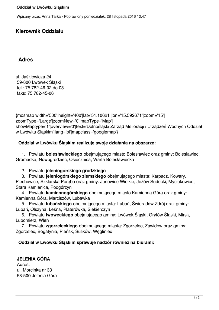 Oddział w Lwówku Śląskim sprawuje nadzór również na biurami:
