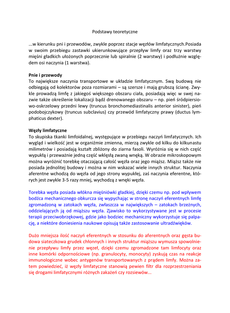 Podstawy teoretyczne ...w kierunku pni i przewodów, zwykle poprzez stacje węzłów limfatycznych.Posiada w swoim przebiegu zastawki ukierunkowujące przepływ limfy oraz trzy warstwy mięśni gładkich ułożonych poprzecznie lub spiralnie (2 warstwy) i podłużnie względem osi naczynia (1 warstwa). Pnie i przewody To największe naczynia transportowe w układzie limfatycznym. Swą budową nie odbiegają od kolektorów poza rozmiarami – są szersze i mają grubszą ścianę. Zwykle prowadzą limfę z jakiegoś większego obszaru ciała, posiadają więc w swej nazwie także określenie lokalizacji bądź drenowanego obszaru – np. pień śródpiersiowo-oskrzelowy przedni lewy (truncus bronchomediastinalis anterior sinister), pień podobojczykowy (truncus subclavius) czy przewód limfatyczny prawy (ductus lymphaticus dexter). Węzły limfatyczne To skupiska tkanki limfoidalnej, występujące w przebiegu naczyń limfatycznych. Ich wygląd i wielkość jest w organiźmie zmienna, mierzą zwykle od kilku do kilkunastu milimetrów i posiadają kształt zbliżony do ziarna fasoli. Wyróżnia się w nich część wypukłą i przeważnie jedną część wklęsłą zwaną wnęką. W obrazie mikroskopowym można wyróżnić torebkę otaczającą całość węzła oraz jego miąższ. Miąższ także nie posiada jednolitej budowy i można w nim wskazać wiele innych struktur. Naczynia aferentne wchodzą do węzła od jego strony wypukłej, zaś naczynia eferentne, których jest zwykle 3-5 razy mniej, wychodzą z wnęki węzła. Torebka węzła posiada włókna mięśniówki gładkiej, dzięki czemu np. pod wpływem bodźca mechanicznego obkurcza się wypychając w stronę naczyń eferentnych limfę zgromadzoną w zatokach węzła, zwłaszcza w największych – zatokach brzeżnych, oddzielających ją od miąższu węzła. Zjawisko to wykorzystywane jest w procesie terapii przeciwobrzękowej, gdzie jako bodziec mechaniczny wykorzystuje się palpację, a niektóre doniesienia naukowe opisują także zastosowanie ultradźwięków. Dużo mniejsza ilość naczyń eferentnych w stosunku do aferentnych oraz gęsta budowa siateczkowa grudek chłonnych i innych struktur miąższu wymusza spowolnienie przepływu limfy przez węzeł, dzięki czemu zgromadzone tam limfocyty oraz inne komórki odpornościowe (np. granulocyty, monocyty) zyskują czas na reakcje immunologiczne wobec antygenów transportowanych z prądem limfy. Można zatem powiedzieć, iż węzły limfatyczne stanowią pewien filtr dla rozprzestrzeniania się drogami limfatycznymi różnych zakażeń czy rozsiewów...