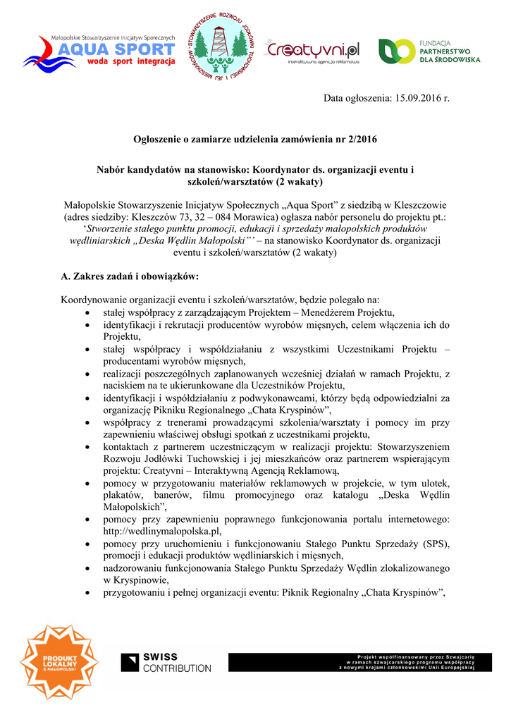 Data ogłoszenia: 15.09.2016 r. Ogłoszenie o zamiarze udzielenia zamówienia nr 2/2016 Nabór kandydatów na stanowisko: Koordynator ds. organizacji eventu i szkoleń/warsztatów (2 wakaty) Małopolskie Stowarzyszenie Inicjatyw Społecznych „Aqua Sport” z siedzibą w Kleszczowie (adres siedziby: Kleszczów 73, 32 – 084 Morawica) ogłasza nabór personelu do projektu pt.: ‘Stworzenie stałego punktu promocji, edukacji i sprzedaży małopolskich produktów wędliniarskich „Deska Wędlin Małopolski”’ – na stanowisko Koordynator ds. organizacji eventu i szkoleń/warsztatów (2 wakaty) A. Zakres zadań i obowiązków: Koordynowanie organizacji eventu i szkoleń/warsztatów, będzie polegało na: • stałej współpracy z zarządzającym Projektem – Menedżerem Projektu, • identyfikacji i rekrutacji producentów wyrobów mięsnych, celem włączenia ich do Projektu, • stałej współpracy i współdziałaniu z wszystkimi Uczestnikami Projektu – producentami wyrobów mięsnych, • realizacji poszczególnych zaplanowanych wcześniej działań w ramach Projektu, z naciskiem na te ukierunkowane dla Uczestników Projektu, • identyfikacji i współdziałaniu z podwykonawcami, którzy będą odpowiedzialni za organizację Pikniku Regionalnego „Chata Kryspinów”, • współpracy z trenerami prowadzącymi szkolenia/warsztaty i pomocy im przy zapewnieniu właściwej obsługi spotkań z uczestnikami projektu, • kontaktach z partnerem uczestniczącym w realizacji projektu: Stowarzyszeniem Rozwoju Jodłówki Tuchowskiej i jej mieszkańców oraz partnerem wspierającym projektu: Creatyvni – Interaktywną Agencją Reklamową, • pomocy w przygotowaniu materiałów reklamowych w projekcie, w tym ulotek, plakatów, banerów, filmu promocyjnego oraz katalogu „Deska Wędlin Małopolskich”, • pomocy przy zapewnieniu poprawnego funkcjonowania portalu internetowego: http://wedlinymalopolska.pl, • pomocy przy uruchomieniu i funkcjonowaniu Stałego Punktu Sprzedaży (SPS), promocji i edukacji produktów wędliniarskich i mięsnych, • nadzorowaniu funkcjonowania Stałego Punktu Sprzedaży Wędlin zlokalizowanego w Kryspinowie, • przygotowaniu i pełnej organizacji eventu: Piknik Regionalny „Chata Kryspinów”, • • • współpracy przy promocji i reklamie Projektu oraz Pikniku, pomocy przy wypracowaniu i zastosowaniu procedury certyfikacyjnej dla produktów regionalnych: Certyfikat „Deska Wędlin Małopolskich” (nazwa certyfikatu może ulec zmianie w toku prowadzonych obecnie ustaleń) oraz później w kontaktach z Uczestnikami Projektu, którzy będą chcieć go zdobyć, uczestnictwie w cyklicznych spotkaniach członków zespołu projektowego w celu omówienia zrealizowanych już działań, dyskusji nad pojawiającymi się problemami i próbie ich rozwiązywania oraz ustalenia planu działań na dalszą część trwania Projektu. B. Warunki: 1. Oczekujemy zgłoszeń od osób z doświadczeniem, wiedzą, umiejętnościami oraz o odpowiednich predyspozycjach, które pozwolą na sprawne i skuteczne realizowanie opisanych powyżej zadań. 2. Wymagane jest doświadczenie lub biegłość w pracach biurowo-administracyjnych (pisma, notatki, projekty umów etc.), znajomość pakietu MS Office oraz narzędzi społecznościowych (konieczna biegłość w posługiwaniu się edytorem tekstu i arkuszem kalkulacyjnym). 3. Samodzielność oraz umiejętność pracy w zespole. C. Warunki szczegółowe umowy: Umowa do końca października 2016 r. Zadaniowość, zatrudnienie na podstawie umowy zlecenia. D. Zainteresowane osoby prosimy o złożenie lub przesłanie CV oraz ewentualnie dodatkowych załączników potwierdzających kwalifikacje, doświadczenie i inne atuty kandydatki lub kandydata do dnia 23 września, do godziny 16.00, na dres mailowy: [email protected] z dopiskiem: ”Dotyczy naboru na stanowisko Koordynator ds. organizacji eventu i szkoleń/warsztatów”.