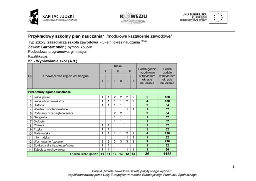 Przykładowy szkolny plan nauczania* /modułowe kształcenie zawodowe/ Typ szkoły: zasadnicza szkoła zawodowa - 3-letni okres nauczania /1/ /2/ Zawód: Garbarz skór ; symbol 753501 Podbudowa programowa: gimnazjum Kwalifikacje: K1 - Wyprawianie skór (A.9.) Klasa I Lp II III Obowiązkowe zajęcia edukacyjne I II I II I II Liczba godzin Liczba tygodniowo godzin w trzyletnim w trzyletnim okresie okresie nauczania nauczania Przedmioty ogólnokształcące 1 2 3 4 5 6 7 8 9 10 11 12 13 14 Język polski 1 1 2 2 2 2 Język obcy nowożytny 1 1 1 1 2 2 Historia 1 1 1 1 Wiedza o społeczeństwie 1 1 Podstawy przedsiębiorczości 2 2 Geografia 1 1 Biologia 1 1 Chemia 1 1 Fizyka 1 1 Matematyka 1 1 1 1 2 2 Informatyka 1 1 Wychowanie fizyczne 3 3 3 3 3 3 Edukacja dla bezpieczeństwa 1 1 Zajęcia z wychowawcą 1 1 1 1 1 1 Łączna liczba godzin 11 11 13 13 12 12 5 4 2 1 2 1 1 1 1 4 1 9 1 3 160 130 64 32 64 32 32 32 32 130 32 290 32 96 36 1158 1 Projekt „Szkoła zawodowa szkołą pozytywnego wyboru” współfinansowany przez Unię Europejską w ramach Europejskiego Funduszu Społecznego Modułowe kształcenie zawodowe ** 1 753501.M1 Przerabianie surowca skórzanego 16 16 16 2 753501.M2 Wykończanie skór 768 16 14 4 17 544 2 8 5 160 2 6 4 128 Łączny wymiar godzin kształcenia zawodowego 16 16 16 16 18 18 50 1600 Tygodniowy wymiar godzin obowiązkowych zajęć edukacyjnych 86 2758 753501.M3 Wykonywanie czyszczenia i odnawianie wyrobów skórzanych 753501.M4 Przygotowanie do prowadzenia 4 działalności produkcyjnej w garbarstwie 3 /1/ 24 27 29 30 do celów obliczeniowych przyjęto 32 tygodnie w ciągu jednego roku szkolnego /2/ w zasadniczej szkole zawodowej praktyczna nauka zawodu realizowana jest w formie zajęć praktycznych *w szkolnym planie uwzględnia się również wymiar godzin zajęć określonych w par. 4 ust. 2 rozporządzenia w sprawie ramowych planów nauczania, t.j. m.in. religii lub etyki oraz wychowania do życia w rodzinie. **dla młodocianych pracowników liczbę dni w tygodniu przeznaczonych na praktyczną naukę zawodu u pracodawcy ustala dyrektor szkoły, z uwzględnieniem przepisów Kodeksu Pracy Egzamin potwierdzający kwalifikację (A.9.) odbywa się pod koniec klasy trzeciej. 2 Projekt „Szkoła zawodowa szkołą pozytywnego wyboru” współfinansowany przez Unię Europejską w ramach Europejskiego Funduszu Społecznego Tabela efektów kształcenia Tabela przyporządkowania poszczególnym modułom efektów kształcenia dla zawodu: klasa I II III Efekty kształcenia /umiejętności, wiedza oraz kompetencje personalne i społeczne/ Uczeń: Efekty wspólne dla wszystkich zawodów / wspólne dla zawodów w ramach obszaru A / kwalifikacje semestr I semestr II semestr I semestr II semestr I semestr II Liczba godzin przeznaczona na realizację efektów kształcenia Numer i nazwa jednostki modułowej Numer i nazwa modułu Garbarz skór; symbol 753501 (1) rozróżnia pojęcia związane z bezpieczeństwem i higieną pracy, ochroną przeciwpożarową, ochroną środowiska i ergonomią; (4) przewiduje zagrożenia dla zdrowia i życia człowieka oraz mienia i środowiska związane z wykonywaniem zadań zawodowych; (6) określa skutki oddziaływania czynników szkodliwych na organizm człowieka (8) stosuje środki ochrony indywidualnej i zbiorowej podczas wykonywania zadań zawodowych; (9) przestrzega zasad bezpieczeństwa i higieny pracy oraz stosuje przepisy prawa dotyczące ochrony przeciwpożarowej i ochrony środowiska; (10) udziela pierwszej pomocy poszkodowanym w wypadkach przy pracy oraz w stanach zagrożenia zdrowia i życia. X X BHP 753501. M1.J1 Przygotowanie do garbowania 753501.M1 Przerabianie surowca skórzanego Kształcenie modułowe X 26 X 3 Projekt „Szkoła zawodowa szkołą pozytywnego wyboru” współfinansowany przez Unię Europejską w ramach Europejskiego Funduszu Społecznego (10) współpracuje w zespole KPS (6) aktualizuje wiedzę i doskonali umiejętności zawodowe X X (1) sporządza szkice i rysunki techniczne, w tym schematy techniczne i technologiczne; (2) posługuje się dokumentacją techniczną oraz instrukcjami obsługi maszyn i urządzeń; X (3) rozróżnia części maszyn i urządzeń; X (5) wyjaśnia zasady działania pomp, wentylatorów i sprężarek; PKZ(A.f) (4) rozróżnia elementy automatyki przemysłowej; X X X (6) charakteryzuje budowę oraz wyjaśnia zasady działania napędów mechanicznych, hydraulicznych, pneumatycznych i elektrycznych X (7) przestrzega zasad konserwacji maszyn i urządzeń; X (8) stosuje programy komputerowe wspomagające wykonywanie zadań. (1) rozpoznaje rodzaje surowców skórzanych oraz określa ich przydatność asortymentową; (2) wykonuje czynności dotyczące konserwacji skór surowych i półproduktów skórzanych; X XXX XXX A.9.(1) (3) wykonuje czynności związane z magazynowaniem surowców skórzanych; 102 (4) obsługuje urządzenia magazynowe (5) posługuje się przyrządami pomiarowymi do określania jakości skór oraz warunków magazynowania. XXX 244 XXX XXX Łączna liczba godzin przeznaczona na jednostkę modułową 753501/311912 M1.J1 372 4 Projekt „Szkoła zawodowa szkołą pozytywnego wyboru” współfinansowany przez Unię Europejską w ramach Europejskiego Funduszu Społecznego BHP XXX XXX (5) wykonuje ręczną i mechaniczną obróbkę skór; A.9.(2) (3) dobiera urządzenia do transportu skór na stanowiska pracy; (4) obsługuje agregaty, maszyny i urządzenia garbarskie; 10 XXX XXX 386 XXX (6) wykonuje czynności związane z kontrolą procesów wyprawy skór; XXX (7) rozsortowuje półprodukty skórzane na określone asortymenty skór; XXX (12) przestrzega zasad ochrony środowiska przed zagrożeniami związanymi z produkcją garbarską. XXX Łączna liczba godzin przeznaczona na jednostkę modułową 753501/311912 M1.J2 396 Łączna liczba godzin przeznaczona na moduł 753501/311912 M1 768 (4) obsługuje agregaty, maszyny i urządzenia garbarskie; X (5) wykonuje ręczną i mechaniczną obr