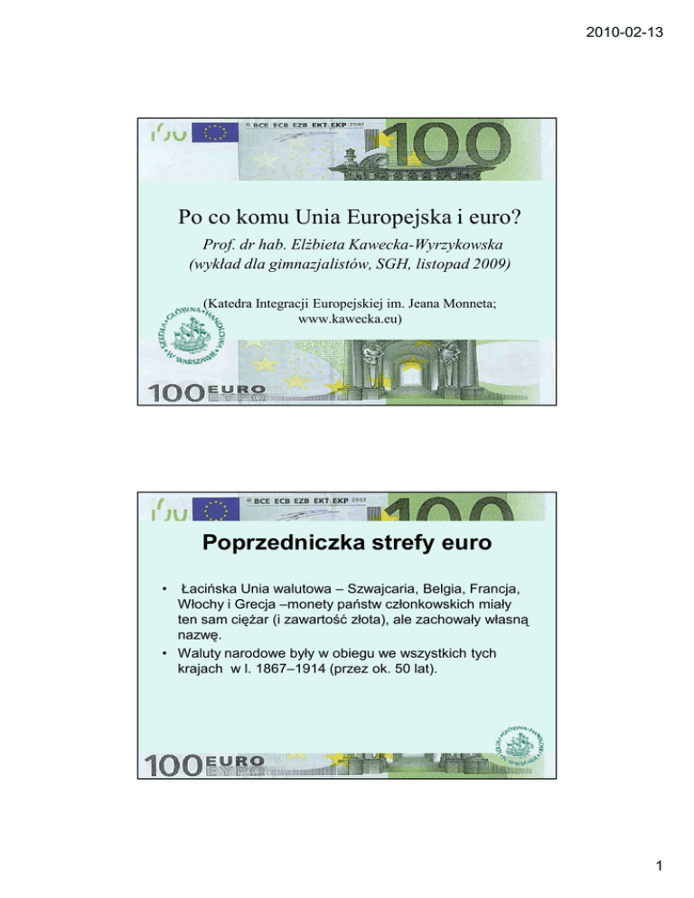 2010-02-13 Po co komu Unia Europejska i euro? Prof. dr hab. ElŜbieta Kawecka-Wyrzykowska (wykład dla gimnazjalistów, SGH, listopad 2009) (Katedra Integracji Europejskiej im. Jeana Monneta; www.kawecka.eu) Poprzedniczka strefy euro • Łacińska Unia walutowa – Szwajcaria, Belgia, Francja, Włochy i Grecja –monety państw członkowskich miały ten sam cięŜar (i zawartość złota), ale zachowały własną nazwę. • Waluty narodowe były w obiegu we wszystkich tych krajach w l. 1867–1914 (przez ok. 50 lat). 1 2010-02-13 Co jest istotą strefy euro? • Wspólna waluta, • Jednolita polityka pienięŜna (cena pieniądza, wielkość w obiegu itp.), • Wspólna (jedna) instytucja prowadząca politykę pienięŜną – Europejski Bank Centralny. • Gdzie poza UE w obiegu jest teŜ euro? Gdzie poza UE w obiegu jest teŜ euro? • Euro - waluta szesnastu krajów Unii Europejskiej, a takŜe Andory, Czarnogóry, Kosowa, Monako, San Marino i Watykanu, takŜe Gujana Francuska , Gwadelupa i kilka innych posiadłości zamorskich Francji. 2 2010-02-13 Czy musimy przyjąć euro? • Polska w UE od 1.05.2004 r. • Polska w unii gospodarczej i walutowej (UGW) od 1.05.2004 r. = musi przyjąć euro; • Kto nie musi przyjąć euro w UE? Kto nie musi przyjąć euro? • Wlk. Brytania i Dania – klauzula opt-out, • Szwecja – powinna, choć nie jest w strefie euro. 3 2010-02-13 Kiedy Polska ma przyjąć euro? • ZaleŜy to od spełnienia warunków: zrównowaŜone finanse publiczne, stabilny kurs waluty, niska inflacja i stopa procentowa. Nominalne kryteria zbieŜności=konwergencji - deficyt budŜetowy nie wyŜszy niŜ 3% PKB, - dług publiczny nie wyŜszy niŜ 60% PKB, - niska inflacja (nie przekracza o więcej niŜ o 1,5 p-u proc. inflacji w 3 krajach UE o najniŜszym wskaźniku wzrostu cen), - długookresowa stopa procentowa nie wyŜsza niŜ o 2 p-y proc. od stopy w 3 państwach o najniŜszej inflacji, - stabilność kursu – (udział w ERM II) – zmiany kursu rynkowego nie wykraczają poza przedział wahań kursu centralnego w ciągu 2 lat. 4 2010-02-13 Dlaczego są te kryteria? • Jeśli jest odmienna sytuacja wyjściowa kandydatów – potrzeba odmiennej polityki ekonomicznej, - np. wysoka inflacja wymaga wysokiej stopy proc., by ograniczyć popyt; - jeśli niekonkurencyjna gospodarka – moŜna osłabić krajową walutę (dewaluacja), by poprawić konkurencyjność cenową; Korzyści UGW: - eliminacja kosztów transakcyjnych (kosztów wymiany, księgowości w kilku walutach – ok. 0,2% PKB), - eliminacja kosztów ryzyka kursowego i kosztów związanych z zabezpieczaniem przed ryzykiem, - daje wzrost dostępności (akumulacja kapitału) i obniŜenie kosztów pozyskiwania kapitału, co prowadzi do napływu kapitału, wzrostu inwestycji, wydajności i PKB, - niska stopa inflacji; 5 2010-02-13 Mankamenty unii walutowej: • musimy zrezygnować ze złotówki jako waluty polskiej, • państwo traci suwerenność w prowadzeniu polityki pienięŜnej. Mankamenty unii walutowej: - Pozbawienie krajów realizacji suwerennej polityki pienięŜnej i kursowej (nie moŜna np. poprawić konkurencyjności eksportu drogą dewaluacji); - Konkurencyjność moŜna poprawić jedynie przez wzrost wydajności pracy i jakości towarów. Jeśli tego nie ma – słabszy wzrost gospodarczy i bezrobocie. Powinno to mobilizować do przepływ kapitału i spadku płac. - Wobec niedoskonałej mobilności czynników produkcji – moŜliwy wzrost deficytu budŜetowego (dla łagodzenia skutków bezrobocia). 6 2010-02-13 Mankamenty – cd. Lub - CięŜar dostosowań (pomoc finansowa) przerzucony jest na inne kraje (transfery z budŜetu wspólnego?). - Optymalny obszar walutowy = pełna mobilność czynników produkcji. - W UGW nie moŜna zwiększyć wydatków budŜetowych nawet uzasadnionych (np. obniŜyć ceny kredytu - dla stymulowania oŜywienia gospodarczego), jeśli nie dotyczy to wszystkich. Pakt Stabilności i Wzrostu (1997 – TA) - Obowiązek równowaŜenia budŜetów pod groźbą sankcji finansowych; - Celem trwała zbieŜność wyników gospodarczych krajów. 7 2010-02-13 Procedura wielostronnego nadzoru i nadmiernego deficytu budŜetowego i ich rola Procedura wielostronnego nadzoru (art. 99 TWE) system wczesnego ostrzegania: - członkowie strefy przygotowują programy stabilności, - nieczłonkowie – programy konwergencji; - wspólnym elementem dla krajów strefy euro i nieczłonków są strategie konsolidacji finansów państwa. 8 2010-02-13 Procedura nadmiernego deficytu (art. 104 TWE) Szybkie działania naprawcze - Ecofin moŜe tu formułować optymalną ścieŜkę konsolidacji fiskalnej. Jest moŜliwość nałoŜenia sankcji, ale tylko wobec krajów strefy euro (za nieprzestrzeganie deficytu, a nie długu), chyba Ŝe deficyt jest „ usprawiedliwiony”, nieczłonkowie strefy euro stoją wobec groźby zablokowania wobec nich Funduszu Spójności. Pakt Stabilności i Wzrostu –cd. - Jeśli deficyt budŜetowy przekracza 3% PKB – depozyt, później kary finansowe dla członków strefy euro. - Grzywna = 0,2% PKB (stały element; max – 0,5% PKB) oraz zmienny – jedna dziesiąta nadwyŜki deficytu ponad 3% PKB. - Deficyt moŜe być bezkarny jeśli wynika z przyczyn wyjątkowych. 9 2010-02-13 UGW w praktyce - W 1998 r. ocena sytuacji w krajach kandydujących przez Komisję i decyzja Rady UE, - 1.01.1999 – usztywnienie kursów walut, - 2002 - zastąpienie walut narodowych przez euro (11 państw + Grecja), - Od 1.01.2007 r. – doszła Słowenia - Od 1.01.2008 – Cypr i Malta - - 1.01.2009 – Słowacja. Dziękuję za uwagę 10