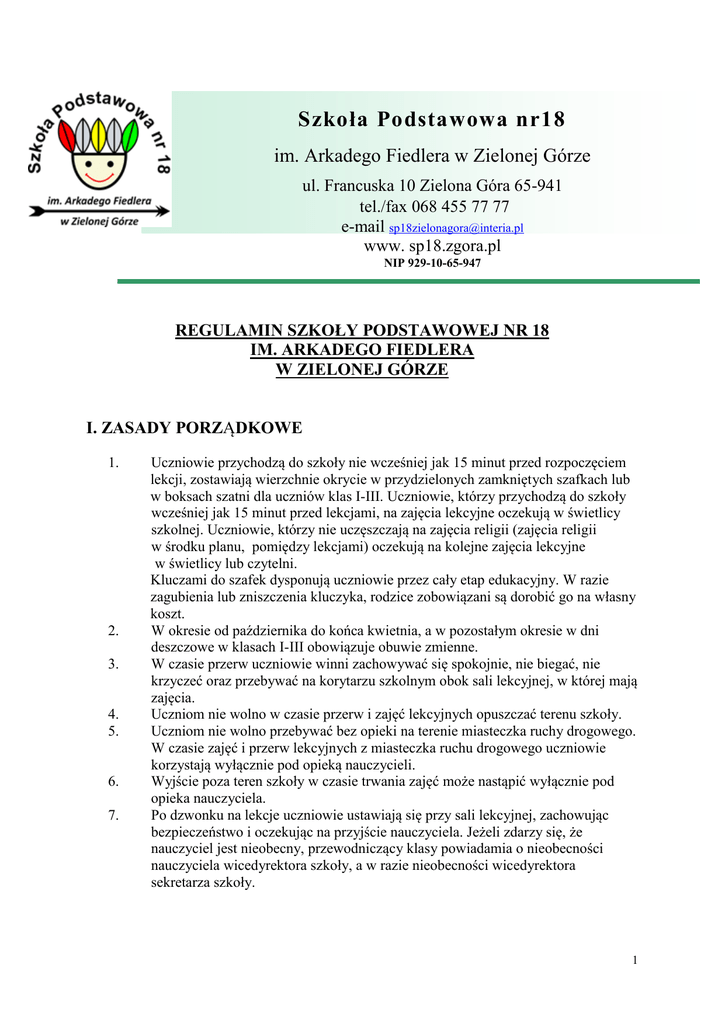 Szkoła Podstawowa nr18 im. Arkadego Fiedlera w Zielonej Górze ul. Francuska 10 Zielona Góra 65-941 tel./fax 068 455 77 77 e-mail [email protected] www. sp18.zgora.pl NIP 929-10-65-947 REGULAMIN SZKOŁY PODSTAWOWEJ NR 18 IM. ARKADEGO FIEDLERA W ZIELONEJ GÓRZE I. ZASADY PORZĄDKOWE 1. 2. 3. 4. 5. 6. 7. Uczniowie przychodzą do szkoły nie wcześniej jak 15 minut przed rozpoczęciem lekcji, zostawiają wierzchnie okrycie w przydzielonych zamkniętych szafkach lub w boksach szatni dla uczniów klas I-III. Uczniowie, którzy przychodzą do szkoły wcześniej jak 15 minut przed lekcjami, na zajęcia lekcyjne oczekują w świetlicy szkolnej. Uczniowie, którzy nie uczęszczają na zajęcia religii (zajęcia religii w środku planu, pomiędzy lekcjami) oczekują na kolejne zajęcia lekcyjne w świetlicy lub czytelni. Kluczami do szafek dysponują uczniowie przez cały etap edukacyjny. W razie zagubienia lub zniszczenia kluczyka, rodzice zobowiązani są dorobić go na własny koszt. W okresie od października do końca kwietnia, a w pozostałym okresie w dni deszczowe w klasach I-III obowiązuje obuwie zmienne. W czasie przerw uczniowie winni zachowywać się spokojnie, nie biegać, nie krzyczeć oraz przebywać na korytarzu szkolnym obok sali lekcyjnej, w której mają zajęcia. Uczniom nie wolno w czasie przerw i zajęć lekcyjnych opuszczać terenu szkoły. Uczniom nie wolno przebywać bez opieki na terenie miasteczka ruchy drogowego. W czasie zajęć i przerw lekcyjnych z miasteczka ruchu drogowego uczniowie korzystają wyłącznie pod opieką nauczycieli. Wyjście poza teren szkoły w czasie trwania zajęć może nastąpić wyłącznie pod opieka nauczyciela. Po dzwonku na lekcje uczniowie ustawiają się przy sali lekcyjnej, zachowując bezpieczeństwo i oczekując na przyjście nauczyciela. Jeżeli zdarzy się, że nauczyciel jest nieobecny, przewodniczący klasy powiadamia o nieobecności nauczyciela wicedyrektora szkoły, a w razie nieobecności wicedyrektora sekretarza szkoły. 1 8. 9. 10. 11. 12. 13. 14. 15. 16. 17. 18. 19. 20. 21. 22. W czasie nieobecności nauczyciela lekcje prowadzi inny nauczyciel, wyznaczony przez wicedyrektora lub uczniowie stosują się do poleceń wicedyrektora i przebywają pod opieką nauczyciela w czytelni lub świetlicy szkolnej. Po zakończonych zajęciach lekcyjnych lub pozalekcyjnych uczniowie niezwłocznie udają się do domu lub przebywają na terenie szkoły w świetlicy pod opieką nauczyciela. Uczniowie, którzy nie ukończyli 7 lat, po zajęciach lekcyjnych przebywają w świetlicy lub odbierani są przez upoważnione osoby. Rodzice/ opiekunowie tych uczniów na początku roku szkolnego składają oświadczenia, które zawierają informacje o sposobie odbioru dziecka ze szkoły. Rodzice uczniów, którzy ukończyli 7 lat (klasy I-VI) na początku roku szkolnego składają oświadczenie, które zawiera informacje o sposobie powrotu dziecka ze szkoły. Uczniowie powinni aktywnie uczestniczyć w lekcji, przestrzegając zasad kulturalnego zachowania. Po zakończeniu lekcji uczniowie zostawiają salę lekcyjną w ładzie i czystości. Laureaci konkursów wewnątrzszkolnych i międzyszkolnych zobowiązani są do reprezentowania szkoły. Uczniowie nie powinni przynosić do szkoły wartościowych przedmiotów, gdyż szkoła nie ponosi odpowiedzialności za ich uszkodzenie, zniszczenie lub kradzież. Na terenie szkoły obowiązuje zakaz korzystania w czasie lekcji z telefonów komórkowych, aparatów MP3 oraz bezwzględny zakaz nagrywania i filmowania. W przypadku używania przez uczniów w czasie lekcji urządzeń wymienionych w pkt. 12, nauczyciel ma prawo je odebrać i powiadomić o tym fakcie rodziców (opiekunów) oraz uzgodnić z nimi dalsze postępowanie. Zabrania się przynoszenia do szkoły niebezpiecznych zabawek, petard lub innych przedmiotów mogących stanowić zagrożenie dla ludzi i otoczenia. Rodzice lub opiekunowie maja obowiązek usprawiedliwienia nieobecności ucznia w szkole nie później niż w ciągu 14 dni. Koszty finansowe usunięcia szkody materialnej, spowodowanej z winy ucznia pokrywają rodzice (opiekunowie). W pracowni informatycznej, na sali gimnastycznej, basenie, boisku, placu zabaw uczeń stosuje się do regulaminów porządkowych obowiązujących w danym pomieszczeniu lub wyznaczonej powierzchni. Z regulaminami zapoznają uczniów nauczyciele na początku roku szkolnego. Ze względu na bezpieczeństwo uczniów, na obiektach sportowych, placu zabaw oraz miasteczku ruchu drogowego uczniowie przebywają wyłącznie pod opieką nauczycieli. Korzystanie w wymienionych obiektów bez opieki nauczycieli jest zabronione. II. UBIÓR UCZNIA 1. 2. Na co dzień uczniowie maja obowiązek przychodzić do szkoły w stroju stosownym, czystym i schludnym. W uroczystościach szkolnych (rozpoczęcie i zakończenie roku szkolnego, apele z okazji świąt narodowych, inne uroczystości ustanowione w zwyczajach i obyczajach szkoły) uczniowie uczestniczą w strojach galowych. 2 III. ORGANIZACJA WYCIECZEK, IMPREZ I ZABAW SZKOLNYCH 1. Udział uczniów w wycieczce wymaga pisemnej zgody rodziców/opiekunów. Osobami odpowiedzialnymi za bezpieczeństwo uczniów podczas wycieczki są kierownik wycieczki i opiekunowie grup. Opieka ich ma charakter ciągły. Miejscem zbiórki uczniów rozpoczynającym i kończącym wycieczkę jest plac przy szkole. Termin i godzinę odbioru uczniów z wycieczki podaje rodzicom wcześniej kierownik wycieczki. Informacja o sposobie odbioru dzieci ma formę pisemną, podpisaną przez rodziców (prawnych opiekunów). 2. Zabawy, imprezy szkolne i klasowe odbywają się w sposób zorganizowany: a) uczniowie w czasie zabawy (imprezy klasowej) przebywają tylko w wyznaczonych salach i korytarzach pod opieką wychowawcy, innego nauczyciela lub wyznaczonego opiekuna, b) po zakończonej zabawie (imprezie) uczestnicy powinni zostawić pomieszczenie w czystości i porządku. c) organizatorem imprezy lub zabawy mogą być: oddzia