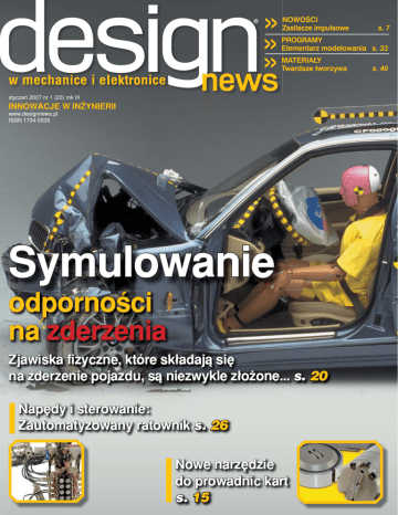>> >> >> NOWOŚCI Zasilacze impulsowe s. 7 PROGRAMY Elementarz modelowania s. 33 MATERIAŁY Twardsze tworzywa styczeń 2007 nr 1 (20) rok III INNOWACJE W INŻYNIERII www.designnews.pl ISSN 1734-0535 Symulowanie odporności na zderzenia Zjawiska fizyczne, które składają się na zderzenie pojazdu, są niezwykle złożone... s. 20 Napędy i sterowanie: Zautomatyzowany ratownik s. 26 Nowe narzędzie do prowadnic kart s. 15 s. 40 OD REDAKCJI 7 77 Co przyniesie nowy... To pytanie z pozoru pozbawione sensu. Oczywiście, tylko nierozważni nie starają się sięgać myślami w przyszłość, przewidywać przebiegu zapoczątkowanych wydarzeń, planować konkretne działania, czy zastanawiać się nad tendencjami na rynku. Wiadomo, iż pojawią się nowe rozwiązania, nowe wersje oprogramowania jeszcze lepiej spełniające nasze oczekiwania etc. Nowe modele samochodów i telefonów komórkowych. Nowe rzesze absolwentów poszukujących możliwości zawodowej realizacji. Skoro wiadomo to wszystko... to po co pytać? Ostatnio na półce sklepowej zobaczyłem znajomo wyglądający aparat telefoniczny. Co było w nim znajomego? Słuchawka położona na widełkach, połączona z korpusem aparatu za pomocą czarnego kręconego kabelka i – rzecz obecnie niespotykana: tarcza. Po bliższych oględzinach okazało się jednak, iż tarcza jest jedynie nieruchomą atrapą wyposażoną w niezbędne współcześnie przyciski. Niedługo tylko w języku potocznym jako relikt minionego okresu będzie funkcjonował zwrot „wykręcić numer” i to używany w zupełnie innym kontekście. To samo znacznie wcześniej spotkało angielskie „turn the TV on” pochodzące z czasów, kiedy to odbiorniki telewizyjne włączało się jak programator w pralkach, pokręcając odpowiedni przełącznik. Dlatego myślę o tym, co przyniesie nowy rok. Czy kolejne ciało niebieskie zmieni swój status? Czy kolejne państwo wejdzie w posiadanie broni atomowej? Czy doczekamy się wdrożenia bezkolizyjnego systemu do jakiegoś auta klasy wyższej, ale nie najwyższej – bo te ostatnie w systemy tego typu bywają już wyposażone i to seryjnie? Czy nowy Airbus „wystartuje” wreszcie do produkcji seryjnej? Czy doczekamy się uruchomienia prywatnego programu kosmicznego, którego celem będzie osiągnięcie księżyca? Bo w tej dziedzinie wiele się ostatnio dzieje, także w Europie i to w rejonach uznawanych do niedawna za zacofane, ale o tym więcej wkrótce i w innym miejscu... A w tym numerze – pierwszym w 2007 roku – każdy powinien znaleźć coś dla siebie. Z życzeniami spełnienia marzeń i satysfakcji zawodowej W imieniu zespołu styczeń 2007 nr INNOW 1 (20) rok ACJE www.d esi ISSN 173 gnnews.pl 4-0535 III W INŻY NIERII >> >> >> NOWO ŚCI Zasilac ze impu lsowe PROGRA s. 7 Eleme MY ntarz mo delowan MATERI ia s. 33 AŁY Twardsz e twor zywa s. 40 Symulo wanie odporn ości na zder zenia Zjawisk a na zderz fizyczne, które enie po s jazdu, s kładają się ą niezw ykle zło Napędy żone... i s. 20 Zautom sterowanie: atyzow any rato wnik s. 26 Cyan Ma genta Ye llow Black Nowe n arz do prow ędzie adnic k art s. 15 DN cov I Maciej Stanisławski redaktor naczelny [www.designnews.pl] DESIGN NEWS Polska 1 7 7 REDAKCJA POLSKA w numerze m.in. Redaktor naczelny Zautomatyzowany ratownik Maciej Stanisławski Pewnego dnia zobaczysz go na filmie wideo, jak ratuje ofiary na polu walki, a może przejdziesz obok niego, kiedy będzie maszerował przez zatłoczony korytarz szpitala. W każdym razie na pewno nie będziesz przygotowany na pierwsze spotkanie z robotem Bear (Battlefield Extraction Assist Robot – Robot wspomagający ratowanie ludzi na polu walki). Nie jest to przecież robot do malowania samochodów... 26 [email protected] Redakcja [email protected] DTP Ryszard Rybarczyk [email protected] Współpraca Andrzej Czerwiec Paweł Lonkwic Radosław Morek DZIAŁ REKLAMY Account Manager Nowe szaty PKP Przemysław Zbierski Myśląc o lokomotywie intuicyjnie kojarzymy ją z tuwimowskim czarnym i tłustym pojazdem, któremu daleko do sterylnych i wypieszczonych współczesnych owoców wzornictwa. Choć dziś parowozy spotykamy najczęściej w bajkach, a ich rolę przejęły znacznie nowocześniejsze lokomotywy elektryczne i spalinowe, w naszym mniemaniu lokomotywy nadal są raczej maszynami niż dziełami stylistów. Mimo to, a może właśnie dlatego, warto spojrzeć na ten temat bliżej. Oczywiście banałem byłaby kosmopolityczna analiza światowej czołówki w tym zakresie, dlatego proponuję studium poprawy stylistycznej jednej z rodzimych lokomotyw, na tle tak – bardzo oczekującej „drugiej młodości” – floty lokomotyw PKP... 43 [email protected] Tłumaczenia techniczne AmaR TRANSLATIONS www.amar-translations.pl REDAKCJA USA Redaktor naczelna Karen Auguston Field Wydawca Dan Hirsh WYDAWNICTWO Trade Media International sp. z o.o. ul. Królewska 27 00-060 Warszawa tel.: +48 22 653 36 11 faks: +48 22 653 36 12 www.trademedia.us Prezes zarządu Michael J. Majchrzak [email protected] Marketing Beata Citko [email protected] Administracja Sylwia Salamon [email protected] Prenumerata Marta Mech [email protected] Druk i oprawa 7 2 DESIGN NEWS Polska [www.designnews.pl] styczeń 2007 Drukarnia Taurus www.drukarniataurus.com.pl Redakcja zastrzega sobie prawo do adiustacji i skracania tekstów oraz zmiany ich tytułów. Nie zwracamy tekstów niezamówionych. Nie odpowiadamy za treść ogłoszeń. Magazyn jest wydawany na licencji Reed Business Information. INNOWACJE W INŻYNIERII www.designnews.pl spis treści nr 1 (20) styczeń 2007 TEMAT NUMERU 20 Symulowanie odporności na zderzenia w BMW Symulowanie odporności na zderzenia pojazdu jest jednym z najtrudniejszych, ale i kluczowych wyzwań, przed którymi obecnie stają inżynierowie samochodowi. Zjawiska fizyczne, które składają się na zderzenie pojazdu, są niezwykle złożone, a czas trwania całego zdarzenia jest bardzo krótki... W SKRÓCIE – wskazówki specjali