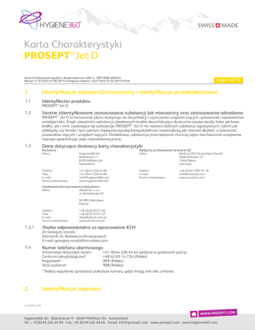 Karta Charakterystyki PROSEPT® Jet D Karta Charakterystyki zgodnie z Rozporządzeniem (WE) nr 1907/2006 (REACH) Wersja: 4.1.0 | Data: 01.06.2015 || Zastępuje wydanie: 4.0.0 | Data: 01.02.2015 || Polski Page 1 of 13 1 Identyfikacja substancji/mieszaniny i identyfikacja przedsiębiorstwa 1.1 Identyfikator produktu PROSEPT® Jet D 1.2 Istotne zidentyfikowane zastosowania substancji lub mieszaniny oraz zastosowania odradzane PROSEPT® Jet D to koncentrat płynu służącego do dezynfekcji i czyszczenia urządzeń ssących, spluwaczek i separatorów amalgamatu. Dzięki zawartości substancji zasadowych środek dezynfekujący skutecznie usuwa osady, takie jak krew, białko, jak i inne osadzające się substancje. PROSEPT® Jet D nie zawiera żadnych substancji agresywnych, takich jak aldehydy czy fenole i tym samym zapewnia wysoką kompatybilność materiałową jak również dbałość o żywotność przewodów ssących i urządzeń ssących. Dodatkowo, substancje przeciwpienne chronią części mechaniczne urządzenia ssącego gwarantując jego nieprzerwaną pracę. 1.3 Dane dotyczące dostawcy karty charakterystyki Wytwórca Adres: Telefon: Faks: Email: Strona internetowa: Wyłączny przedstawiciel na terenie UE: Adres: Medical OCC Deutschland GmbH Wickhofstrasse 12 13467 Berlin Germany Hygiene360 AG Büelstrasse 17 8330 Päffikon ZH Switzerland +41 (0)44 226 44 99 +41 (0)44 226 44 66 info@hygiene360.com www.hygiene360.com Telefon: Email: Strona internetowa: +49 (0)30 1207 61 18 info@oroclean.com www.oroclean.com Użytkownik końcowy/importer/dystrybutor Adres: Abook Sp. z o.o. ul. Brzostowska 22 04985 Warszawa Poland Telefon: Faks: Email: Strona internetowa: 1.3.1 +48 (0)22 8721130 +48 (0)22 8721127 sklep@abook.com.p l www.abook.com.p l Osoba odpowiedzialna za opracowanie KCH Dr Georgios Ionidis Kierownik ds. BadawczoRozwojowych Email: georgios.ionidis@oroclean.com 1.4 Numer telefonu alarmowego Informacje dotyczące awarii: Centrum toksykologiczne*: Pogotowie*: Straż pożarna*: +41 (0)44 226 44 44 (jedynie w godzinach pracy) +48 42 63 14 724 (Polska) 999 (Polska) 998 (Polska) * Należy regularnie sprawdzać powyższe numery, gdyż mogą one ulec zmianie. 2 Identyfikacja zagrożeń PL7F6B8C764D Hygiene360 AG · Büelstrasse 17 · 8330 Pfäffikon ZH · Switzerland Tel. + 41 (0) 44 226 44 99 · Fax: +41 (0) 44 226 44 66 · Email: [email protected] · www.prosept.com · www.hygiene360.com Karta Charakterystyki PROSEPT® Jet D Karta Charakterystyki zgodnie z Rozporządzeniem (WE) nr 1907/2006 (REACH) Wersja: 4.1.0 | Data: 01.06.2015 || Zastępuje wydanie: 4.0.0 | Data: 01.02.2015 || Polski Page 2 of 13 2.1 Klasyfikacja substancji lub mieszaniny 2.1.1 Klasyfikacja zgodnie z Rozporządzeniem (WE) nr 1272/2008 Klasy i kategorie zagrożeń Zwroty wskazujące rodzaj zagrożenia Procedura klasyfikacji Skin Corr. 1C H314 Powoduje poważne oparzenia skóry oraz uszkodzenia oczu. Na podstawie danych z testów. Eye Dam. 1 H318 oczu. Aquatic Acute 1 H400 Działa bardzo toksycznie na or Zharmonizowana (prawna) klasyfikacja. ganizmy wodne. Aquatic Chronic 2 H411 Działa toksycznie na organizmy Zharmonizowana (prawna) klasyfikacja. wodne, powodując długotrwałe skutki. Powoduje poważne uszkodzenie Zharmonizowana (prawna) klasyfikacja. 2.2 Elementy oznakowania 2.2.1 Oznaczenie mieszaniny zgodnie z Rozporządzeniem (WE) nr 1272/2008 Piktogramy oznaczające zagrożenia Hasło ostrzegawcze: Niebezpieczeństwo Zwroty wskazujące rodzaj zagrożenia H314 Powoduje poważne oparzenia skóry oraz uszkodzenia oczu. H410 Działa bardzo toksycznie na organizmy wodne, powodując długotrwałe skutki. Zwroty wskazujące środki ostrożności: P280.1 Stosować rękawice ochronne, odzież ochronną oraz ochronę oczu. P301+P330+P331 W PRZYPADKU POŁKNIĘCIA: wypłukać usta. NIE wywoływać wymiotów. P303+P361+P353 W PRZYPADKU KONTATKU ZE SKÓRĄ (lub z włosami): Natychmiast usunąć/zdjąć całą zanieczyszczoną odzież. Spłukać skórę pod strumieniem wody/prysznicem. P305+P351+P338 W PRZYPADKU DOSTANIA SIĘ DO OCZU: Ostrożnie płukać wodą przez kilka minut. Wyjąć soczewki kontaktowe, jeżeli są założone i można je łatwo usunąć. Nadal płukać. P391 Zebrać wyciek. P501.1 Zawartość/pojemnik usunąć zgodnie z odpowiednimi przepisami. PL7F6B8C764D Hygiene360 AG · Büelstrasse 17 · 8330 Pfäffikon ZH · Switzerland Tel. + 41 (0) 44 226 44 99 · Fax: +41 (0) 44 226 44 66 · Email: [email protected] · www.prosept.com · www.hygiene360.com Karta Charakterystyki PROSEPT® Jet D Karta Charakterystyki zgodnie z Rozporządzeniem (WE) nr 1907/2006 (REACH) Wersja: 4.1.0 | Data: 01.06.2015 || Zastępuje wydanie: 4.0.0 | Data: 01.02.2015 || Polski Page 3 of 13 Uzupełniające informacje o zagrożeniach (UE): – 2.3 No supplementary labelling requirements according to Regulation (EC) 1272/2008. Inne zagrożenia Niniejsza mieszanina nie należy do kategorii PBT lub vPvB zgodnie z REACH, aneks XIII. 3 Skład / Informacja o składnikach 3.1 Substancje Niniejszy produkt jest mieszaniną (patrz część 3.2). 3.2 Mieszaniny 3.2.1 Niebezpieczne składniki Klasyfikacja zgodnie z Rozporządzeniem (WE) nr 1272/2008 3.2.2 Nazwa Numer CAS Numer EINECS Numer in deksu Numer REACH Kategorie zagrożeń Chlorek benzyloC1218alk ilodimetylowy 68424851 2703252 n.a. Propan2ol 67630 2006617 Zwroty wskazujące rodzaj zagrożeni Stężenie 05211587453046 0000 Acute Tox. 4, Skin Corr. H302, H314, 1B, Aquatic Acute 1, H400, H410 Aquatic Chronic 1 5% < 15% 60311700 05211547826441 0 0000 Flam. Liq. 2, Eye Irrit. 2, H225, H319, STOT SE 3 H336 2.5% < 5% Informacje dodatkowe Pełen tekst wymienionych zwrotów R i H podano w części 16 . 4 Środki pierwszej pomocy 4.1 Opis środków pierwszej pomocy 4.1.1 Zalecenia ogólne Zapewnić środki ochrony. Stosować odpowiednie środki ochrony osobistej. Natychmiast zdjąć zanieczyszczoną odzież. Usunąć osoby ze strefy zagrożenia. W przypadku utraty przytomności lub zagrożenia utratą 
