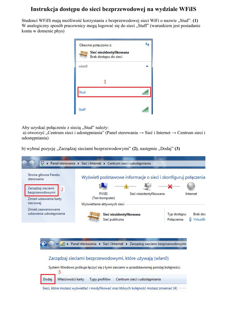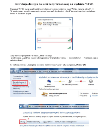 Instrukcja dostępu do sieci bezprzewodowej na wydziale WFiIS Studenci WFiIS mają możliwość korzystania z bezprzewodowej sieci WiFi o nazwie „Stud”. (1) W analogiczny sposób pracownicy mogą logować się do sieci „Staff” (warunkiem jest posiadanie konta w domenie phys) Aby uzyskać połączenie z siecią „Stud” należy: a) otworzyć „Centrum sieci i udostępniania” (Panel sterowania → Sieć i Internet → Centrum sieci i udostępniania) b) wybrać pozycję „Zarządzaj sieciami bezprzewodowymi” (2), następnie „Dodaj” (3) d) wybrać „Ręcznie utwórz profil sieciowy” i wypełnić formularz: (4) Nazwa sieci: Stud Typ zabezpieczeń : WPA2-Enterprise Typ szyfrowania: AES e) „Dalej” f) wybrać „Zmień ustawiania połączenia” g) w oknie „Stud – Właściwości sieci bezprzewodowej” wybrać zakładkę „Zabezpieczenia” a następnie kliknąć „Ustawienia” (5) h) odznaczyć „Weryfikuj certyfikat serwera” (6) i) wybrać „Konfiguruj” (7) j) odznaczyć „Automatycznie użyj mojej nazwy logowania i hasła (oraz domeny, jeżeli istnieje) systemu Windows”, (8) k) potwierdzić wszystkie zmiany, l) w czasie uzyskiwania połączenia system zapyta o poświadczenia – należy podać swój login i hasło z domeny pi. (9)