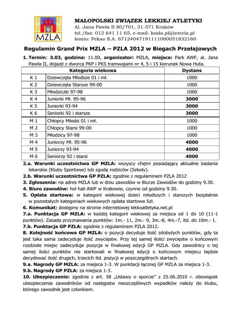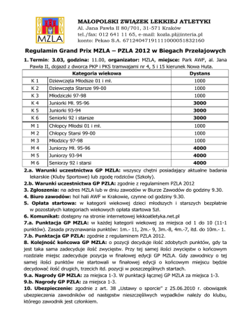 MAŁOPOLSKI ZWIĄZEK LEKKIEJ ATLETYKI Al. Jana Pawła II 80/701, 31-571 Kraków tel./fax: 012 641 11 65, e-mail: [email protected] konto: Pekao S.A. 67124047191111000051832160 Regulamin Grand Prix MZLA – PZLA 2012 w Biegach Przełajowych 1. Termin: 3.03, godzina: 11.00, organizator: MZLA, miejsce: Park AWF, al. Jana Pawła II, dojazd z dworca PKP i PKS tramwajami nr 4, 5 i 15 kierunek Nowa Huta. Kategoria wiekowa Dystans K1 Dziewczęta Młodsze 01 i mł. 1000 K2 Dziewczęta Starsze 99-00 1000 K3 Młodziczki 97-98 1000 K4 Juniorki Mł. 95-96 3000 K5 Juniorki 93-94 3000 K6 Seniorki 92 i starsze 3000 M1 Chłopcy Młodsi 01 i mł. 1000 M2 Chłopcy Starsi 99-00 1000 M3 Młodzicy 97-98 1000 M4 Juniorzy Mł. 95-96 4000 M5 Juniorzy 93-94 4000 M6 Seniorzy 92 i starsi 4000 2.a. Warunki uczestnictwa GP MZLA: wszyscy chętni posiadający aktualne badania lekarskie (Kluby Sportowe) lub zgodę rodziców (Szkoły). 2.b. Warunki uczestnictwa GP PZLA: zgodnie z regulaminem PZLA 2012 3. Zgłoszenia: na adres MZLA lub w dniu zawodów w Biurze Zawodów do godziny 9.30. 4. Biuro zawodów: hol hali AWF w Krakowie, czynne od godziny 9.30. 5. Opłata startowa: w kategorii wiekowej dzieci młodszych i starszych bezpłatnie w pozostałych kategoriach wiekowych opłata startowa 5zł. 6. Komunikat: dostępny na stronie internetowej lekkoatletyka.net.pl 7.a. Punktacja GP MZLA: w każdej kategorii wiekowej za miejsca od 1 do 10 (11-1 punktów). Zasada przyznawania punktów: 1m.- 11, 2m.- 9, 3m.-8, 4m.-7, itd. do 10m.- 1. 7.b. Punktacja GP PZLA: zgodnie z regulaminem PZLA 2012. 8. Kolejność końcowa GP MZLA: o pozycji decyduje ilość zdobytych punktów, gdy ta jest taka sama zadecyduje ilość zwycięstw. Przy tej samej ilości zwycięstw o końcowym rozdziale miejsc zadecyduje pozycja w finałowej edycji GP MZLA. Gdy zawodnicy o tej samej ilości punktów nie startowali w finałowej edycji o końcowym miejscu będzie decydować ilość drugich, trzecich itd. pozycji w poszczególnych startach. 9.a. Nagrody GP MZLA: za miejsca 1-3. W punktacji łącznej GP MZLA za miejsca 1-3. 9.b. Nagrody GP PZLA: za miejsca 1-3. 10. Ubezpieczenie: zgodnie z art. 38 „Ustawy o sporcie” z 25.06.2010 r. obowiązek ubezpieczenia zawodników od następstw nieszczęśliwych wypadków należy do klubu, którego zawodnik jest członkiem. MAŁOPOLSKI ZWIĄZEK LEKKIEJ ATLETYKI Al. Jana Pawła II 80/701, 31-571 Kraków tel./fax: 012 641 11 65, e-mail: [email protected] konto: Pekao S.A. 67124047191111000051832160 PROGRAM MINUTOWY GRAND PRIX MZLA – PZLA W BIEGACH PRZEŁAJOWYCH 3.03.2012 Lp. Godzina startu Dystans 1. 11.00 1000 m Dziewczęta Młodsze 2. 11.05 1000 m Chłopcy Młodsi 3. 11.10 1000 m 4. 11.15 5. 6. 7. 8. Kategoria wiekowa Rocznik Ilość pętli 01 i młodsze 1 pętla 01 i młodsi 1 pętla Dziewczęta Starsze 99-00 1 pętla 1000 m Chłopcy Starsi 99-00 1 pętla 11.20 1000 m Młodziczki 97-98 1 pętla 11.25 1000 m Młodzicy 97-98 1 pętla 3000 m Juniorki Młodsze Juniorki Seniorki 95–96 93–94 92 i starsze 3 pętle 4000 m Juniorzy Młodsi Juniorzy Seniorzy 95–96 93–94 92 i starsi 4 pętle 11.30 11.45