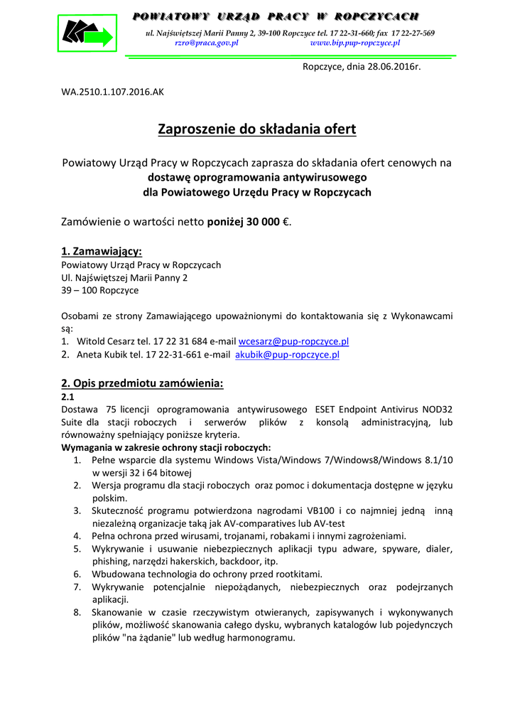 P PO OW WIIA AT TO OW WY Y U UR RZ ZĄ ĄD D P PR RA AC CY Y W W R RO OP PC CZ ZY YC CA AC CH H ul. Najświętszej Marii Panny 2, 39-100 Ropczyce tel. 17 22-31-660; fax 17 22-27-569 [email protected] www.bip.pup-ropczyce.pl Ropczyce, dnia 28.06.2016r. WA.2510.1.107.2016.AK Zaproszenie do składania ofert Powiatowy Urząd Pracy w Ropczycach zaprasza do składania ofert cenowych na dostawę oprogramowania antywirusowego dla Powiatowego Urzędu Pracy w Ropczycach Zamówienie o wartości netto poniżej 30 000 €. 1. Zamawiający: Powiatowy Urząd Pracy w Ropczycach Ul. Najświętszej Marii Panny 2 39 – 100 Ropczyce Osobami ze strony Zamawiającego upoważnionymi do kontaktowania się z Wykonawcami są: 1. Witold Cesarz tel. 17 22 31 684 e-mail [email protected] 2. Aneta Kubik tel. 17 22-31-661 e-mail [email protected] 2. Opis przedmiotu zamówienia: 2.1 Dostawa 75 licencji oprogramowania antywirusowego ESET Endpoint Antivirus NOD32 Suite dla stacji roboczych i serwerów plików z konsolą administracyjną, lub równoważny spełniający poniższe kryteria. Wymagania w zakresie ochrony stacji roboczych: 1. Pełne wsparcie dla systemu Windows Vista/Windows 7/Windows8/Windows 8.1/10 w wersji 32 i 64 bitowej 2. Wersja programu dla stacji roboczych oraz pomoc i dokumentacja dostępne w języku polskim. 3. Skuteczność programu potwierdzona nagrodami VB100 i co najmniej jedną inną niezależną organizacje taką jak AV-comparatives lub AV-test 4. Pełna ochrona przed wirusami, trojanami, robakami i innymi zagrożeniami. 5. Wykrywanie i usuwanie niebezpiecznych aplikacji typu adware, spyware, dialer, phishing, narzędzi hakerskich, backdoor, itp. 6. Wbudowana technologia do ochrony przed rootkitami. 7. Wykrywanie potencjalnie niepożądanych, niebezpiecznych oraz podejrzanych aplikacji. 8. Skanowanie w czasie rzeczywistym otwieranych, zapisywanych i wykonywanych plików, możliwość skanowania całego dysku, wybranych katalogów lub pojedynczych plików "na żądanie" lub według harmonogramu. 9. 10. 11. 12. 13. 14. 15. 16. 17. 18. 19. 20. 21. 22. 23. 24. 25. 26. 27. 28. System ma oferować administratorowi możliwość definiowania zadań w harmonogramie w taki sposób, aby zadanie przed wykonaniem sprawdzało czy komputer pracuje na zasilaniu bateryjnym i jeśli tak – nie wykonywało danego zadania. Możliwość utworzenia wielu różnych zadań skanowania według harmonogramu (w tym: co godzinę, po zalogowaniu i po uruchomieniu komputera). Każde zadanie ma mieć możliwość uruchomienia z innymi ustawieniami (czyli metody skanowania, obiekty skanowania, czynności, rozszerzenia przeznaczone do skanowania, priorytet skanowania). Skanowanie "na żądanie" pojedynczych plików lub katalogów przy pomocy skrótu w menu kontekstowym. Możliwość określania poziomu obciążenia procesora podczas skanowania „na żądanie” i według harmonogramu. Możliwość skanowania dysków sieciowych i dysków przenośnych, skanowanie plików spakowanych i skompresowanych. Możliwość definiowania listy rozszerzeń plików, które mają być skanowane (w tym z uwzględnieniem plików bez rozszerzeń). Możliwość umieszczenia na liście wyłączeń ze skanowania wybranych plików, katalogów lub plików o określonych rozszerzeniach. Możliwość automatycznego wyłączenia komputera po zakończonym skanowaniu. Brak konieczności ponownego uruchomienia komputera po instalacji programu. Użytkownik musi posiadać możliwość tymczasowego wyłączenia ochrony na czas co najmniej 10 min lub do ponownego uruchomienia komputera. W momencie tymczasowego wyłączenia ochrony antywirusowej użytkownik musi być poinformowany o takim fakcie odpowiednim powiadomieniem i informacją w interfejsie aplikacji. Ponowne włączenie ochrony antywirusowej nie może wymagać od użytkownika ponownego uruchomienia komputera. Możliwość przeniesienia zainfekowanych plików i załączników poczty w bezpieczny obszar dysku (do katalogu kwarantanny) w celu dalszej kontroli. Pliki muszą być przechowywane w katalogu kwarantanny w postaci zaszyfrowanej. Skanowanie i oczyszczanie poczty przychodzącej POP3 i IMAP w czasie rzeczywistym, zanim zostanie dostarczona do klienta pocztowego zainstalowanego na stacji roboczej (niezależnie od konkretnego klienta pocztowego). Automatyczna integracja skanera POP3 i IMAP z dowolnym klientem pocztowym bez konieczności zmian w konfiguracji. Możliwość opcjonalnego dołączenia informacji o przeskanowaniu do każdej odbieranej wiadomości e-mail lub tylko do zainfekowanych wiadomości e-mail. Skanowanie ruchu HTTP na poziomie stacji roboczych. Zainfekowany ruch jest automatycznie blokowany a użytkownikowi wyświetlane jest stosowne powiadomienie. Blokowanie możliwości przeglądania wybranych stron internetowych. Listę blokowanych stron internetowych określa administrator. Program musi umożliwić blokowanie danej strony internetowej po podaniu na liście całej nazwy strony lub tylko wybranego słowa występującego w nazwie strony. Możliwość zdefiniowania blokady wszystkich stron internetowych z wyjątkiem listy stron ustalonej przez administratora. Program ma umożliwiać skanowanie ruchu sieciowego wewnątrz szyfrowanych protokołów HTTPS, POP3S, IMAPS. 29. Program ma zapewniać skanowanie ruchu HTTPS transparentnie bez potrzeby konfiguracji zewnętrznych aplikacji takich jak przeglądarki Web lub programy pocztowe. 30. Możliwość zgłoszenia witryny z podejrzeniem phishingu z poziomu graficznego interfejsu użytkownika w celu analizy przez laboratorium producenta. 31. Administrator ma mieć możliwość zdefiniowania portów TCP, na których aplikacja będzie realizowała proces skanowania ruchu szyfrowanego. 32. Program musi posiadać funkcjonalność która na bieżąco będzie odpytywać serwery producenta o znane i bezpieczne procesy uruchomione na komputerze użytkownika. 33. Procesy zweryfikowane jako bezpieczne mają być pomijane podczas procesu skanowania