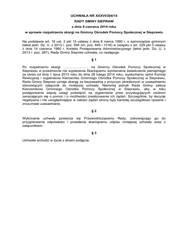 UCHWAŁA NR XXXVI/304/14 RADY GMINY SIEPRAW z dnia 9 czerwca 2014 roku w sprawie rozpatrzenia skargi na Gminny Ośrodek Pomocy Społecznej w Sieprawiu Na podstawie art. 18 ust. 2 pkt 15 ustawy z dnia 8 marca 1990 r. o samorządzie gminnym (tekst jedn. Dz. U. z 2013 r. poz. 594 zm. poz. 645 i 1318) w związku z art. 229 pkt 3 ustawy z dnia 14 czerwca 1960 r. Kodeks Postępowania Administracyjnego (tekst jedn. Dz. U. z 2013 r. poz. 267), Rada Gminy Siepraw uchwala, co następuje: §1 Po rozpatrzeniu skargi …………………. na Gminny Ośrodek Pomocy Społecznej w Sieprawiu w przedmiocie nie wypłacenia Skarżącemu wyrównania świadczenia pieniężnego za okres od dnia 1 lipca 2013 roku do dnia 28 lutego 2014 roku, wysłuchaniu opinii Komisji Rewizyjnej i wyjaśnienia Kierownika Gminnego Ośrodka Pomocy Społecznej w Sieprawiu, Rada Gminy Siepraw uznaje skargę za bezzasadną z przyczyn określonych w uzasadnieniu stanowiącym załącznik do niniejszej uchwały. Niemniej jednak Rada Gminy zaleca Kierownikowi Gminnego Ośrodka Pomocy Społecznej w Sieprawiu, aby w toku postępowania więcej uwagi poświęcić na wyjaśnianie praw przysługujących osobom zwracającym się o pomoc i o możliwości zrealizowania ich żądań. Szczególnie, by decyzje negatywne i nie uwzględniające w całości żądań strony były bardziej szczegółowo opisane i zrozumiale uzasadniane. §2 Wykonanie uchwały powierza się Przewodniczącemu Rady, zobowiązując go do przygotowania odpowiedzi i przesłania skarżącemu odpisu niniejszej uchwały wraz z załącznikiem. §3 Uchwała wchodzi w życie z dniem podjęcia. Załącznik do Uchwały Nr XXXVI/304/14 Rady Gminy Siepraw z dnia 9 czerwca 2014 roku w sprawie rozpatrzenia skargi na Gminny Ośrodek Pomocy Społecznej w Sieprawiu Uzasadnienie W dniu 18 kwietnia 2014 roku do Rady Gminy Siepraw wpłynęło skierowane przez Samorządowe Kolegium Odwoławcze w Krakowie zawiadomienie o przekazaniu skargi ………… na działalność Gminnego Ośrodka Pomocy Społecznej w Sieprawiu. Wraz z zawiadomieniem zwrócone zostały akta sprawy postępowania prowadzonego przez Gminny Ośrodek Pomocy Społecznej w Sieprawiu z wniosku ……………… oraz jego pisma z dnia 22 lutego 2014 roku i 8 kwietnia 2014 roku, a także pismo SKO w Krakowie z dnia 2 kwietnia 2014 roku i notatka z posiedzenia z dnia 14 kwietnia 2014 roku. Sprawę wstępnie rozpoznała Komisja Rewizyjna, na posiedzeniu w dniu 8 maja 2014 roku oraz wysłuchała wyjaśnień Kierownika Gminnego Ośrodka Pomocy Społecznej w Sieprawiu i ustaliła następujący stan faktyczny: Skarżący w dniu 19 lipca 2013 roku zwrócił się do Gminnego Ośrodka Pomocy Społecznej w Sieprawiu o udzielenie pomocy pieniężnej uzasadniając wniosek bezrobociem, przewlekłą chorobą, ciężką sytuacją materialną rodziny, dla której jedynym źródłem utrzymania jest emerytura jego ojca. Gminny Ośrodek Pomocy Społecznej w Sieprawiu w dniu 31 lipca 2013 roku przyznał skarżącemu pomoc rzeczową w formie zakupu lekarstw w wysokości (155,10 zł) i odstąpił od żądania zwrotu przyznania pomocy. Decyzji nadał rygor natychmiastowej wykonalności i decyzja została wykonana tj. Skarżący otrzymał lekarstwa. W uzasadnieniu decyzji Ośrodek poinformował Skarżącego, iż kryterium dochodowe w jego rodzinie nie uprawnia go do otrzymania zasiłku okresowego. Od powyższej decyzji Skarżący odwołał się do Samorządowego Kolegium Odwoławczego w Krakowie. Kolegium to rozpoznało sprawę w dniu 24 stycznia 2014 roku, uchylając decyzję tut Ośrodka Pomocy Społecznej i przekazało sprawę do ponownego rozpoznania. Kolegium zarzuciło, iż Skarżący wnioskował o pomoc pieniężną, a GOPS w decyzji nie orzekł o odmowie przyznania świadczenia pieniężnego. Kolegium stanęło na stanowisku, iż świadczenie rzeczowe zostało przyznane z urzędu, a nie na wniosek. Kolegium uchyliło w całości w/w decyzję, chociaż przyznane świadczenie rzeczowe zostało zrealizowane i nie było kwestionowane przez Skarżącego. W dniu 21 lutego 2014 roku akta sprawy Samorządowe Kolegium Odwoławcze w Krakowie zwróciło do tut. Gminnego Ośrodka Pomocy Społecznej, który ponownie rozpatrzył sprawę i w dniu 10 marca 2014 roku, decyzją, odmówił przyznania zasiłku okresowego oraz przyznał świadczenie rzeczowe na zakup lekarstw w kwocie jak w uchylonej decyzji, zaliczając na poczet tej decyzji wykonane świadczenie w miesiącu lipcu 2013 roku. Uzasadniając decyzję podał, iż Skarżący w wywiadzie oświadczył, iż utrzymuje się z ojcem z jego emerytury, zatem dochód w rodzinie jest wyższy niż kryterium dochodowe, dlatego ograniczono pomoc do zakupu lekarstw. W dniu 27 lutego 2014 roku Skarżący się zwrócił się do Gminnego Ośrodka Pomocy Społecznej w Sieprawiu ponownie z wnioskiem o przyznanie zasiłku okresowego. Tym razem podał, iż utrzymuje się sam. Ośrodek ten decyzją z dnia 12 marca 2014 roku przyznał mu zasiłek okresowy, od dnia 1 marca 2014 roku do 31 maja 2014 roku w wysokości 300 zł miesięcznie. Ani od decyzji z dnia 10 marca 2014 roku odmawiającej przyznania zasiłku, ani od decyzji przyznającej zasiłek okresowy Skarżący się nie odwołał. Natomiast w dniu 22 lutego 2014 roku do Samorządowego Kolegium Odwoławczego w Krakowie wpłynęło pismo Skarżącego zaadresowane do Wojewódzkiego Sądu Administracyjnego w Krakowie zatytułowane zażalenie na Gminny Ośrodek Pomocy Społecznej w Sieprawiu. Pismo, zatem wpłynęło jeszcze przed wydaniem decyzji z dnia 10 marca 2014 roku (decyzja doręczona została Skarżącemu w dniu 19 marca 2014 roku). W dniu 12 marca 2014 roku Samorządowe Kolegium Odwoławcze w Krakowie zażądało od Gminnego Ośrodka Pomocy Społecznej w Sieprawiu akt dotyczących udzielenia lub odmowy udzielenia pomocy Skarżącemu. 2 W dniu 20 marca 2014 roku Ośrodek akta sprawy wraz z wydaną decyzją z dnia 10 marca 2014 roku przekazał Samorządowemu Kolegi