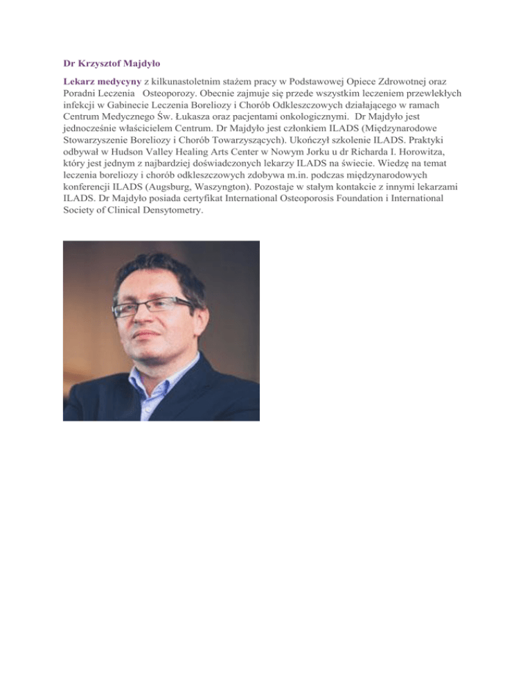 Dr Krzysztof Majdyło Lekarz medycyny z kilkunastoletnim stażem pracy w Podstawowej Opiece Zdrowotnej oraz Poradni Leczenia Osteoporozy. Obecnie zajmuje się przede wszystkim leczeniem przewlekłych infekcji w Gabinecie Leczenia Boreliozy i Chorób Odkleszczowych działającego w ramach Centrum Medycznego Św. Łukasza oraz pacjentami onkologicznymi. Dr Majdyło jest jednocześnie właścicielem Centrum. Dr Majdyło jest członkiem ILADS (Międzynarodowe Stowarzyszenie Boreliozy i Chorób Towarzyszących). Ukończył szkolenie ILADS. Praktyki odbywał w Hudson Valley Healing Arts Center w Nowym Jorku u dr Richarda I. Horowitza, który jest jednym z najbardziej doświadczonych lekarzy ILADS na świecie. Wiedzę na temat leczenia boreliozy i chorób odkleszczowych zdobywa m.in. podczas międzynarodowych konferencji ILADS (Augsburg, Waszyngton). Pozostaje w stałym kontakcie z innymi lekarzami ILADS. Dr Majdyło posiada certyfikat International Osteoporosis Foundation i International Society of Clinical Densytometry.
