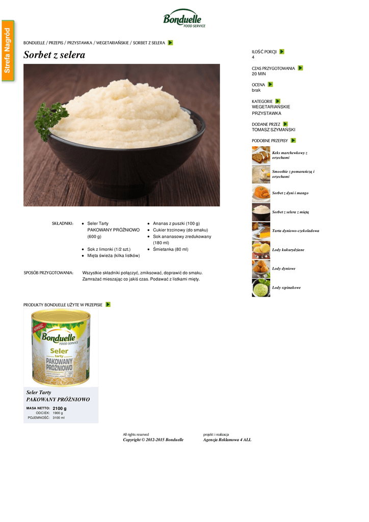 BONDUELLE / PRZEPIS / PRZYSTAWKA / WEGETARIAŃSKIE / SORBET Z SELERA Sorbet z selera ILOŚĆ PORCJI 4 CZAS PRZYGOTOWANIA 20 MIN OCENA brak KATEGORIE WEGETARIAŃSKIE PRZYSTAWKA DODANE PRZEZ TOMASZ SZYMAŃSKI PODOBNE PRZEPISY Keks marchewkowy z orzechami Smoothie z pomarańczą i orzechami Sorbet z dyni i mango Sorbet z selera z miętą SKŁADNIKI: Seler Tarty PAKOWANY PRÓŻNIOWO (600 g) Sok z limonki (1/2 szt.) Mięta świeża (kilka listków) SPOSÓB PRZYGOTOWANIA: Ananas z puszki (100 g) Cukier trzcinowy (do smaku) Sok ananasowy zredukowany (180 ml) Śmietanka (80 ml) Tarta dyniowo-czekoladowa Lody kukurydziane Lody dyniowe Wszystkie składniki połączyć, zmiksować, doprawić do smaku. Zamrażać mieszając co jakiś czas. Podawać z listkami mięty. Lody szpinakowe PRODUKTY BONDUELLE UŻYTE W PRZEPISIE Seler Tarty PAKOWANY PRÓŻNIOWO MASA NETTO: 2100 g ODCIEK: 1900 g POJEMNOŚĆ: 3100 ml All rights reserved projekt i realizacja Copyright © 2012-2015 Bonduelle Agencja Reklamowa 4 ALL