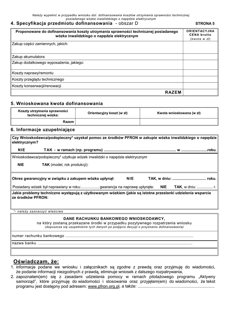 Należy wypełnić w przypadku wniosku dot. dofinansowania kosztów utrzymania sprawności technicznej posiadanego wózka inwalidzkiego o napędzie elektrycznym 4. Specyfikacja przedmiotu dofinansowania - obszar D STRONA 5 Proponowane do dofinansowania koszty utrzymania sprawności technicznej posiadanego wózka inwalidzkiego o napędzie elektrycznym O R I E N T AC Y J N A CENA brutto ( k w o t a w zł ) Zakup części zamiennych, jakich: Zakup akumulatora Zakup dodatkowego wyposażenia, jakiego: Koszty naprawy/remontu Koszty przeglądu technicznego Koszty konserwacji/renowacji RAZEM 5. Wnioskowana kwota dofinansowania Koszty utrzymania sprawności technicznej wózka: Orientacyjny koszt (w zł) Kwota wnioskowana (w zł) Razem 6. Informacje uzupełniające Czy Wnioskodawca/podopieczny* uzyskał pomoc ze środków PFRON w zakupie wózka inwalidzkiego o napędzie elektrycznym? NIE T AK - w ramach (np. programu) ..................................................................... w .........................roku. Wnioskodawca/podopieczny* użytkuje wózek inwalidzki o napędzie elektrycznym NIE TAK (model, rok produkcji): Okres gwarancyjny w związku z zakupem wózka upłynął: NIE TAK, w dniu: ................................ roku. Posiadany wózek był naprawiany w roku:................, gwarancja na naprawę upłynęła: NIE TAK, w dniu: ............... r. Jakie problemy techniczne występują z użytkowanym wózkiem (jakie są istotne przesłanki udzielenia wsparcia ze środków PFRON: * - n a l e ży za zn a c zy ć w ł a ś c i w e DANE RACHUNKU BANKOWEGO WNIOSKODAWCY, na który zostaną przekazane środki w przypadku pozytywnego rozpatrzenia wniosku (dopuszcza się uzupełnienie tych danych po podjęciu decyzji o przyznaniu dofinansowania) numer rachunku bankowego ........................................................................................................ nazwa banku .............................................................................................................................. Oświadczam, że: 1. informacje podane we wniosku i załącznikach są zgodne z prawdą oraz przyjmuję do wiadomości, że podanie informacji niezgodnych z prawdą, eliminuje wniosek z dalszego rozpatrywania, 2. zapoznałam(em) się z zasadami udzielania pomocy w ramach pilotażowego programu „Aktywny samorząd”, które przyjmuję do wiadomości i stosowania oraz przyjęłam(em) do wiadomości, że tekst programu jest dostępny pod adresem: www.pfron.org.pl, a także: ................................................................. ST RO NA 6 3. przyjmuję do wiadomości i stosowania, iż złożenie niniejszego wniosku o dofinansowanie nie gwarantuje uzyskania pomocy w ramach realizacji programu oraz, że warunkiem zawarcia umowy dofinansowania jest spełnianie warunków uczestnictwa określonych w programie także w dniu podpisania umowy, 4. przyjmuję do wiadomości i stosowania, że ewentualne wyjaśnienia, uzupełnienia zapisów lub brakujących załączników do wniosku należy dostarczyć niezwłocznie, w terminie wyznaczonym przez Realizatora programu oraz, że prawidłowo zaadresowana korespondencja, która pomimo dwukrotnego awizowania nie zostanie odebrana, uznawana będzie za doręczoną, 5. w ciągu ostatnich 3 lat byłem(am) stroną umowy dofinansowania ze środków PFRON i rozwiązanej z przyczyn leżących po mojej stronie: tak - nie, 6. przyjmuję do wiadomości i stosowania, iż w przypadku przyznanego dofinansowania, przelanie środków finansowych może nastąpić na rachunek bankowy Wnioskodawcy lub też na rachunek bankowy sprzedawcy/usługodawcy, na podstawie przedstawionej i podpisanej przez Wnioskodawcę faktury VAT. Wnioskodawca nie mogący pisać, lecz mogący czytać, zamiast podpisu może uczynić na dokumencie tuszowy odcisk palca, a obok tego odcisku inna osoba wypisze jej imię i nazwisko umieszczając swój podpis; zamiast Wnioskodawcy może także podpisać się inna osoba, z tym że jej podpis musi być poświadczony przez notariusza lub wójta (burmistrza, prezydenta miasta), starostę lub marszałka województwa z zaznaczeniem, że podpis został złożony na życzenie nie mogącego pisać, lecz mogącego czytać. ...................................... dnia ..... /....... /20..... r. ................................... podpis Wnioskodawcy 7. Załączniki: wymagane do wniosku oraz dodatkowe (wiersze 6-12) WYPEŁNIA WYŁĄCZNIE REALIZATOR PROGRAMU (należy zaznaczyć właściwe) Nazwa załącznika 1. Kserokopia aktualnego orzeczenia o znacznym stopniu niepełnosprawności (lub orzeczenia równoważnego) albo orzeczenia o niepełnosprawności podopiecznego (osoby do 16 roku życia) 2. Oświadczenie o wysokości średnich miesięcznych dochodów brutto w przeliczeniu na jednego członka rodziny pozostającego we wspólnym gospodarstwie domowym (sporządzone wg wzoru określonego w załączniku nr 1 do wniosku) 3. Oświadczenia o wyrażeniu zgody na przetwarzanie danych osobowych przez Realizatora programu i PFRON (sporządzone wg wzoru określonego w załączniku nr 3 do formularza wniosku) - wypełnione przez Wnioskodawcę oraz inne osoby posiadające zdolność do czynności prawnych, których dane osobowe zostały przekazane do Realizatora programu 4. Kserokopia aktu urodzenia dziecka - w przypadku wniosku dotyczącego niepełnoletniej osoby niepełnosprawnej 5. Kserokopia dokumentu stanowiącego opiekę prawną nad podopiecznym – w przypadku wniosku dotyczącego osoby niepełnosprawnej, w imieniu której występuje opiekun prawny 6. 7. 8. 9. 10. 11. 12. Inne załączniki (należy wymienić): Dołączono do wniosku Uzupełniono Data uzupełnienia /uwagi
