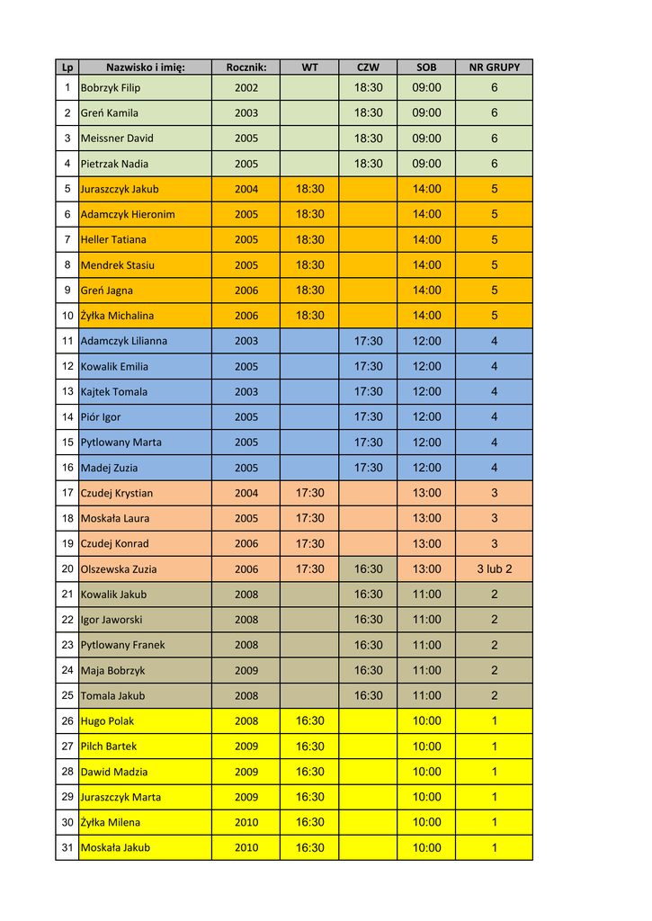 Lp Nazwisko i imię: Rocznik: WT CZW SOB NR GRUPY 1 Bobrzyk Filip 2002 18:30 09:00 6 2 Greń Kamila 2003 18:30 09:00 6 3 Meissner David 2005 18:30 09:00 6 4 Pietrzak Nadia 2005 18:30 09:00 6 5 Juraszczyk Jakub 2004 18:30 14:00 5 6 Adamczyk Hieronim 2005 18:30 14:00 5 7 Heller Tatiana 2005 18:30 14:00 5 8 Mendrek Stasiu 2005 18:30 14:00 5 9 Greń Jagna 2006 18:30 14:00 5 10 Żyłka Michalina 2006 18:30 14:00 5 11 Adamczyk Lilianna 2003 17:30 12:00 4 12 Kowalik Emilia 2005 17:30 12:00 4 13 Kajtek Tomala 2003 17:30 12:00 4 14 Piór Igor 2005 17:30 12:00 4 15 Pytlowany Marta 2005 17:30 12:00 4 16 Madej Zuzia 2005 17:30 12:00 4 17 Czudej Krystian 2004 17:30 13:00 3 18 Moskała Laura 2005 17:30 13:00 3 19 Czudej Konrad 2006 17:30 13:00 3 20 Olszewska Zuzia 2006 17:30 16:30 13:00 3 lub 2 21 Kowalik Jakub 2008 16:30 11:00 2 22 Igor Jaworski 2008 16:30 11:00 2 23 Pytlowany Franek 2008 16:30 11:00 2 24 Maja Bobrzyk 2009 16:30 11:00 2 25 Tomala Jakub 2008 16:30 11:00 2 26 Hugo Polak 2008 16:30 10:00 1 27 Pilch Bartek 2009 16:30 10:00 1 28 Dawid Madzia 2009 16:30 10:00 1 29 Juraszczyk Marta 2009 16:30 10:00 1 30 Żyłka Milena 2010 16:30 10:00 1 31 Moskała Jakub 2010 16:30 10:00 1