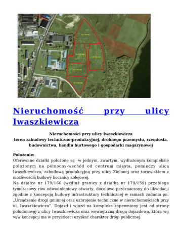 Nieruchomość Iwaszkiewicza przy ulicy Nieruchomości przy ulicy Iwaszkiewicza teren zabudowy techniczno-produkcyjnej, drobnego przemysłu, rzemiosła, budownictwa, handlu hurtowego i gospodarki magazynowej Położenie: Oferowane działki położone są w jednym, zwartym, wydłużonym kompleksie położonym na północny-wschód od centrum miasta, pomiędzy ulicą Iwaszkiewicza, zabudową produkcyjną przy ulicy Zielonej oraz torowiskiem z możliwością budowy bocznicy kolejowej. Na działce nr 179/160 (wzdłuż granicy z działką nr 179/159) przebiega tymczasowy rów odwodnieniowy otwarty, docelowo przeznaczony do likwidacji zgodnie z koncepcją budowy infrastruktury technicznej w ramach zadania pn. „Urządzenie drogi gminnej oraz uzbrojenie techniczne w nieruchomościach przy ul. Iwaszkiewicza”. Dojazd i wjazd na kompleks zapewniony jest od strony południowej z ulicy Iwaszkiewicza oraz wewnętrzną drogą dojazdową, która wg w/w koncepcji ma w przyszłości uzyskać charakter drogi publicznej. Przeznaczenie zgodnie z planem zagospodarowania przestrzennego: Nieruchomości objęte są planem zagospodarowania przestrzennego, zgodnie z którym teren ten przeznaczony jest pod budownictwo, handel hurtowy, gospodarkę magazynową, z dopuszczeniem usług; funkcję mieszkalną dopuszcza się wyłącznie w formie mieszkania integralnie związanego z prowadzoną działalnością. Powierzchnia: działka nr 179/157: działka nr 179/158: działka nr 179/159: działka nr 179/160: działka nr 179/161: Łącznie : 62554 m² 15484 m² 11962 m² 11059 m² 8950 m² 15099 m² Charakterystyka: Nieruchomość niezabudowana, niezagospodarowana, w kształcie nieregularnego wydłużonego wieloboku o zróżnicowanej konfiguracji terenu. Własność: Gmina Miejska Starogard Gdański Forma zbycia: Przetarg ustny nieograniczony Księga wieczysta: nr 24974 Połączenia transportowe: odległość od drogi krajowa Nr 22 – ok. 1,5 k m odległość od autostrady A1 – ok. 15 km odległość od najbliższej stacji kolejowej – ok.1,5 km odległość od dworca autobusowego PKS- ok.1,5 km odległość od portu lotniczego – ok. 55 km odległość od portu morskiego – ok. 55 km Istniejąca infrastruktura: Gmina Miejska Starogard Gdański posiada dokumentację uzbrojenia terenu. – Oferta PDF – BIP