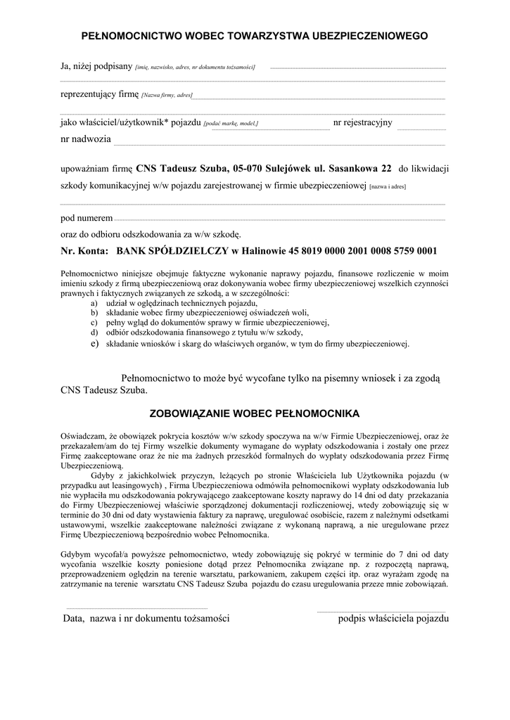 PEŁNOMOCNICTWO WOBEC TOWARZYSTWA UBEZPIECZENIOWEGO Ja, niżej podpisany [imię, nazwisko, adres, nr dokumentu tożsamości] reprezentujący firmę [Nazwa firmy, adres] jako właściciel/użytkownik* pojazdu [podać markę, model,] nr rejestracyjny nr nadwozia upoważniam firmę CNS Tadeusz Szuba, 05-070 Sulejówek ul. Sasankowa 22 do likwidacji szkody komunikacyjnej w/w pojazdu zarejestrowanej w firmie ubezpieczeniowej [nazwa i adres] pod numerem oraz do odbioru odszkodowania za w/w szkodę. Nr. Konta: BANK SPÓŁDZIELCZY w Halinowie 45 8019 0000 2001 0008 5759 0001 Pełnomocnictwo niniejsze obejmuje faktyczne wykonanie naprawy pojazdu, finansowe rozliczenie w moim imieniu szkody z firmą ubezpieczeniową oraz dokonywania wobec firmy ubezpieczeniowej wszelkich czynności prawnych i faktycznych związanych ze szkodą, a w szczególności: a) udział w oględzinach technicznych pojazdu, b) składanie wobec firmy ubezpieczeniowej oświadczeń woli, c) pełny wgląd do dokumentów sprawy w firmie ubezpieczeniowej, d) odbiór odszkodowania finansowego z tytułu w/w szkody, e) składanie wniosków i skarg do właściwych organów, w tym do firmy ubezpieczeniowej. Pełnomocnictwo to może być wycofane tylko na pisemny wniosek i za zgodą CNS Tadeusz Szuba. ZOBOWIĄZANIE WOBEC PEŁNOMOCNIKA Oświadczam, że obowiązek pokrycia kosztów w/w szkody spoczywa na w/w Firmie Ubezpieczeniowej, oraz że przekazałem/am do tej Firmy wszelkie dokumenty wymagane do wypłaty odszkodowania i zostały one przez Firmę zaakceptowane oraz że nie ma żadnych przeszkód formalnych do wypłaty odszkodowania przez Firmę Ubezpieczeniową. Gdyby z jakichkolwiek przyczyn, leżących po stronie Właściciela lub Użytkownika pojazdu (w przypadku aut leasingowych) , Firma Ubezpieczeniowa odmówiła pełnomocnikowi wypłaty odszkodowania lub nie wypłaciła mu odszkodowania pokrywającego zaakceptowane koszty naprawy do 14 dni od daty przekazania do Firmy Ubezpieczeniowej właściwie sporządzonej dokumentacji rozliczeniowej, wtedy zobowiązuję się w terminie do 30 dni od daty wystawienia faktury za naprawę, uregulować osobiście, razem z należnymi odsetkami ustawowymi, wszelkie zaakceptowane należności związane z wykonaną naprawą, a nie uregulowane przez Firmę Ubezpieczeniową bezpośrednio wobec Pełnomocnika. Gdybym wycofał/a powyższe pełnomocnictwo, wtedy zobowiązuję się pokryć w terminie do 7 dni od daty wycofania wszelkie koszty poniesione dotąd przez Pełnomocnika związane np. z rozpoczętą naprawą, przeprowadzeniem oględzin na terenie warsztatu, parkowaniem, zakupem części itp. oraz wyrażam zgodę na zatrzymanie na terenie warsztatu CNS Tadeusz Szuba pojazdu do czasu uregulowania przeze mnie zobowiązań. Data, nazwa i nr dokumentu tożsamości podpis właściciela pojazdu