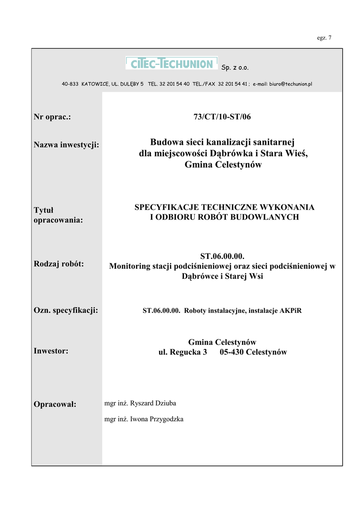 egz. 7 Sp. z o.o. 40-833 KATOWICE, UL. DULĘBY 5 TEL. 32 201 54 40 TEL./FAX 32 201 54 41 ; e-mail: [email protected] Nr oprac.: Nazwa inwestycji: 73/CT/10-ST/06 Budowa sieci kanalizacji sanitarnej dla miejscowości Dąbrówka i Stara Wieś, Gmina Celestynów Tytuł opracowania: SPECYFIKACJE TECHNICZNE WYKONANIA I ODBIORU ROBÓT BUDOWLANYCH Rodzaj robót: ST.06.00.00. Monitoring stacji podciśnieniowej oraz sieci podciśnieniowej w Dąbrówce i Starej Wsi Ozn. specyfikacji: Inwestor: Opracował: ST.06.00.00. Roboty instalacyjne, instalacje AKPiR Gmina Celestynów ul. Regucka 3 05-430 Celestynów mgr inŜ. Ryszard Dziuba mgr inŜ. Iwona Przygodzka egz. 1 Katowice, lipiec 2011 2 egz. 1 WYKAZ SPECYFIKACJI TECHNICZNYCH WYKONANIA I ODBIORU ROBÓT BUDOWLANYCH DLA INWESTYCJI: BUDOWA SIECI KANALIZACJI SANITARNEJ DLA MIEJSCOWOŚCI DĄBRÓWKA I STARA WIEŚ, GMINA CELESTYNÓW Lp. Nr specyfikacji 1. 2. Tytuł Nr opracowania ST.00.00.00 ST.01.00.00 ST.01.01.01 ST.01.01.02 ST.02.00.00 ST.02.01.01 ST.03.00.00 ST.03.01.01 ST.03.01.02 Wymagania ogólne Roboty przygotowawcze Wytyczenie trasy, obiektów i punktów wysokościowych Rozbiórka elementów dróg Roboty ziemne Wykonanie wykopów Roboty montaŜowe sieci kanalizacyjnych Kanalizacja podciśnieniowa w Dąbrówce i Starej Wsi Kanalizacja grawitacyjna i rurociągi tłoczne w Dąbrówce 73/CT/10-ST/00 73/CT/10-ST/01 4. ST.04.00.00 Adaptacja stacji podciśnieniowej przy ul. StraŜackiej 5 w Dąbrówce. Roboty budowlano - konstrukcyjne, roboty wykończeniowe, roboty inŜynieryjne 73/CT/10-ST/04 5. ST.05.00.00 73/CT/10-ST/05 6. ST.06.00.00 Urządzenia i wyposaŜenie technologiczne stacji podciśnieniowej Roboty montaŜowe (branŜa technologiczna) Monitoring stacji podciśnieniowej oraz sieci podciśnieniowej w Dąbrówce i Starej Wsi Roboty instalacyjne, instalacje AKPiR 7. ST.07.00.00 3. Odbudowa nawierzchni po wykonaniu sieci kanalizacji sanitarnej w Dąbrówce i Starej Wsi, gmina Celestynów Roboty budowlane 8. ST-E1 Zasilanie elektryczne przepompowni ścieków Pd1, Pd2, Pd3, Pd4, Pd5. Roboty instalacyjne, instalacje elektryczne ST-E1/01 Wymagania ogólne ST-E1/02 Szczegółowa specyfikacja techniczna 9. ST-E2 Adaptacja stacji podciśnieniowej przy ul. StraŜackiej 5 w Dąbrówce. Instalacje elektryczne siły i oświetlenia. Roboty instalacyjne, instalacje elektryczne ST-E2/01 Wymagania ogólne ST-E2/02 Przyłącze energii elektrycznej ST-E2/03 Instalacje elektryczne siły i oświetlenia 10. ST-E3 Zasilanie elektryczne wzmacniaczy sygnału monitoringowego WS-1, WS-2, WS-3, WS-4, WS-5 WS-6, WS7 Roboty instalacyjne, instalacje elektryczne ST-E3/01 Wymagania ogólne ST-E3/02 Szczegółowa specyfikacja techniczna 73/CT/10-ST/02 73/CT/10-ST/03 73/CT/10-ST/06 73/CT/10-ST/07 73/CT/10-ST/E1 73/CT/10-ST/E2 73/CT/10-ST/E3 3 egz. 1 SPIS TREŚCI Monitoring stacji podciśnieniowej i sieci podciśnieniowej w Dąbrówce i Starej Wsi 1. WSTĘP............................................................................................................................. 5 1.1 1.2 1.3 1.4 1.5 Przedmiot Specyfikacji Technicznej................................................................................ 5 Zakres stosowania Specyfikacji Technicznej................................................................... 5 Zakres robót objętych Specyfikacją Techniczną.............................................................. 5 Określenia podstawowe ................................................................................................... 5 Wymagania ogólne dotyczące Robót ............................................................................... 6 2. 2.1 2.2 2.2.1 2.2.2 2.2.3 2.2.4 2.2.5 2.2.6 2.2.7 2.2.8 2.3 WYMAGANE PARAMETRY URZĄDZEŃ I WYPOSAśENIA ................................. 6 Wymagania ogólne........................................................................................................... 6 Szczegółowe parametry urządzeń i wyposaŜenia. ........................................................... 6 Kable do monitoringu przewodowego ............................................................................. 6 Moduł transmisji danych.................................................................................................. 6 Moduł Master................................................................................................................... 7 Wzmacniacz sygnału monitoringowego .......................................................................... 7 Sterownik PLC stacji podciśnieniowej ............................................................................ 7 Serwer lokalny w stacji podciśnieniowej ....................................................................... 10 Oprogramowanie wizualizacyjne na serwerze lokalnym stacji podciśnieniowej .......... 10 Baza danych i dystrybucja danych ................................................................................. 10 Zestawienie elementów i wyposaŜenia dla systemu monitoringu kanalizacji podciśnieniowej w Dąbrówce przy ulicy StraŜackiej 5.................................................. 12 3. SPRZĘT ......................................................................................................................... 13 4. TRANSPORT ................................................................................................................ 13 5. WYKONANIE ROBÓT ................................................................................................ 13 6. KONTROLA JAKOŚCI ROBÓT.................................................................................. 14 7. ODBIÓR ROBÓT .......................................................................................................... 14 8. OBMIAR ROBÓT ......................................................................................................... 14 9. PODSTAWA PŁATNOŚCI.......................................................................................