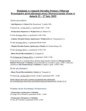 Działania w ramach Ośrodka Pomocy Ofiarom Przestępstw prowadzonego przez Stowarzyszenie Ovum w dniach 23 – 27 luty 2015 Dyżur prawników: - Sąd Rejonowy w Gdyni (Plac Konstytucji 5, pokój 109). W dniach 23 – 27 luty 2015 r. w godzinach 9:00 – 13:00 - Prokuratura Rejonowa w Wejherowie (ul. Hallera 21). W dniu 26 lutego 2015 r. w godzinach 12:00-14:00 - Gminny Ośrodek Pomocy Społecznej w Wejherowie (ul. Transportowa 1). W dniu 26 lutego 2015 r. w godzinach 08:00-10:00 - Miejski Ośrodek Pomocy Społecznej w Redzie (ul. Derdowskiego 25). W dniu 26 lutego 2015 r. w godzinach 15:30-17:30 - Biuro Porad Obywatelskich (ul. Traugutta 2) Od 23 lutego do 27 lutego 2015 r. w godzinach 14:00 -17:00 Porad prawnych w siedzibie Biura udzielać będą ponadto członkowie Okręgowej Izby Radców Prawnych w Gdańsku (od poniedziałku do czwartku w godz. 14:00-17:00) oraz członkowie Izby Komorniczej w Gdańsku (w piątek w godz. 14:00-17:00). Dyżur psychologów: - Biuro Porad Obywatelskich w Gdyni (ul. Traugutta 2) W dniach 24 – 25 luty 2015 (wtorek i środa) w godzinach 9.00 – 12.00. Osoby chcące skorzystać z pomocy psychologicznej zapraszamy do wcześniejszego umówienia się telefonicznego pod numerem tel. 58 661 31 51 Wspólny dyżur Psychologa i Prokuratora: - Prokuratura Apelacyjna w Gdańsku 24 lutego 2015 (wtorek) w godzinach 10:00 – 14:00 - Prokuratura Okręgowa w Gdańsku 25 luty 2015 (środa) w godzinach 10:00 -13:00 Stowarzyszenie Pomorskie Centrum TerapeutycznoPrawne „Interios” 1. Ośrodek w Gdyni – siedziba Stowarzyszenia ul. Śląska 53, 81-304, pok. 407 – poniedziałek 23.02.2015; godz. 10-15 - sobota 28.02.2015; godz. 10-13 2. Ośrodek w Kwidzynie ul. Chopina 26 82-500 - poniedziałek 23.02.2015; godz. 10-12 3. Ośrodek w Tczewie ul. Obrońców Westerplatte 6 83-110 (siedziba Fundacji „Pokolenia”) - wtorek 24.02.2015 r; godz. 13-16 Zespół Interdyscyplinarny w Gdańsku Serdecznie zapraszamy do korzystania z porad: od poniedziałku 23 lutego do piątku 27 lutego br., w godzinach 14.0018.00. Gdańsk Wrzeszcz, ul. Piramowicza ½ Dyżury specjalistów 23-27.02.15 poniedziałek 23.02 wtorek x x 24.02 środa 25.02 czwartek 26.00 piątek x x x 14.00-16.00 radca prawny OIRP adwokat ORA prokurator PA x x x x x komornik IK x x x x x Policja KMP x x x x x Straż Graniczna MOSG x x rzecznik praw obywatelskich BRPO kurator pracownik socjalny członek gdańskiego ZI inne SO x MOPR ZI x x x x x x x x x 27.02 centrum wsparcia imigrantów mediator 16.00-18.00 CWII FISO radca prawny OIRP adwokat ORA prokurator komornik x x x x x PA IK x x x x x x x x x x Policja KMP x x x x x Straż Graniczna MOSG x x rzecznik praw obywatelskich BRPO kurator pracownik socjalny członek gdańskiego ZI Mediator centrum wsparcia imigrantów SO x MOPR ZI x FISO x x x x x x x x