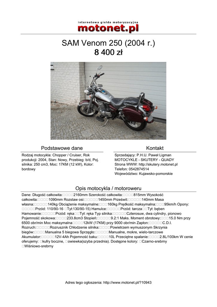 SAM Venom 250 (2004 r.) 8 400 zł Podstawowe dane Rodzaj motocykla: Chopper / Cruiser, Rok produkcji: 2004, Stan: Nowy, Przebieg: b/d, Poj. silnika: 250 cm3, Moc: 17KM (12 kW), Kolor: bordowy Kontakt Sprzedający: P.H.U. Paweł Ligman MOTOCYKLE - SKUTERY - QUADY Strona WWW: http://skutery.motonet.pl Telefon: 0542874514 Województwo: Kujawsko-pomorskie Opis motocykla / motoroweru Dane: Długość całkowita: 2160mm Szerokość całkowita: 815mm Wysokość całkowita: 1090mm Rozstaw osi: 1450mm Prześwit: 140mm Masa własna: 140kg Obciążenie maksymalne: 160kg Prędkość maksymalna: 95km/h Opony: Przód: 110/90-16 Tył:130/90-15) Hamulce: Przód: tarcza Tył: bęben Hamowanie: Przód: ręka Tył: ręka Typ silnika: Czterosuw, dwa cylindry, pionowo Pojemność skokowa: 233.8cm3 Stopień: 9.2:1 Maks. Moment obrotowy: 15.0 Nm przy 6500 obr/min Moc maksymalna 12kW (17KM) przy 9000 obr/min Zapłon: C.D.I. Rozruch: Rozrusznik Chłodzenie silnika: Powietrzem wymuszonym Skrzynia biegów: Manualna 5 biegowa Sprzęgło: Manualne, mokre, wielo-tarczowe Akumulator: 12V-4Ah Pojemność baku: 10L Przeciętne spalanie: 2.8L/100km W cenie oferujemy: kufry boczne, owiewka(szyba przednia). Dostępne kolory: Czarno-srebrny Wiśniowo-srebrny Adres tego ogłoszenia: http://www.motonet.pl/?10943
