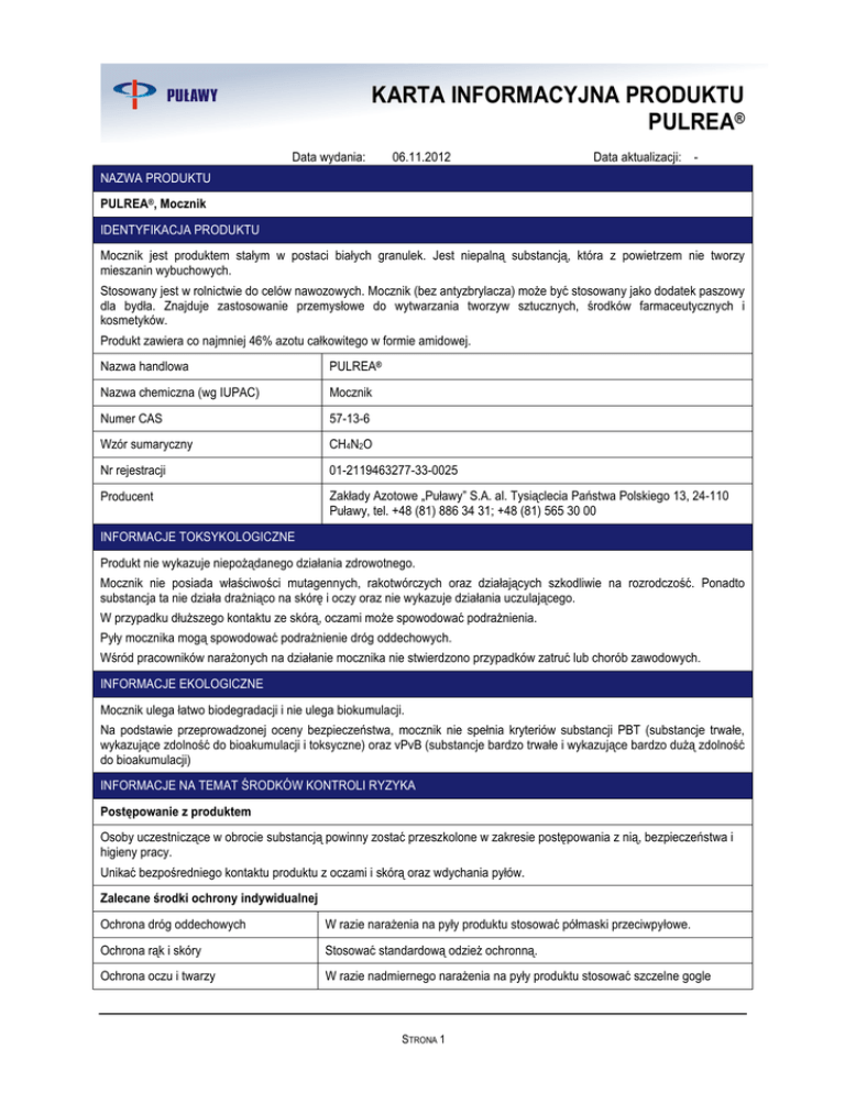 KARTA INFORMACYJNA PRODUKTU PULREA® Data wydania: 06.11.2012 Data aktualizacji: - NAZWA PRODUKTU PULREA®, Mocznik IDENTYFIKACJA PRODUKTU Mocznik jest produktem stałym w postaci białych granulek. Jest niepalną substancją, która z powietrzem nie tworzy mieszanin wybuchowych. Stosowany jest w rolnictwie do celów nawozowych. Mocznik (bez antyzbrylacza) może być stosowany jako dodatek paszowy dla bydła. Znajduje zastosowanie przemysłowe do wytwarzania tworzyw sztucznych, środków farmaceutycznych i kosmetyków. Produkt zawiera co najmniej 46% azotu całkowitego w formie amidowej. Nazwa handlowa PULREA® Nazwa chemiczna (wg IUPAC) Mocznik Numer CAS 57-13-6 Wzór sumaryczny CH4N2O Nr rejestracji 01-2119463277-33-0025 Producent Zakłady Azotowe „Puławy” S.A. al. Tysiąclecia Państwa Polskiego 13, 24-110 Puławy, tel. +48 (81) 886 34 31; +48 (81) 565 30 00 INFORMACJE TOKSYKOLOGICZNE Produkt nie wykazuje niepożądanego działania zdrowotnego. Mocznik nie posiada właściwości mutagennych, rakotwórczych oraz działających szkodliwie na rozrodczość. Ponadto substancja ta nie działa drażniąco na skórę i oczy oraz nie wykazuje działania uczulającego. W przypadku dłuższego kontaktu ze skórą, oczami może spowodować podrażnienia. Pyły mocznika mogą spowodować podrażnienie dróg oddechowych. Wśród pracowników narażonych na działanie mocznika nie stwierdzono przypadków zatruć lub chorób zawodowych. INFORMACJE EKOLOGICZNE Mocznik ulega łatwo biodegradacji i nie ulega biokumulacji. Na podstawie przeprowadzonej oceny bezpieczeństwa, mocznik nie spełnia kryteriów substancji PBT (substancje trwałe, wykazujące zdolność do bioakumulacji i toksyczne) oraz vPvB (substancje bardzo trwałe i wykazujące bardzo dużą zdolność do bioakumulacji) INFORMACJE NA TEMAT ŚRODKÓW KONTROLI RYZYKA Postępowanie z produktem Osoby uczestniczące w obrocie substancją powinny zostać przeszkolone w zakresie postępowania z nią, bezpieczeństwa i higieny pracy. Unikać bezpośredniego kontaktu produktu z oczami i skórą oraz wdychania pyłów. Zalecane środki ochrony indywidualnej Ochrona dróg oddechowych W razie narażenia na pyły produktu stosować półmaski przeciwpyłowe. Ochrona rąk i skóry Stosować standardową odzież ochronną. Ochrona oczu i twarzy W razie nadmiernego narażenia na pyły produktu stosować szczelne gogle STRONA 1 KARTA INFORMACYJNA PRODUKTU PULREA® Data wydania: ochronne. 06.11.2012 Data aktualizacji: - MAGAZYNOWANIE Ze względu na higroskopijność mocznik należy przechowywać w czystych i suchych budynkach magazynowych lub pod wiatami w stosach do wysokości 12 warstw worków wg PN-C-87001:1998 p. 4.2.1., 4.2.2., 4.2.3. Kontenery elastyczne typu big-bag o masie nie przekraczającej 500kg można przechowywać w stosach złożonych z trzech warstw, powyżej 500 kg należy magazynować w stosach złożonych maksymalnie z dwóch warstw. Mocznik luzem należy przechowywać w pryzmach w zadaszonych magazynach. Nieprzestrzeganie powyższych zasad może spowodować zbrylanie się mocznika. TRANSPORT Mocznik nawozowy należy przewozić krytymi środkami transportowymi zgodnie z PN-C-87001:1998 p. 5.1., 5.2. oraz obowiązującymi przepisami transportowymi. W każdym przypadku środki transportu powinny być czyste i suche. Produkt nie podlega przepisom RID i ADR. WYMAGANIA PRAWNE Zezwolenia: Produkt nie wymaga zezwolenia zgodnie z przepisami tytułu VII Rozporządzenia WE nr 1907/2006. Ograniczenia: Względem produktu nie zostały zastosowane żadne ograniczenia dotyczące produkcji, wprowadzania do obrotu i stosowania zgodnie z przepisami tytułu VIII Rozporządzenia WE nr 1907/2006. Inne wymagania: W rozumieniu art. 31 Rozporządzenia WE nr 1907/2006 produkt nie jest substancją, która spełnia kryteria klasyfikujące je jako niebezpieczną, w związku z czym produkt nie jest objęty obowiązkiem sporządzania karty charakterystyki. Niniejsza karta informacyjna spełnia wymagania art. 32 Rozporządzenia WE nr 1907/2006. Dla produktu nie zostały określone w Unii Europejskiej najwyższe dopuszczalne stężenia w środowisku pracy. INFORMACJE DODATKOWE Puławski Mocznik jest produktem wysokiej jakości. Posiada certyfikat wydany przez Polskie Centrum Badań i Certyfikacji uprawniający do oznaczania wyrobu znakiem jakości Q. Produkt spełnia wymagania Rozporządzenia WE nr 2003/2003 w sprawie nawozów i posiada oznakowanie: NAWÓZ WE (Certyfikat zgodności wydany przez Polskie Centrum Badań i Certyfikacji). STRONA 2