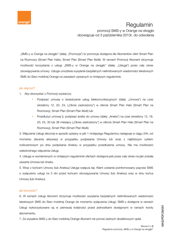 Regulamin promocji SMS-y w Orange na okrągło obowiązuje od 3 października 2013r. do odwołania „SMS-y w Orange na okrągło” (dalej: „Promocja”) to promocja dostępna dla Abonentów ofert Smart Plan na Rozmowy (Smart Plan Halo), Smart Plan (Smart Plan Multi). W ramach Promocji Abonent otrzymuje możliwość korzystania z usługi „SMS-y w Orange na okrągło” (dalej: „Usługa”) przez cały okres obowiązywania umowy. Usługa umożliwia wysyłanie bezpłatnych nielimitowanych wiadomości tekstowych SMS do Sieci mobilnej Orange na zasadach opisanych w niniejszym regulaminie. jak włączyć? 1. Aby skorzystać z Promocji wystarczy: Podpisać umowę o świadczenie usług telekomunikacyjnych (dalej: „Umowa”) na czas określony 12, 20, 24, („Okres zastrzeżony”) w ofercie Smart Plan Halo (Smart Plan na Rozmowy), Smart Plan (Smart Plan Multi) lub Przedłużyć umowę tj. podpisać aneks do umowy (dalej: „Aneks”) na czas określony 12, 16, 20, 24, 30 lub 36 miesięcy („Okres zastrzeżony”) w ofercie Smart Plan Halo (Smart Plan na Rozmowy), Smart Plan (Smart Plan Multi). 3. Włączenie Usługi zleconej w sposób opisany w pkt 1 niniejszego Regulaminu następuje w ciągu 24h, od momentu zlecenia aktywacji w przypadku podpisania Umowy lub wraz z najbliższym cyklem rozliczeniowym po dniu podpisania Aneksu w przypadku przedłużenia umowy. Nie ma możliwości wielokrotnego włączenia Usługi. 4. Usługa w wymienionych w niniejszym regulaminie ofertach dostępna jest przez cały okres na jaki została zawarta Umowa lub Aneks. 5. Wraz z końcem Umowy (lub Aneksu) Usługa wyłącza się. Klient zostanie poinformowany poprzez SMS o wyłączeniu usługi na 3 dni przed końcem obowiązywania Umowy (lub Aneksu) oraz w dniu końca Umowy (lub Aneksu). jak korzystać? 6. W ramach Usługi Abonent otrzymuje możliwość wysyłania bezpłatnych nielimitowanych wiadomości Usługi wykorzystywane są w pierwszej kolejności przed jednostkami dostępnymi w ramach kwoty abonamentu. 7. Za wysyłane SMS-y do Sieci mobilnej Orange Abonent nie ponosi żadnych dodatkowych opłat. Strona 1 z 3 Regulamin promocji „SMS-y w Orange na okrągło” MAS/PDF28/091 3 tekstowych SMS do Sieci mobilnej Orange do momentu wyłączenia Usługi. SMS-y dostępne w ramach dodatkowe informacje 8. W ramach Usługi „SMS-y w Orange na okrągło” Abonent może wysyłać nielimitowane wiadomości tekstowe do Sieci mobilnej Orange, z wyjątkiem numerów skróconych, numerów specjalnych określonych w Cenniku usług w ofertach Smart Plan na Rozmowy, Smart Plan, Smart Plan Mix, numerów oraz SMSów wysyłanych na numery zagraniczne i w roamingu. 9. W przypadku dezaktywacji Usługi przez Klienta ponowne jej włączenie spowoduje rozpoczęcie naliczania opłaty za korzystanie z Usługi w wysokości 25zł miesięcznie. 10. Usługa nie działa w roamingu. 11. Usługa może być w dowolnym czasie odwołana lub zmieniona przez PTK Centertel sp. z o.o, co nie powoduje utraty lub zmiany korzyści przyznanych Abonentowi przed zmianą lub odwołaniem Usługi. 12. Mając włączoną Usługę, można również korzystać z innych promocji oraz usług promocyjnych dostępnych w ofercie Smart Plan na Rozmowy, Smart Plan chyba, że regulaminy tych promocji lub usług stanowią inaczej. 13. W ramach Promocji Abonent zobowiązuje się: a. nie generować sztucznego ruchu telekomunikacyjnego, to jest w szczególności ruchu nie służącego wymianie informacji, ruchu którego wyłącznym celem jest uzyskiwanie pewnej puli (liczby lub czasu trwania) połączeń telekomunikacyjnych zarówno w Sieci mobilnej Orange jak i pomiędzy Siecią mobilną Orange, a innymi sieciami telekomunikacyjnymi; b. nie używać karty SIM w systemach i urządzeniach służących do zautomatyzowanego przesyłania danych pomiarowych lub zdalnego sterowania, w tym w systemach monitoringu osób, budynków, pojazdów (tzw. rozwiązania telemetryczne) lub do generowania ruchu maszynowego (ruchu typu „maszyna do maszyny” lub „maszyna do Abonenta”); c. nie używać Karty SIM do rozsyłania dużej ilości informacji o jednakowej treści, w szczególności informacji przeznaczonych bezpośrednio lub pośrednio do promowania towarów, usług lub wizerunku Abonenta, a także służących do osiągnięcia efektu handlowego. 14. PTK Centertel zastrzega sobie prawo do natychmiastowego ograniczenia świadczenia usług w przypadku stwierdzenia któregokolwiek z zachowań opisanych w pkt 12. oraz gdy do PTK Centertel wpłyną skargi innych abonentów w związku z otrzymywaniem SMS-ów SPAM-ów z numeru Abonenta. 15. Niniejszy regulamin jest dostępny na stronie www.orange.pl oraz w salonach Orange i salonach partner Orange. 16. Włączenie Usługi jest jednoznaczne z akceptacją niniejszego regulaminu. 17. W pozostałym zakresie do Usługi stosuje się obowiązujące Abonenta: Ogólne warunki świadczenia w ofertach Smart Plan na Rozmowy, Smart Plan, Smart Plan Mix oraz Regulamin świadczenia usług telekomunikacyjnych w sieci telekomunikacyjnej GSM 900/1800 i UMTS przez spółkę pod firmą Polska Telefonia Komórkowa Centertel Spółka z ograniczoną odpowiedzialnością. Strona 2 z 3 Regulamin promocji „SMS-y w Orange na okrągło” MAS/PDF28/091 3 usług telekomunikacyjnych w ofertach Smart Plan na Rozmowy, Smart Plan, Smart Plan Mix, Cennik usług 18. „Sieć mobilna Orange” oznacza sieć o nazwie Orange w Polsce, której operatorem jest Polska Telefonia Komórkowa- Centertel spółka z o.o. z siedzibą w Warszawie, adres: ul. Skierniewicka 10 a, 01230 Warszawa, zarejestrowana w rejestrze przedsiębiorców prowadzonym przez Sąd Rejonowy dla m.st. Warszawy, XII Wydział Gospodarczy Krajowego Rejestru Sądowego pod numerem KRS 0000006107, o kapitale zakładowym 2.690.501.964,00 PLN i numerze NIP 527-020-68-72. Pojęcie „sieć Orange” nie obejmuje połączeń na numery przedsiębiorców telekomunikacyjnych świadczących usługi w oparciu o St